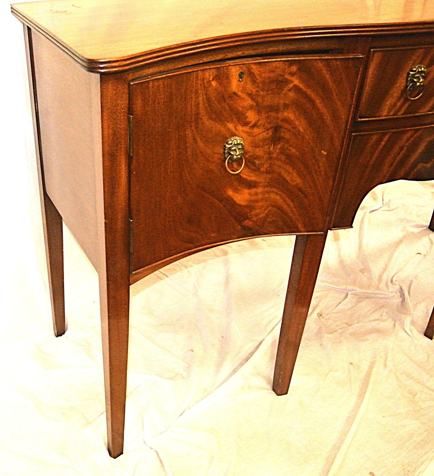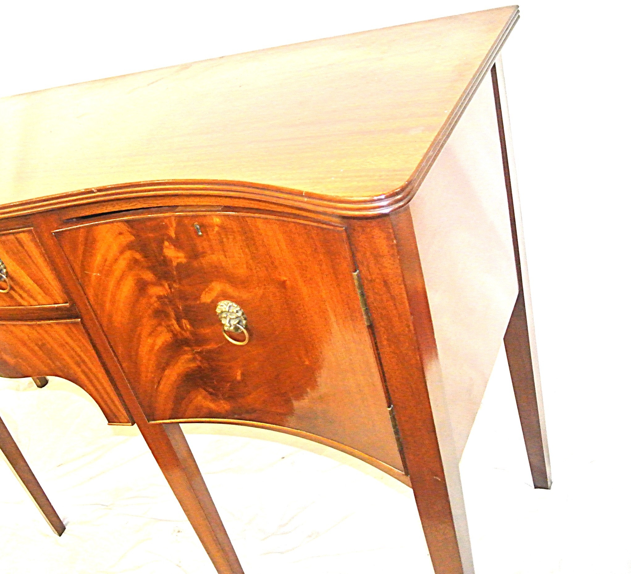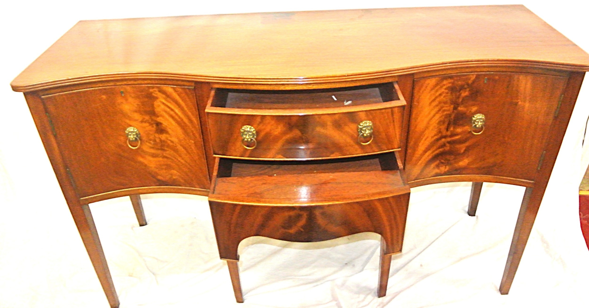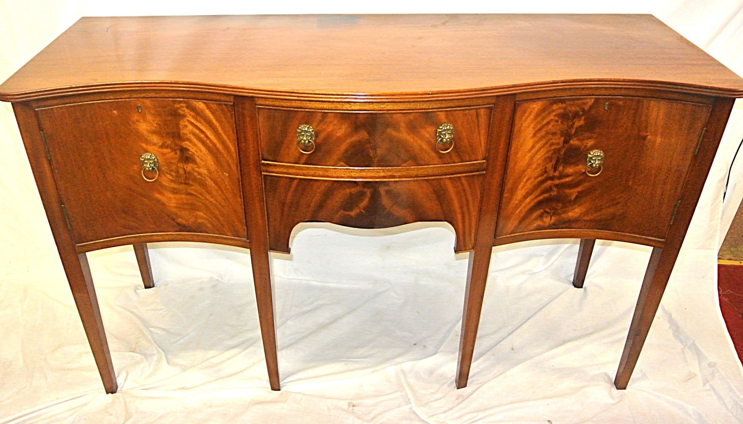 Edwardian design serpentine fronted sideboard with reeded rims, central drawer, pull out shelf, 2 side presses, lion mask drop handles, on tapering legs