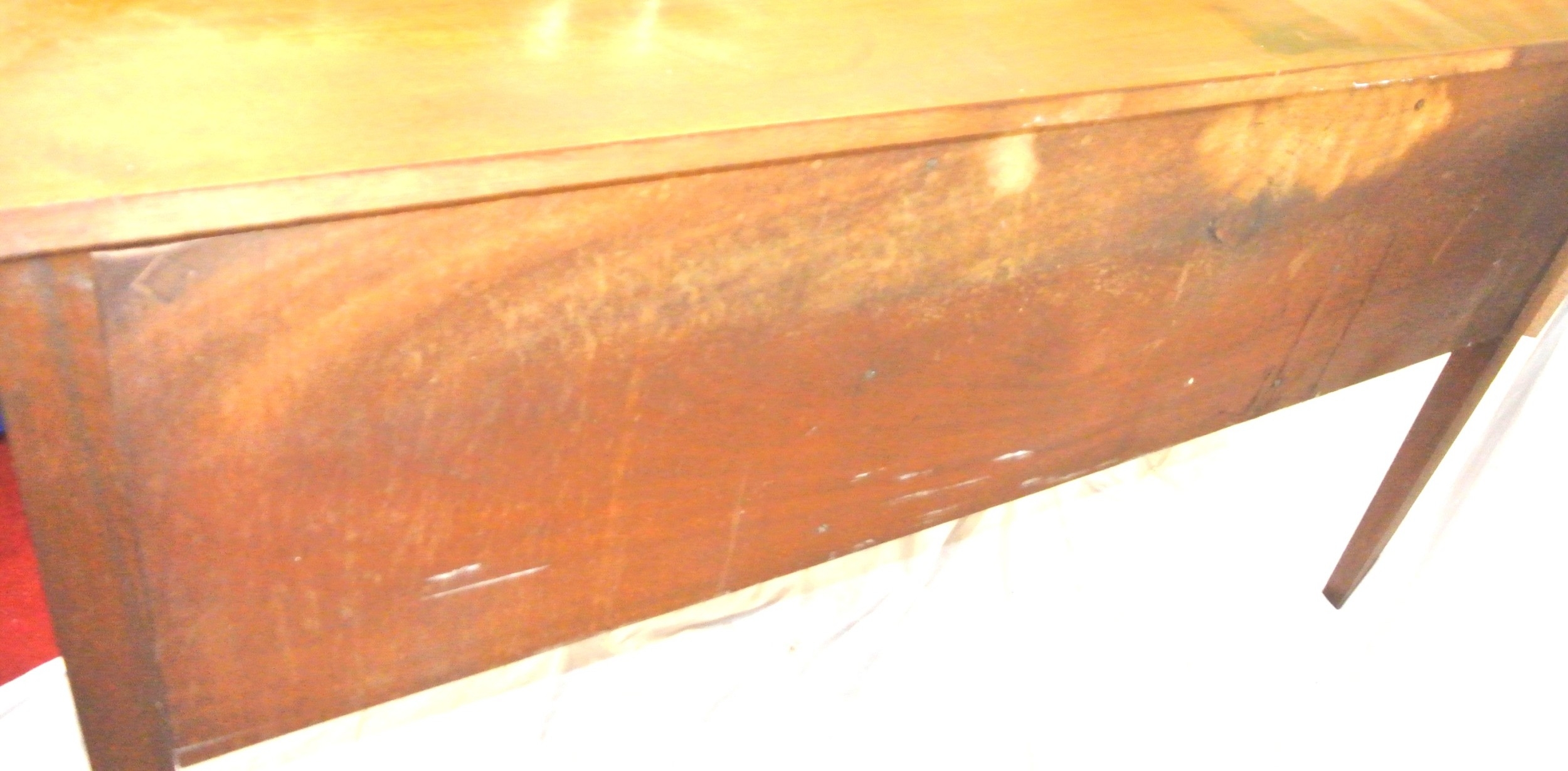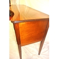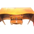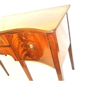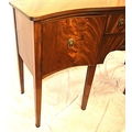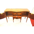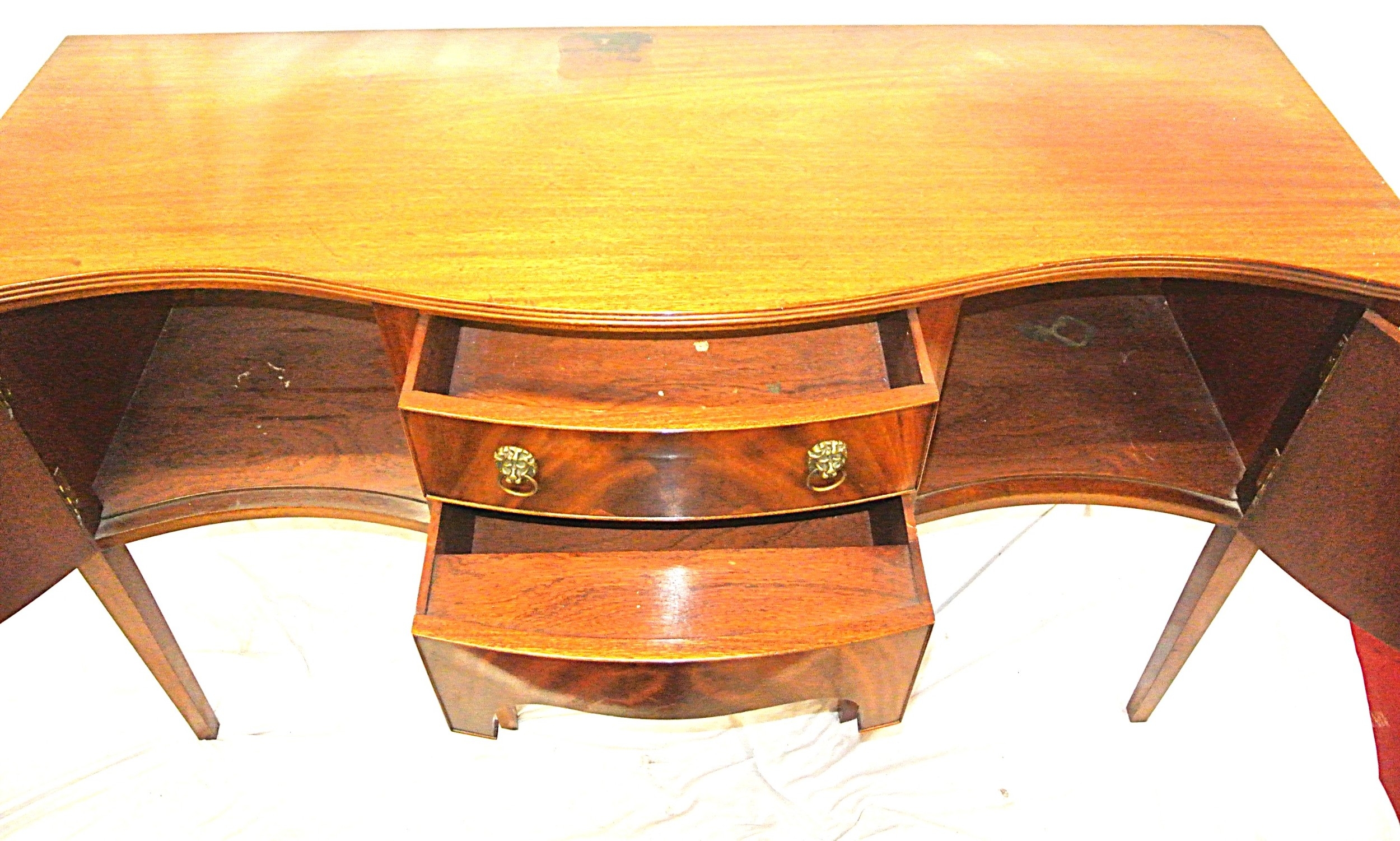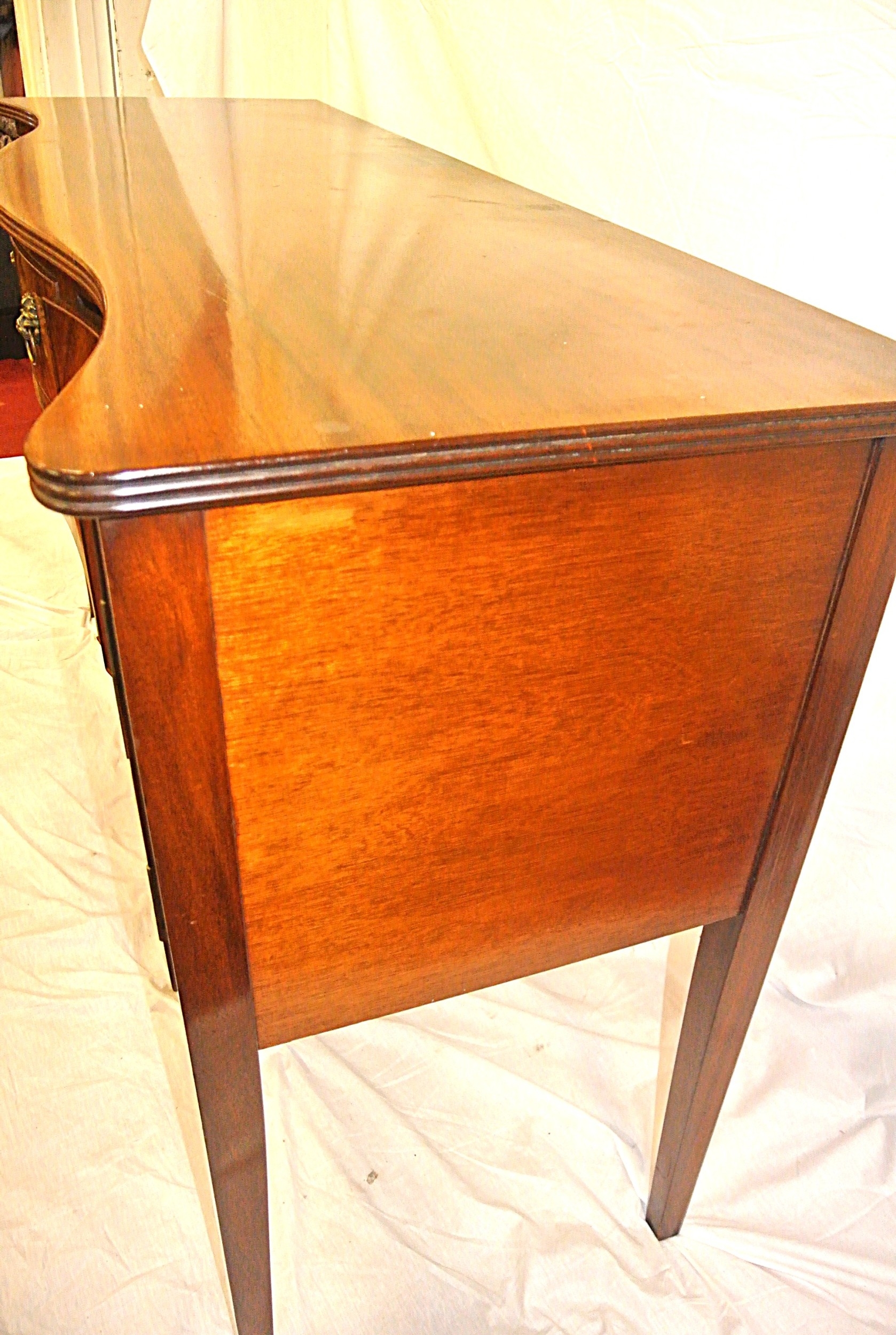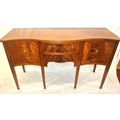 Edwardian design serpentine fronted sideboard with reeded rims, central drawer, pull out shelf, 2 side presses, lion mask drop handles, on tapering legs