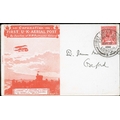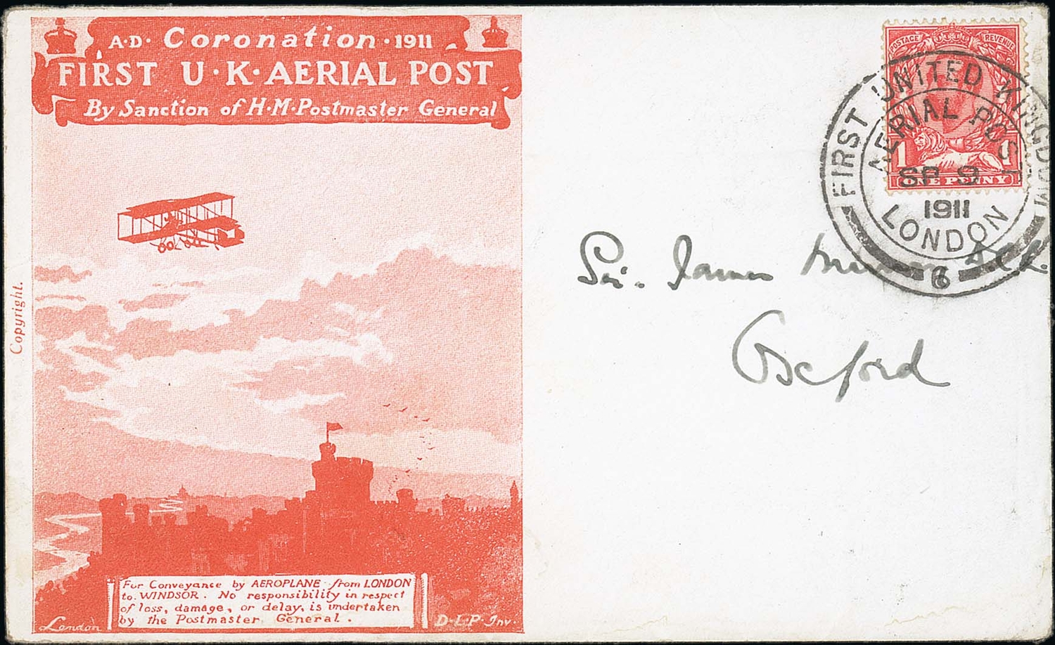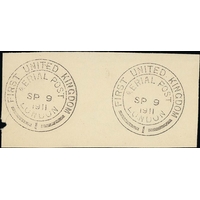 1911 (Sep 9) Envelope proof in an unissued red colour, the monogram omitted from the reverse, with enclosed notepaper printed in a similar red colour on light blue paper, the letter written from Hendon Aerodrome. Addressed to "Sir James Murray, Oxford", franked KGV 1d tied by the London Aerial Post c.d.s code 6, used at Hendon Aerodrome, marked inside the flap "arrived at Oxford 15 Sept 1911", flown on one of the two Sept. 14th flights. A very scarce postally used envelope proof. Photo on Page 10.