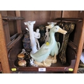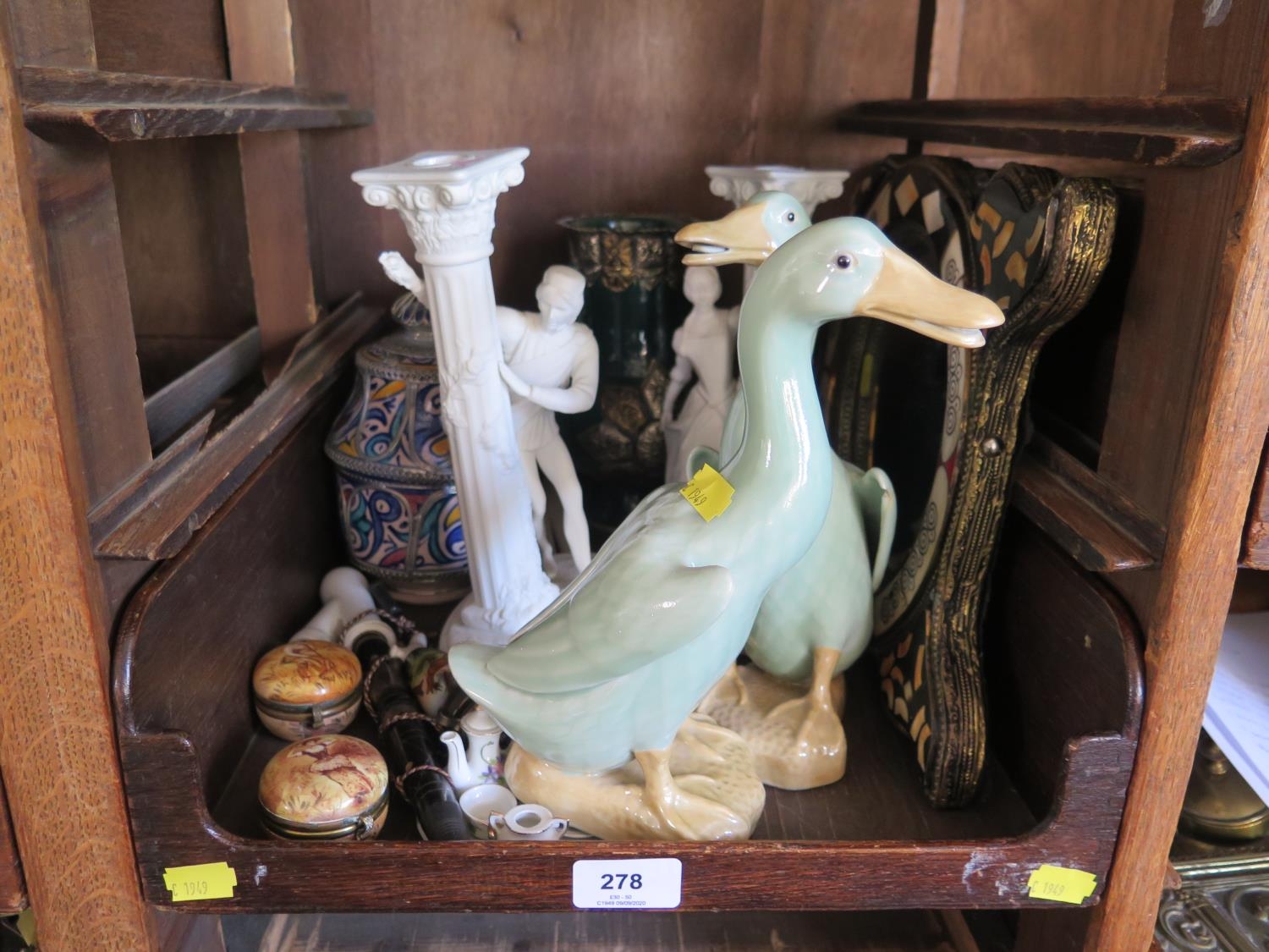 A pair of modern Chinese celadon figures of geese, 24 cm high, a pair of Franklin Mint Romeo and Juliet candlesticks, and various ornaments including filigree mounted jars and vases