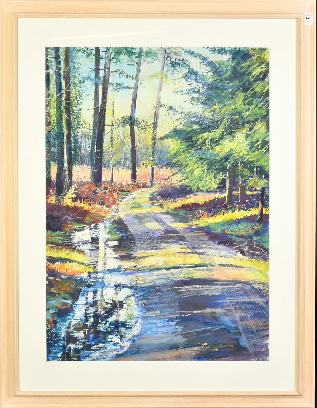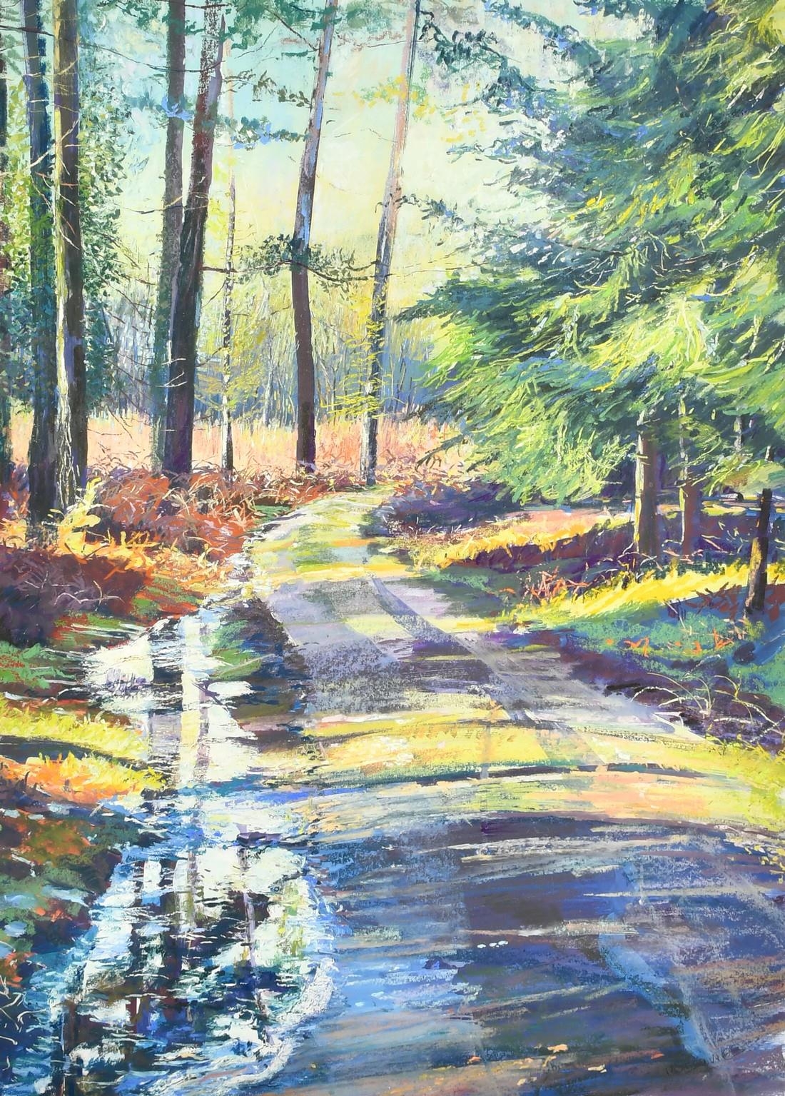 Maureen Davies, 'Winter Track', a track through a woodland glade, pastel, signed in pencil, 32" x 22.5" (81 x 57cm).