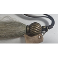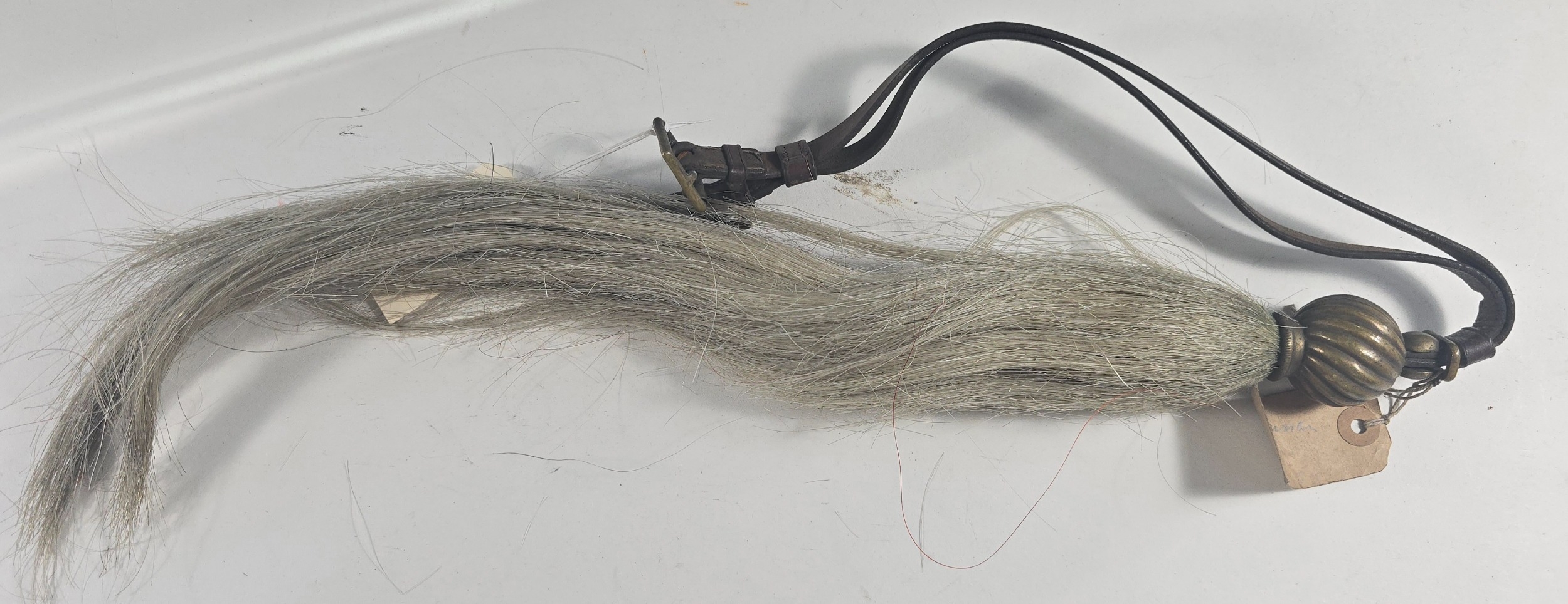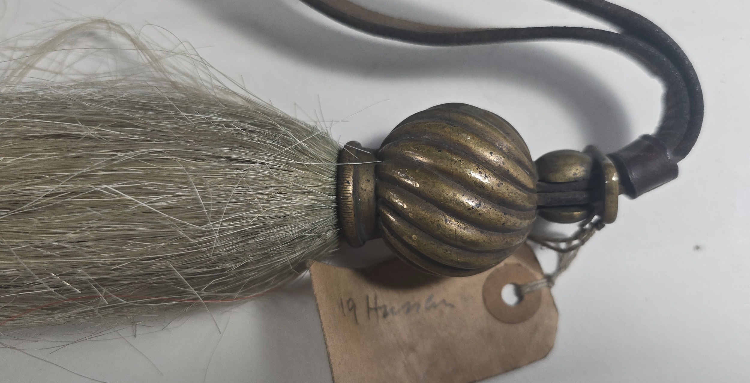 A Cavalry white horse hair Throat Plume of the 19th Hussars, with spiral spherical brass mount and long leather strap. GC