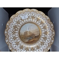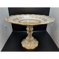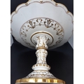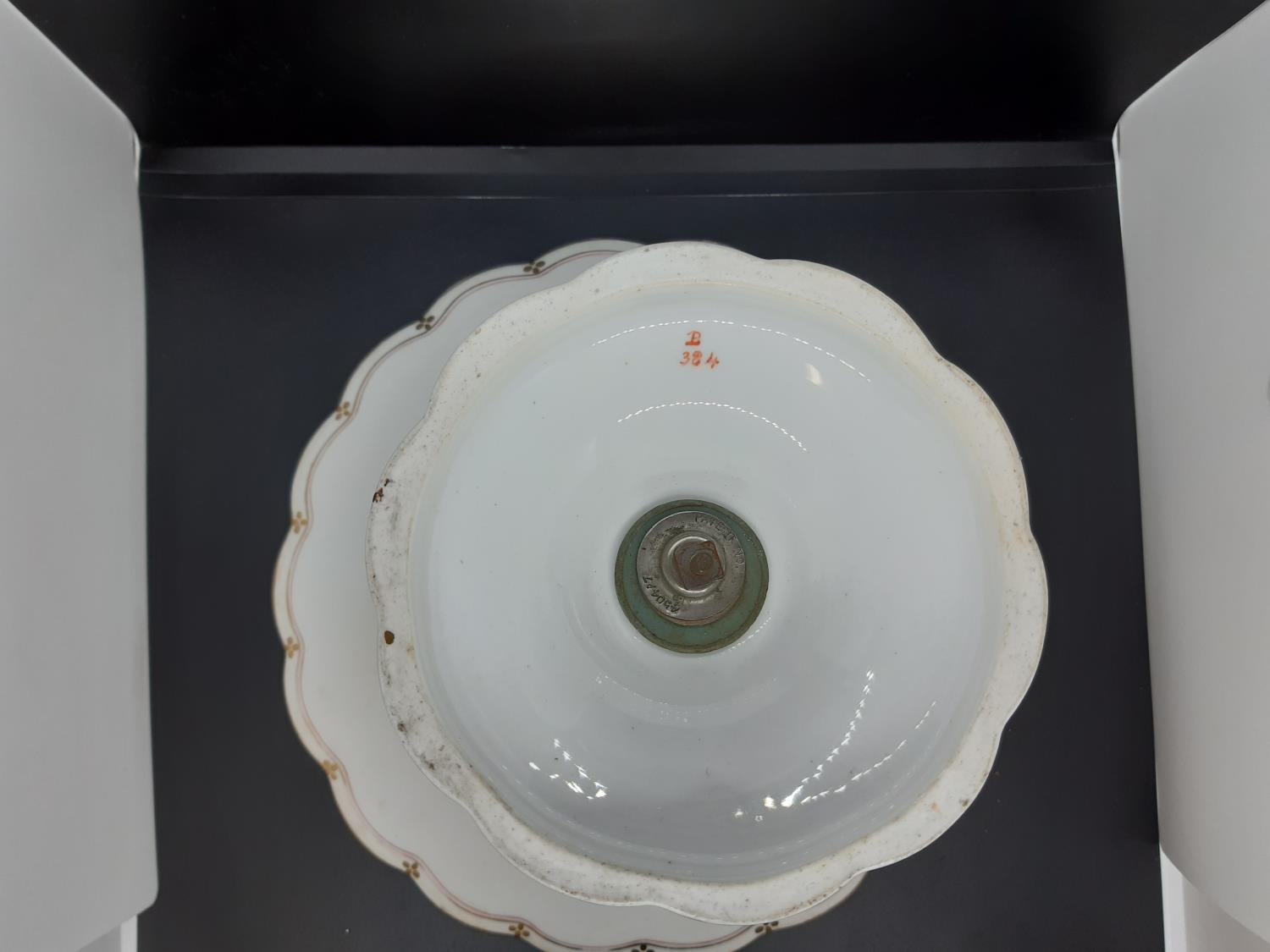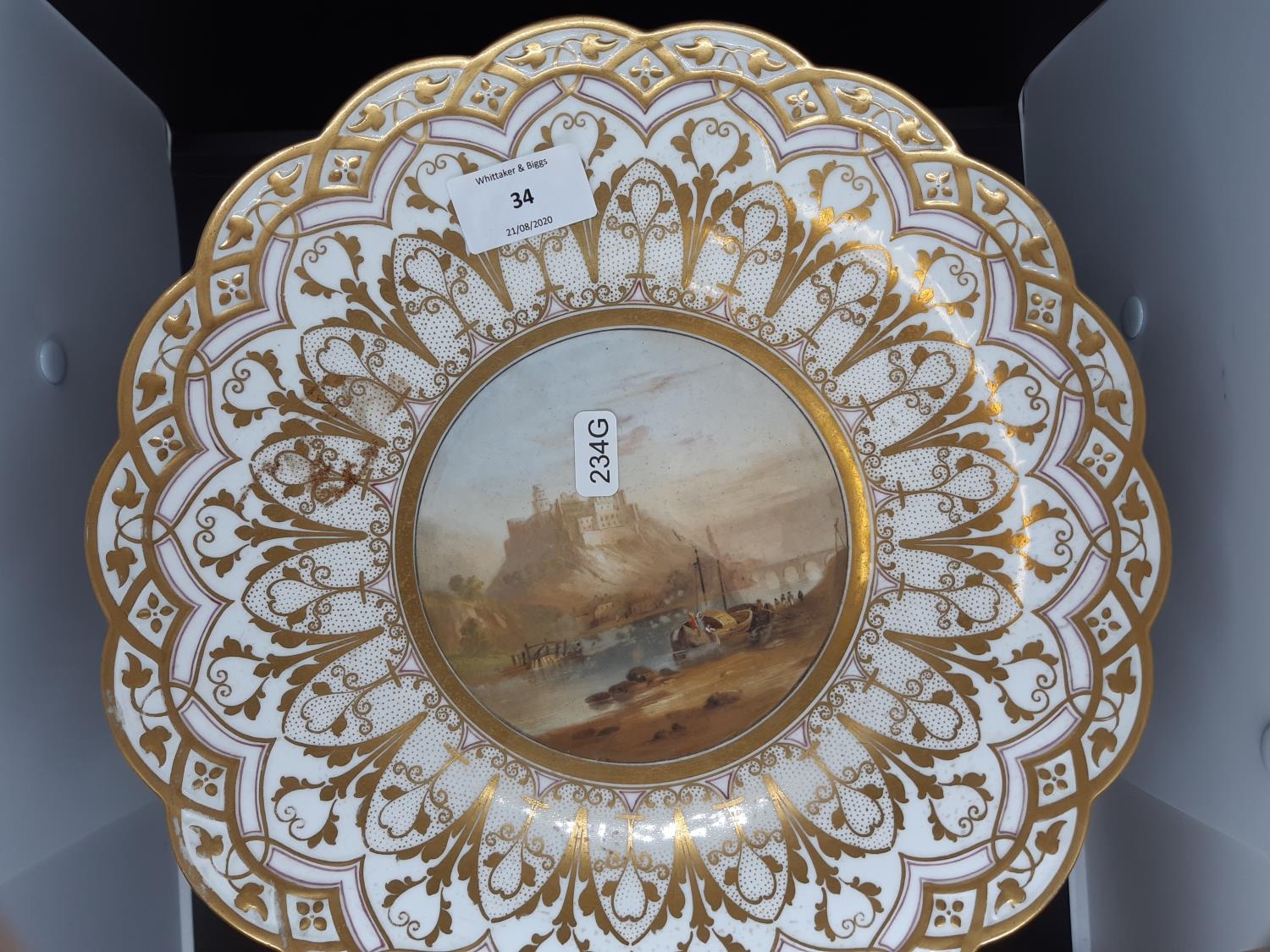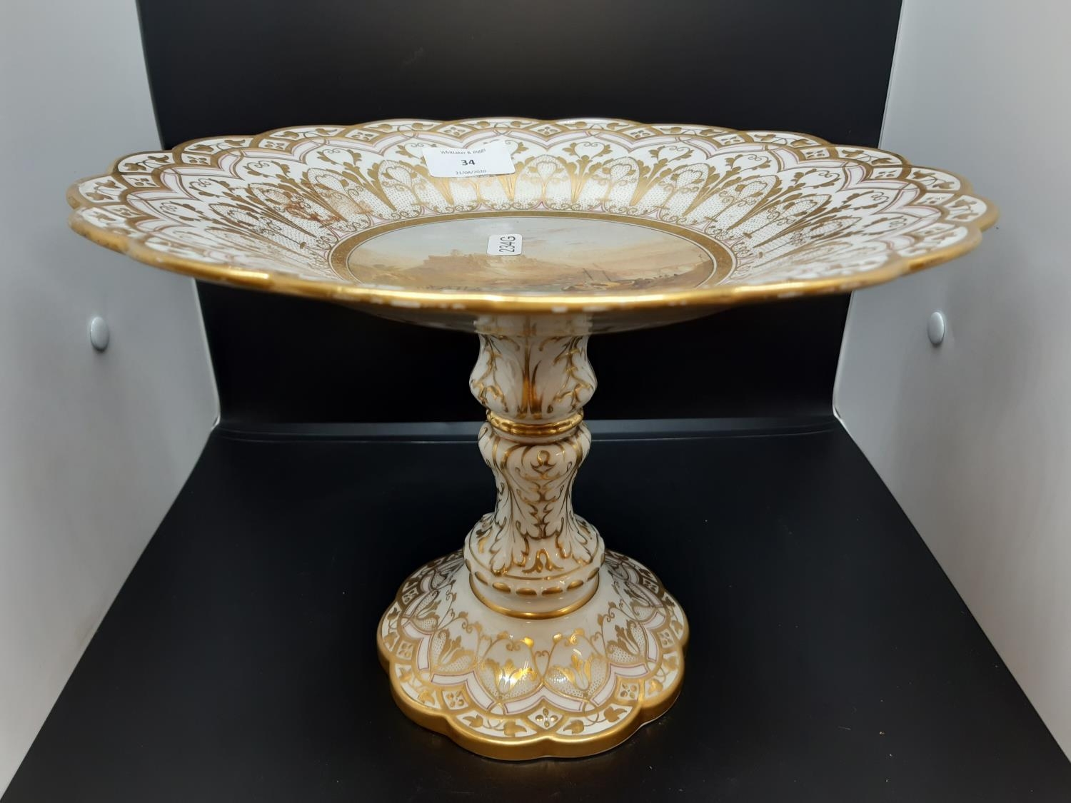 An English porcelain table centrepiece with white ground and well detailed repeated gilded design with central castle with moat and viaduct design, unsigned with underlined “P384” mark to base