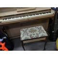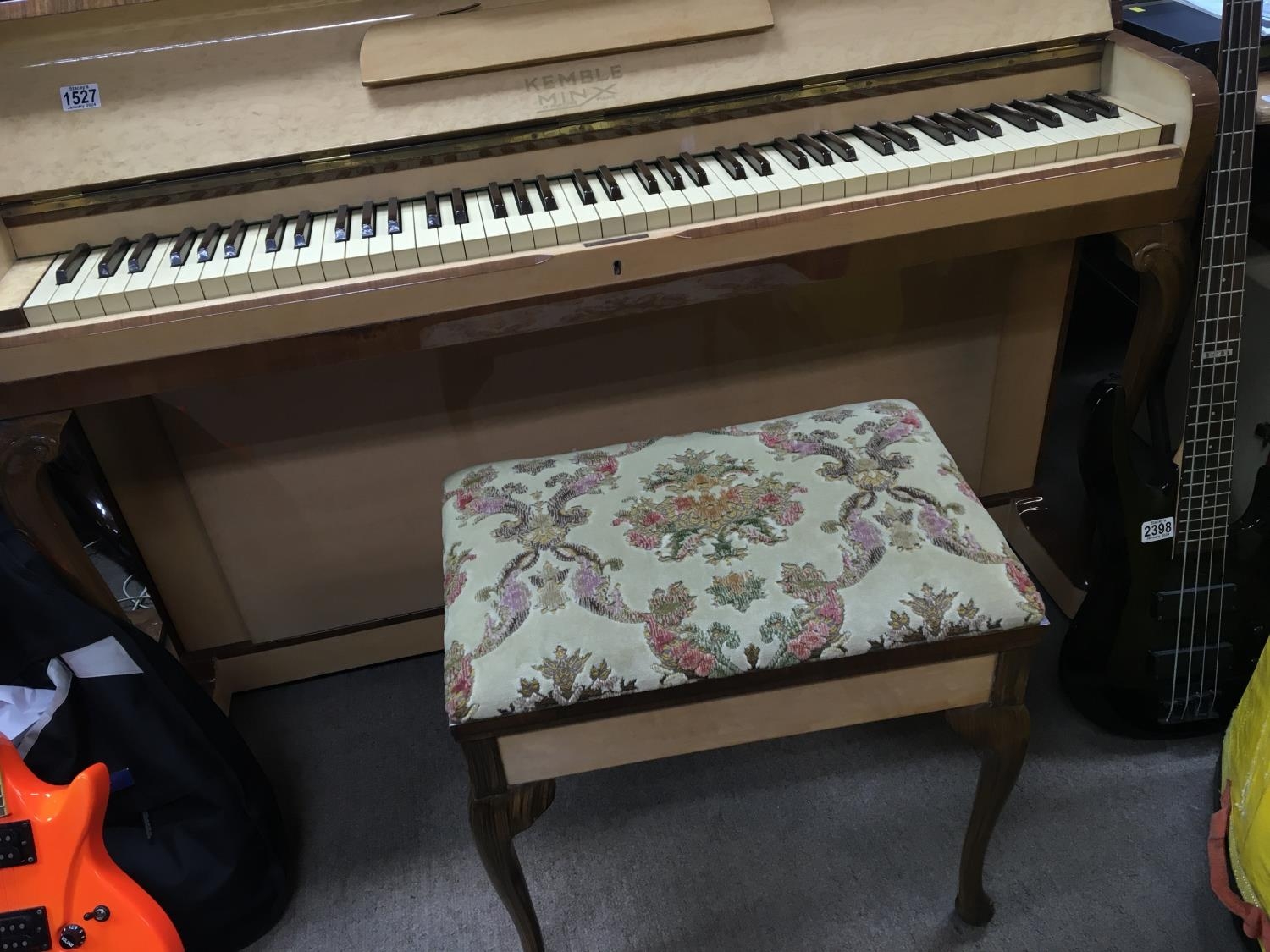 A Kemble Minx satin birch mini piano of Art Deco design with a matching stool.