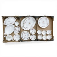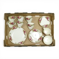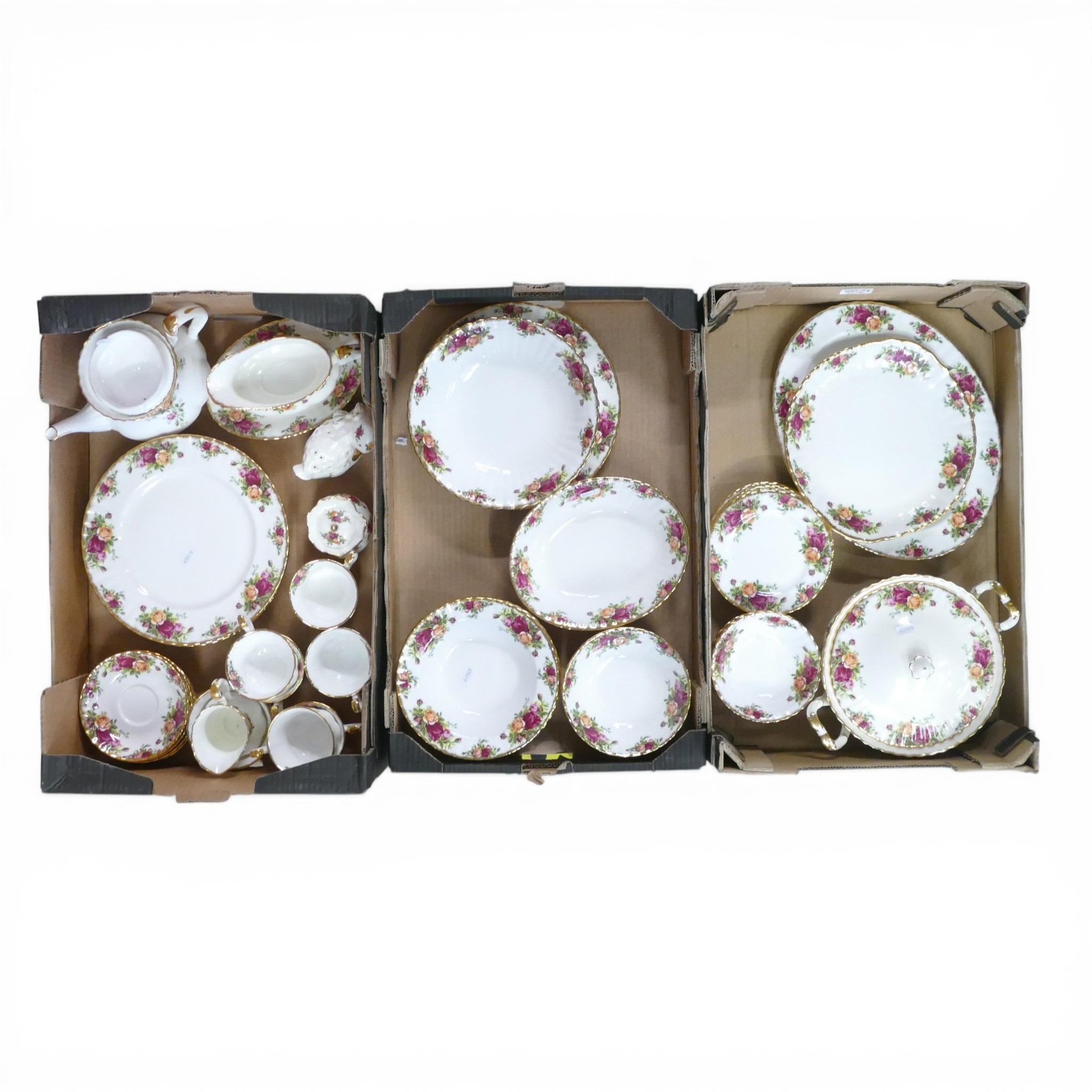 Royal Albert Old Country Roses part tea and dinner set to include tea pot, milk jug, sugar bowl, lidded sugar bowl, six tea cups, six saucers, gravy boat and dish, eight dinner plates, duck pomander, large serving bowl, oval serving bowl, six soup bowls, six dessert bowls, six cereal bowls calendar plate, six side plates, sandwich plate, oval serving plate and lidded tureen. (approx. 55 pieces) (3 Trays)