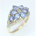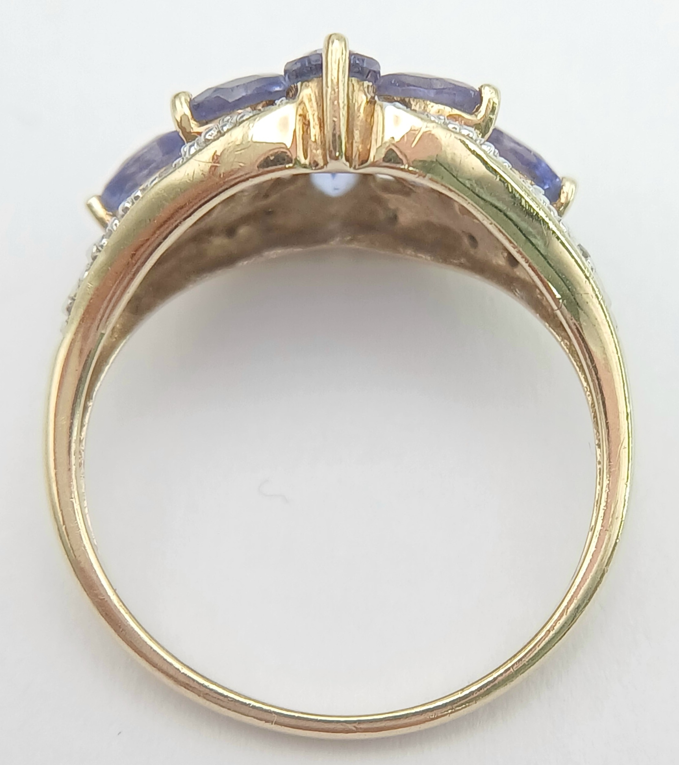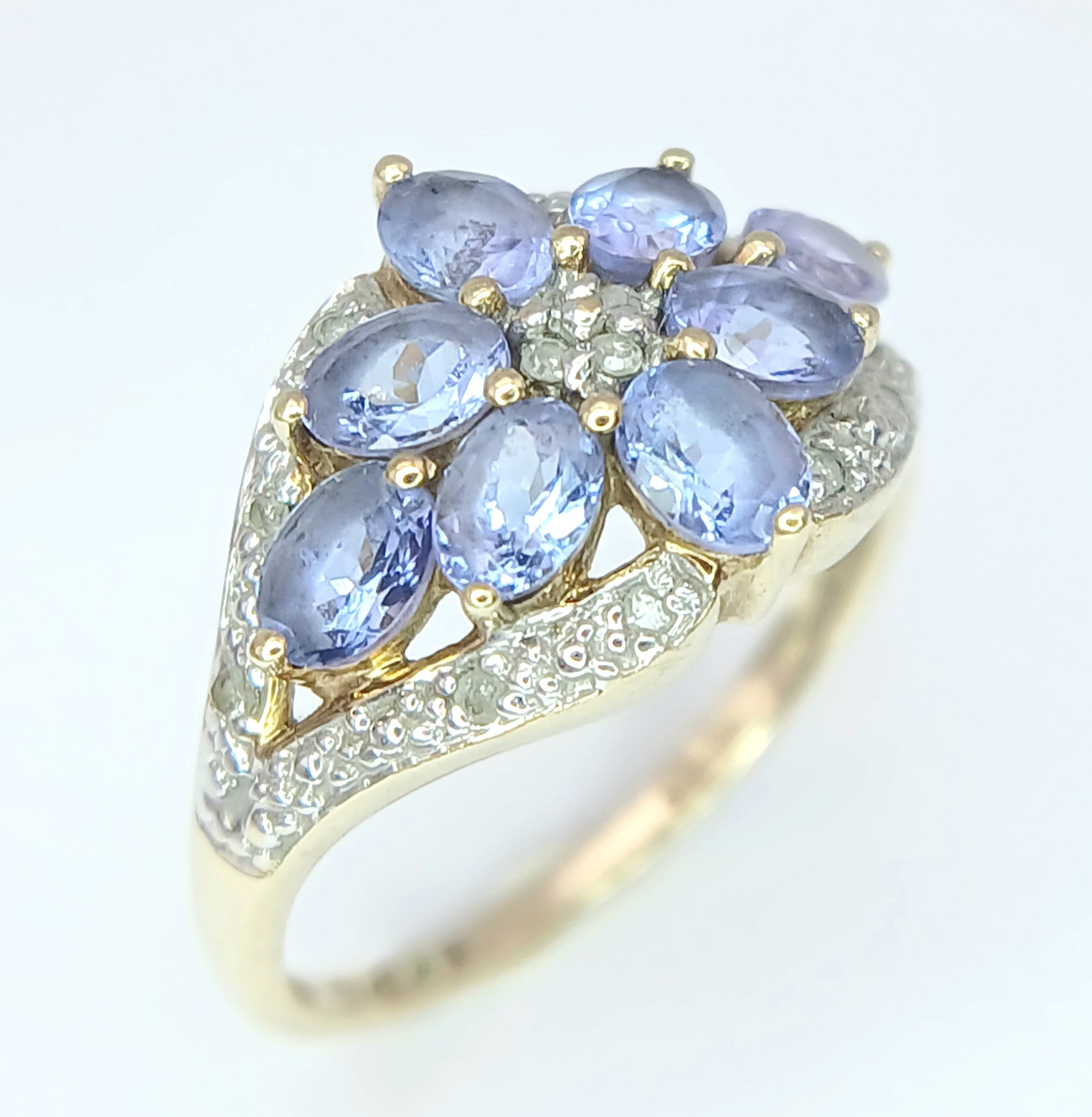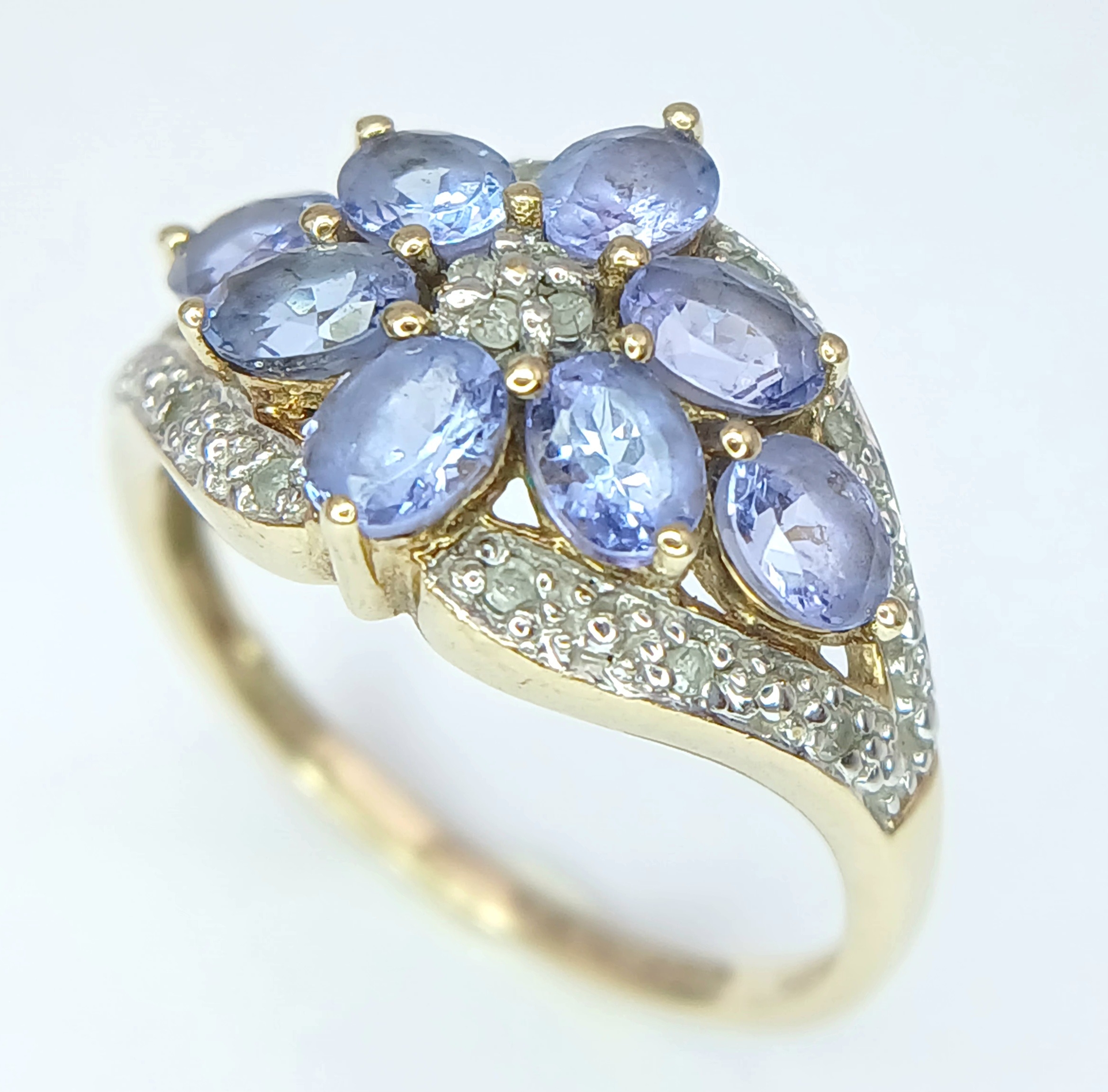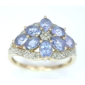 A Wonderful 9 Carat Gold Tanzanite and Diamond Ring Size M. The Ring is set with Eight 5 x 3mm Oval Cut Tanzanite (approximately 1.92 carat total) and Fourteen Round Cut Diamonds (approximately 0.07 Carats Total) The Ring has a gross weight of 2.59 Grams.