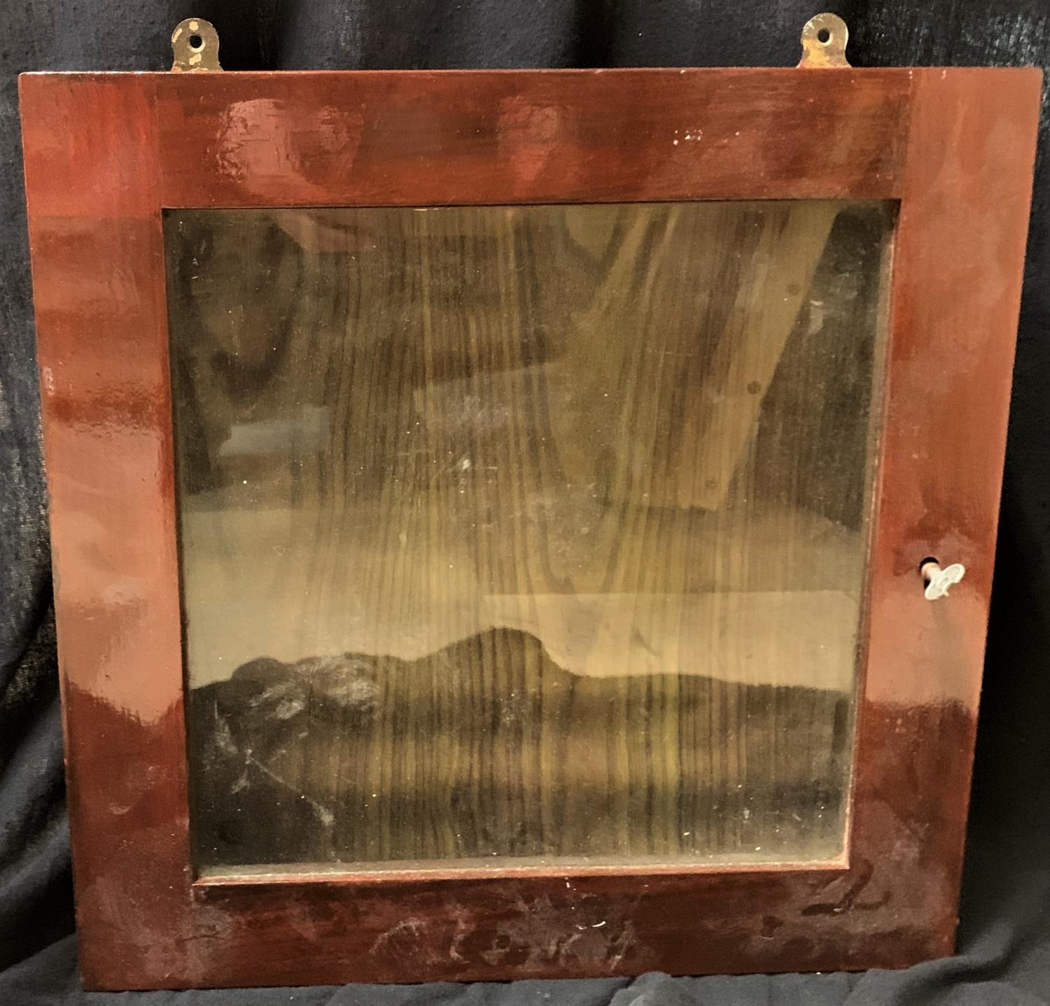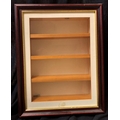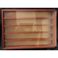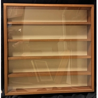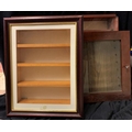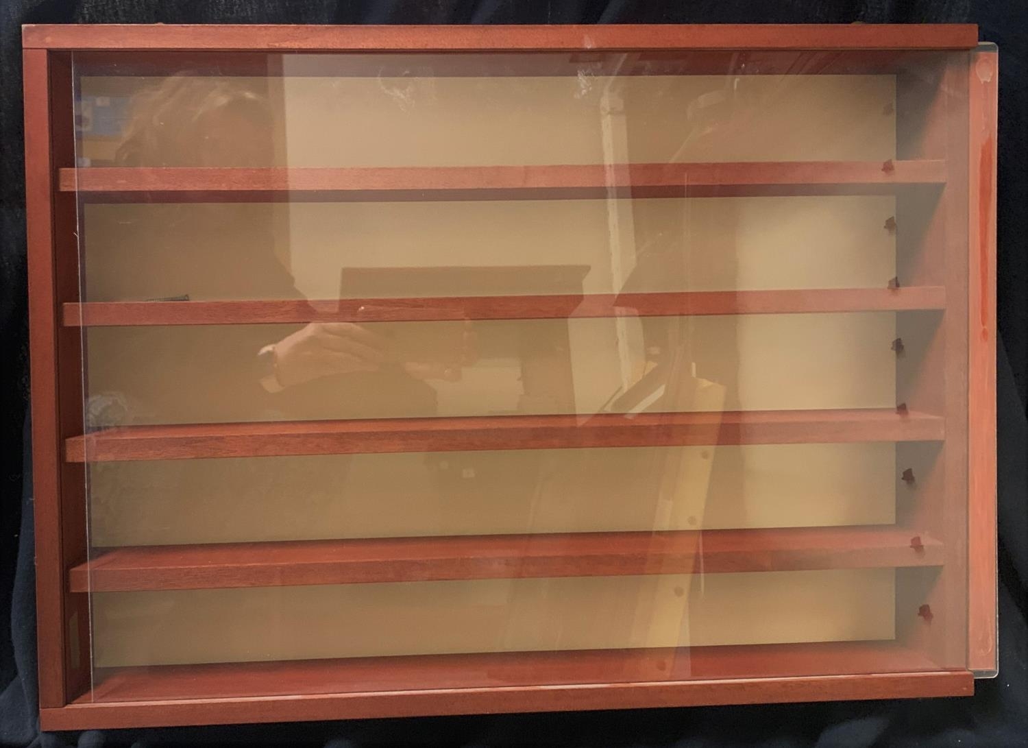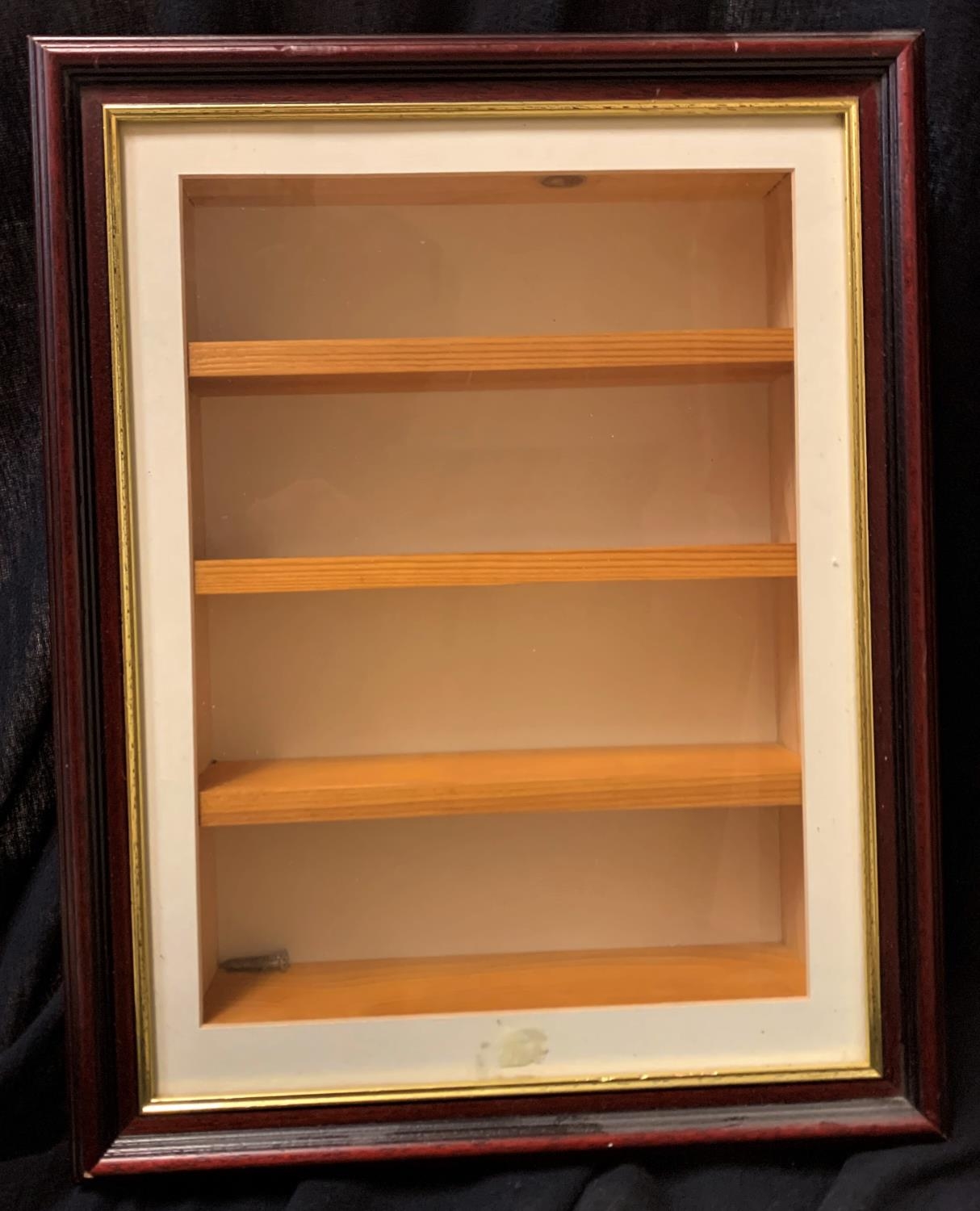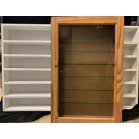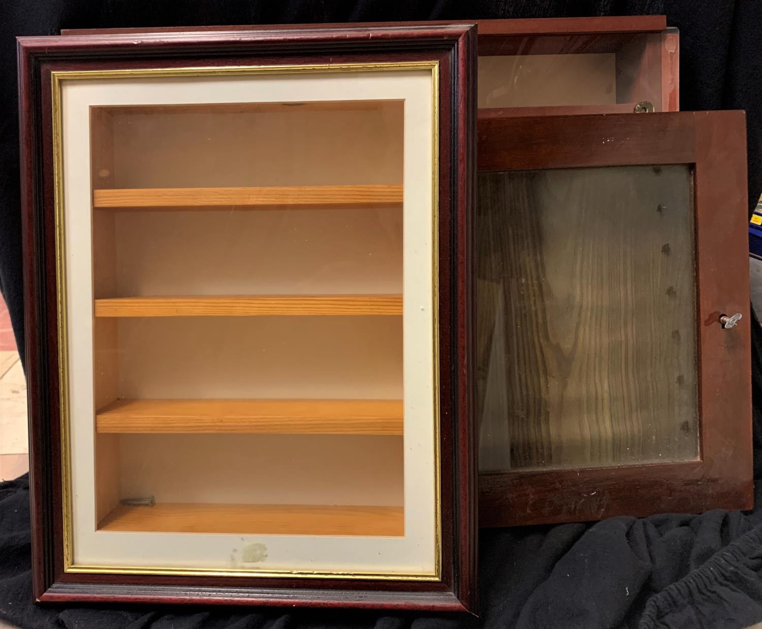 3 GLASS FRONTED DISPLAY CABINETS: 4 SHELF (DOOR SIZE H46, W37, 49cm), 5 SHELF (H44.5, W61, D8.5cm) & NO SHELF (H38.5, W38, D7.5cm)
