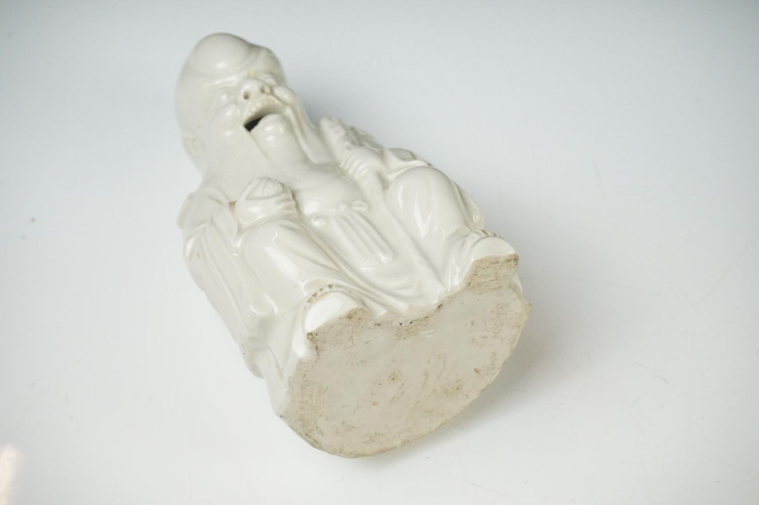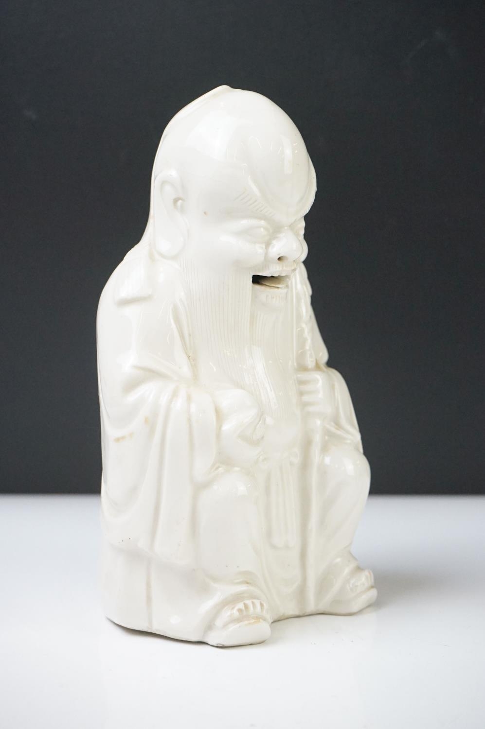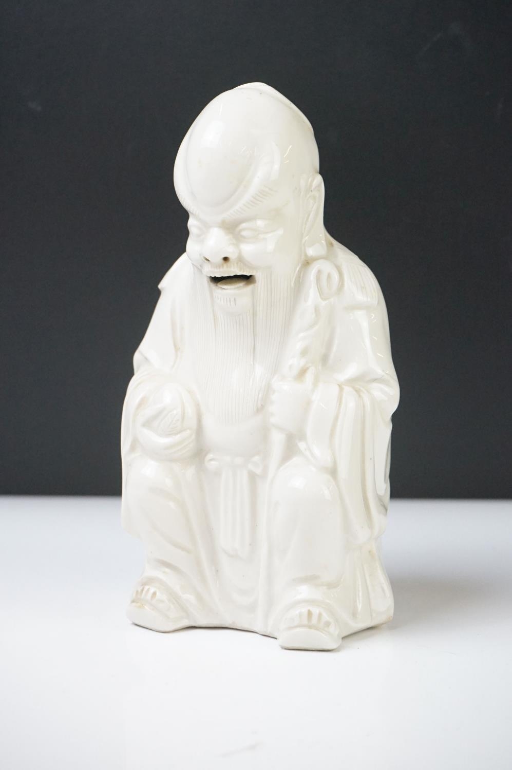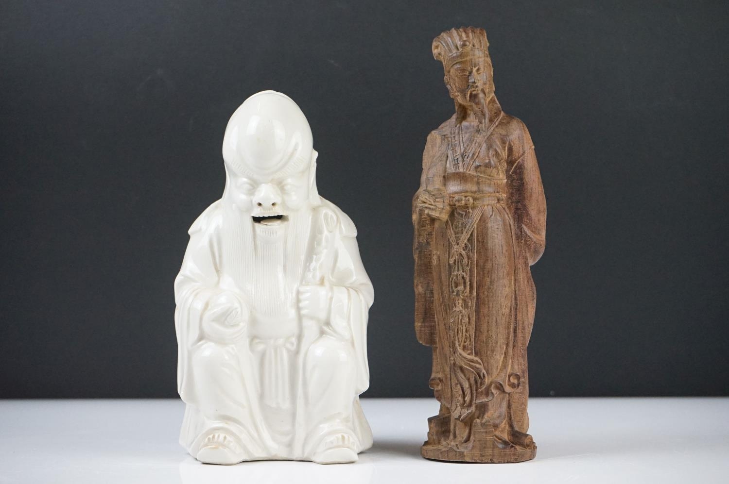 Chinese Blanc de Chine Ceramic Figure of a Seated Elder, 18cm high together with Hardwood Carved Chinese Figure, 21cm high