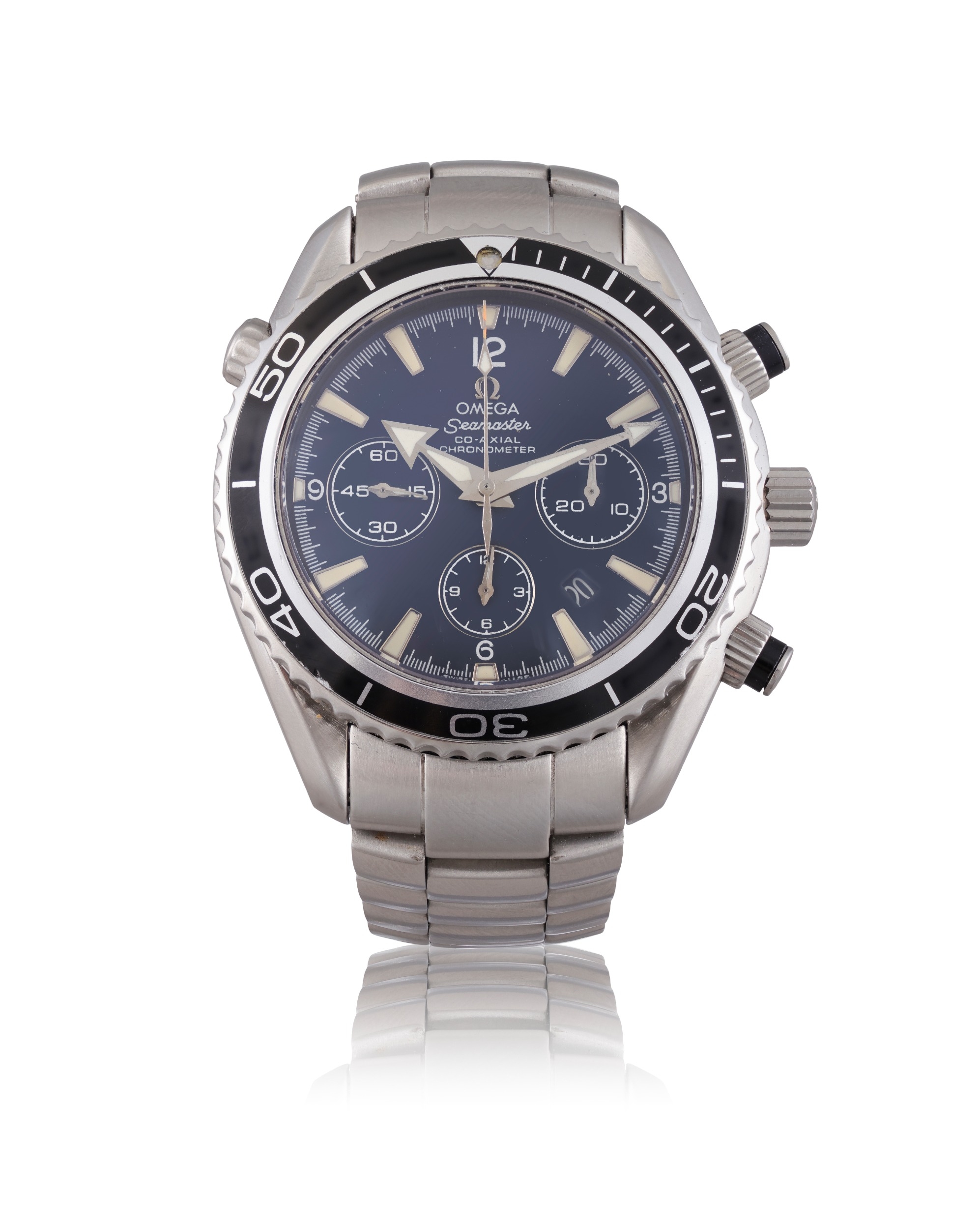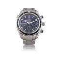 OMEGA SEAMASTER PLANET OCEAN CHRONOGRAPH AUTOMATIC WRISTWATCH, REF. 168.1652 A stainless steel automatic chronograph wristwatch by Omega. Circa: 2000s Dial: Black dial with applied luminous hour markers, outer minute track, three subsidiary dials for chronograph functions, date aperture at 3 o'clock, signed Omega Seamaster, luminous hands Movement: Automatic, Omega calibre 3303, ETA-based, movement no. 816880298 Case: Stainless steel case, unidirectional rotating bezel, screw-down pushers and crown, screw-down caseback, ref. 168.1652 Size: 44 mm diameter approx. Bracelet/Strap: Omega stainless steel bracelet with folding clasp, ref. 1579/951, approximately 175 mm Gross Weight: 220 g approx. Signature: Dial, case and movement signed