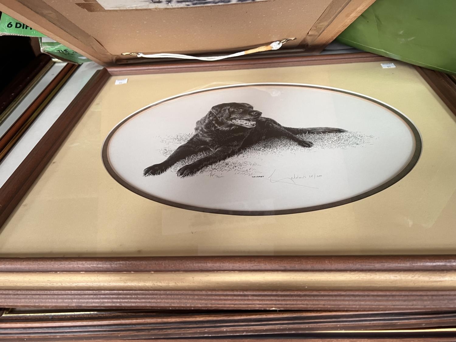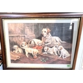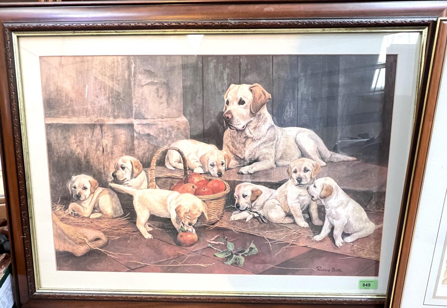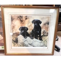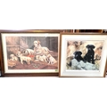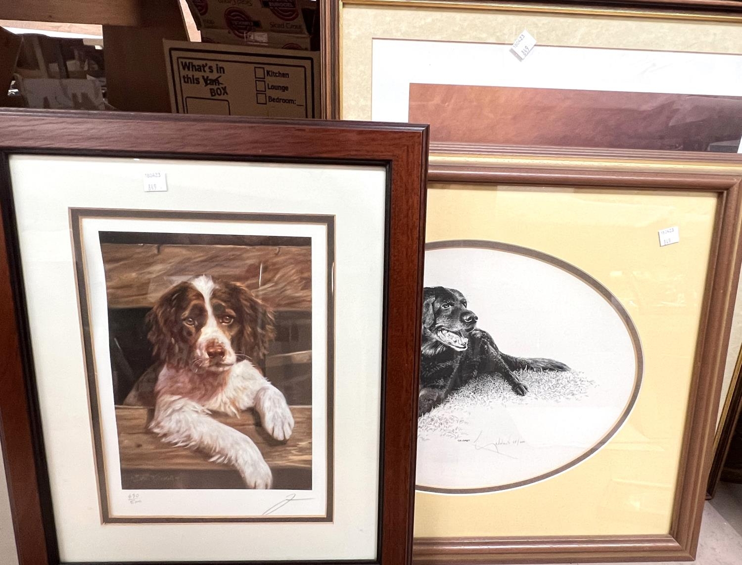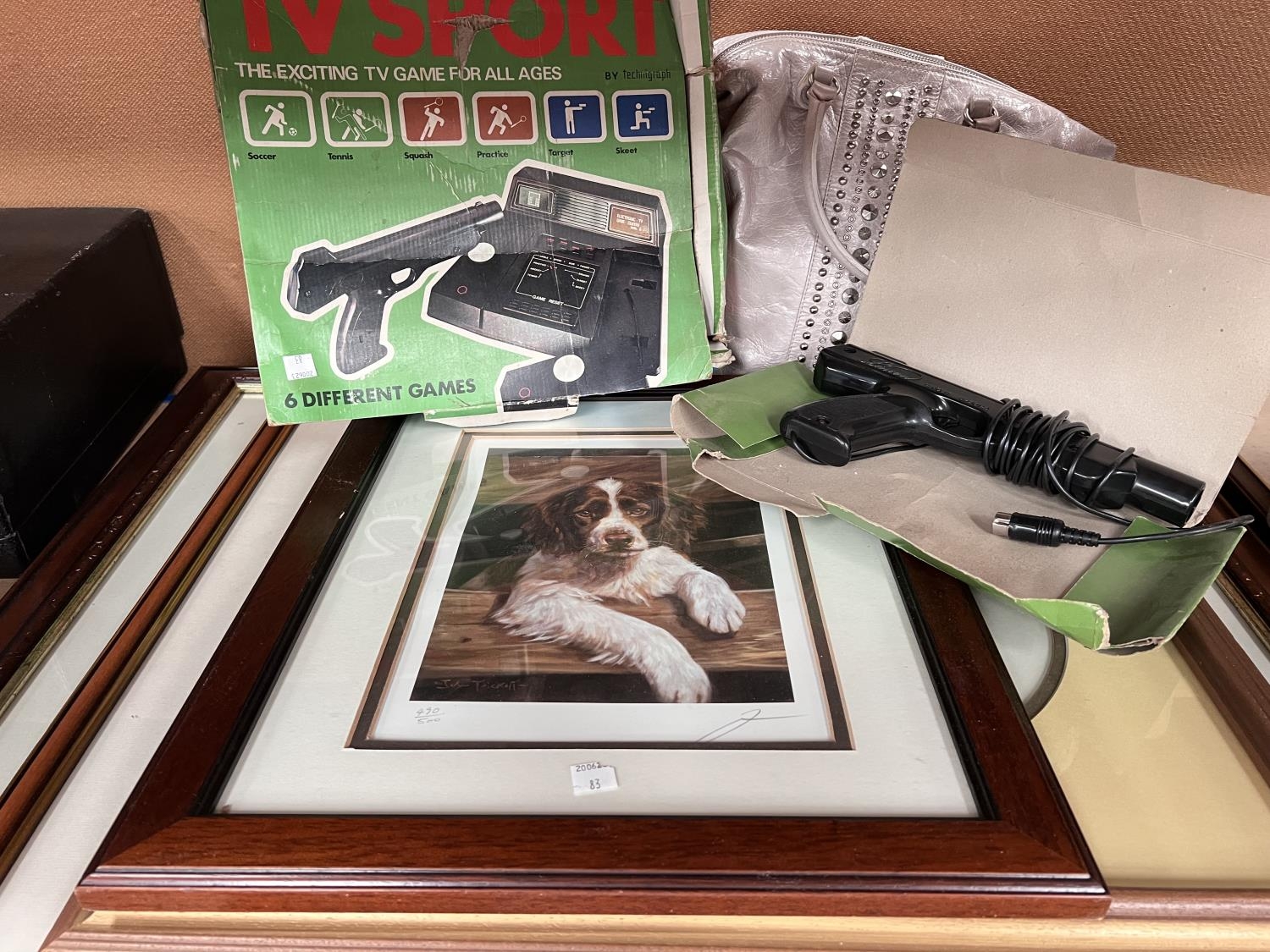 A selection of framed and glazed signed and some limited edition prints of various breeds of dogs, including by Geldart etc; A vintage Technigraph boxed TV sport console; a Montini Italian designer leather shoulder bag with studded decoration and outer bag