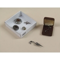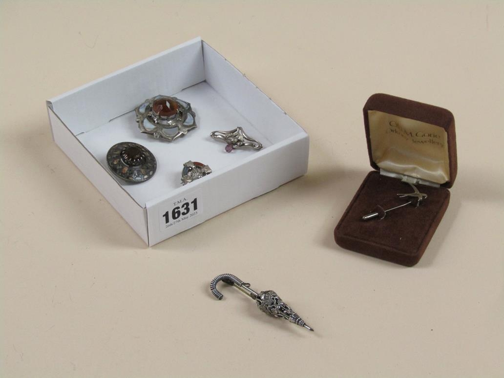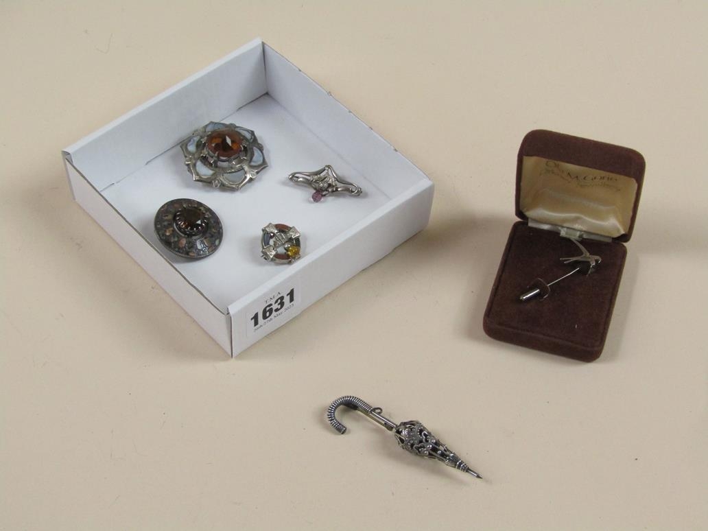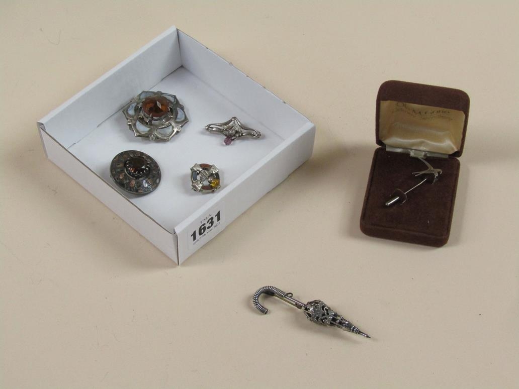 FOUR STONE SET BROOCHES; UMBRELLA BROOCH; BOXED BLUEBIRD PIN