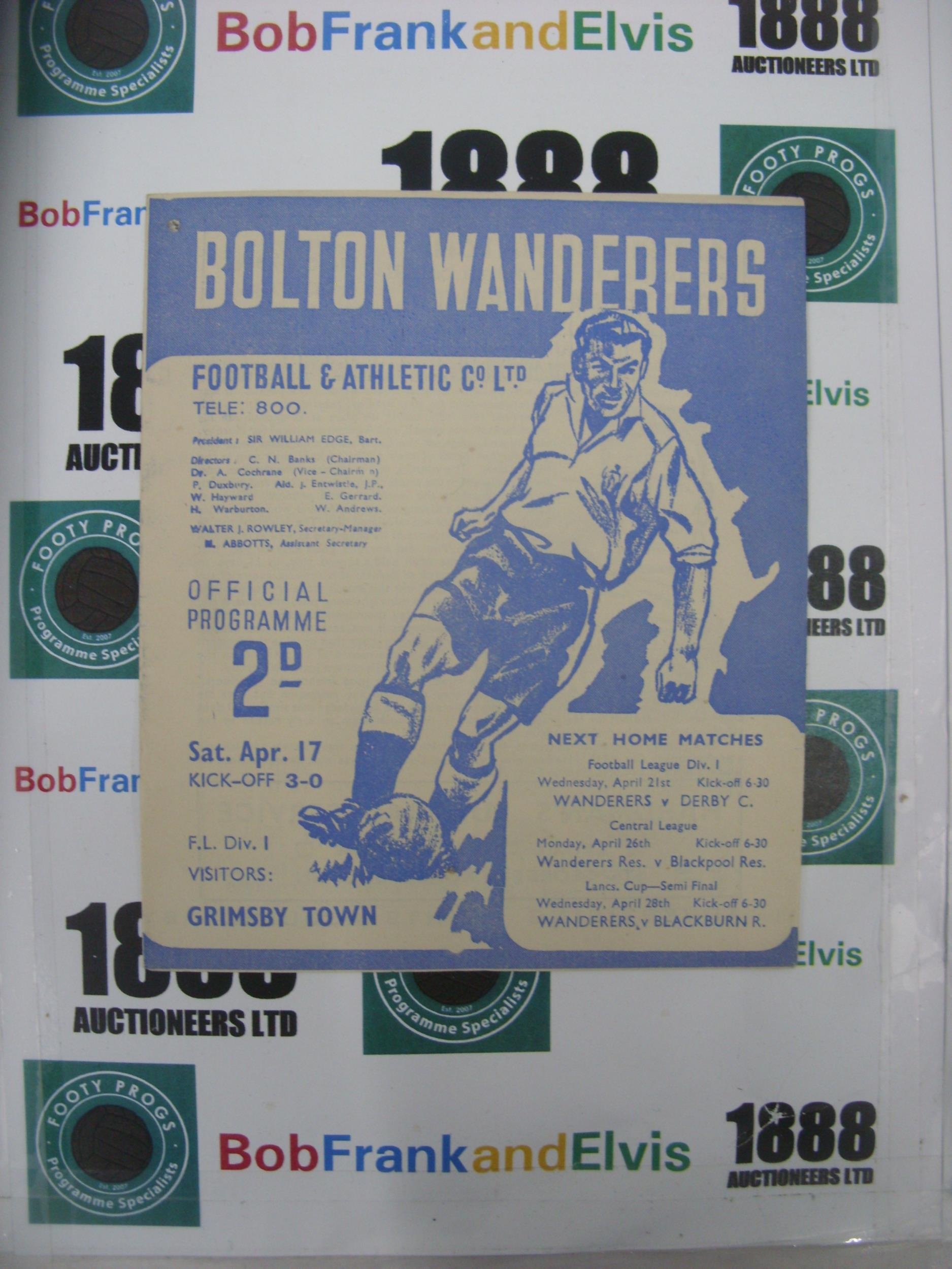 BOLTON WANDERERS, 1947/1948, a football programme from the game versus Grimsby Town, played on 17/04/1948 (pin hole in corner, scores on back).