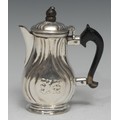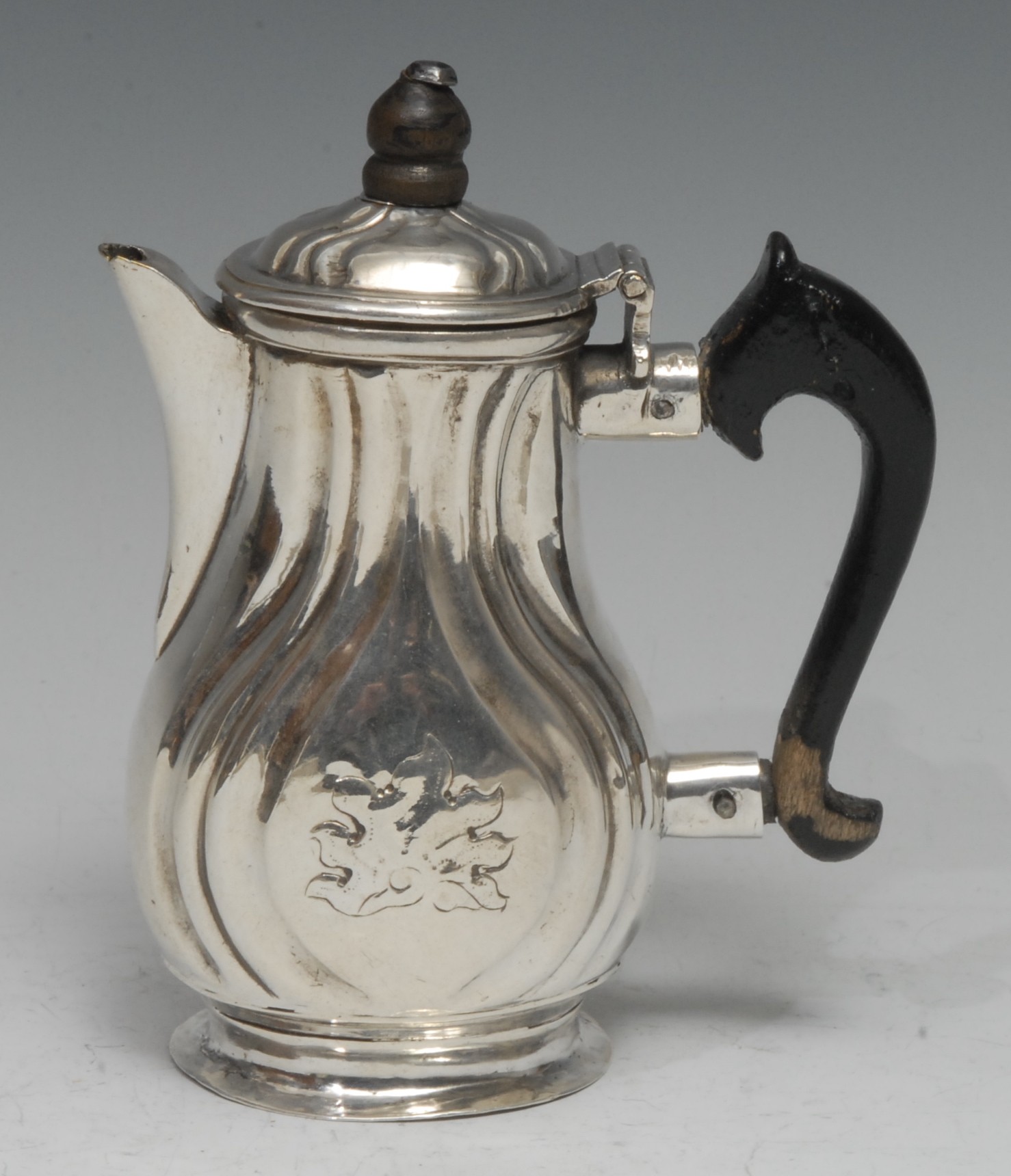 An 18th century Continental silver wrythen-fluted covered jug, ebonised handle, skirted base, 15.5cm high, apparently unmarked, 6.5oz gross