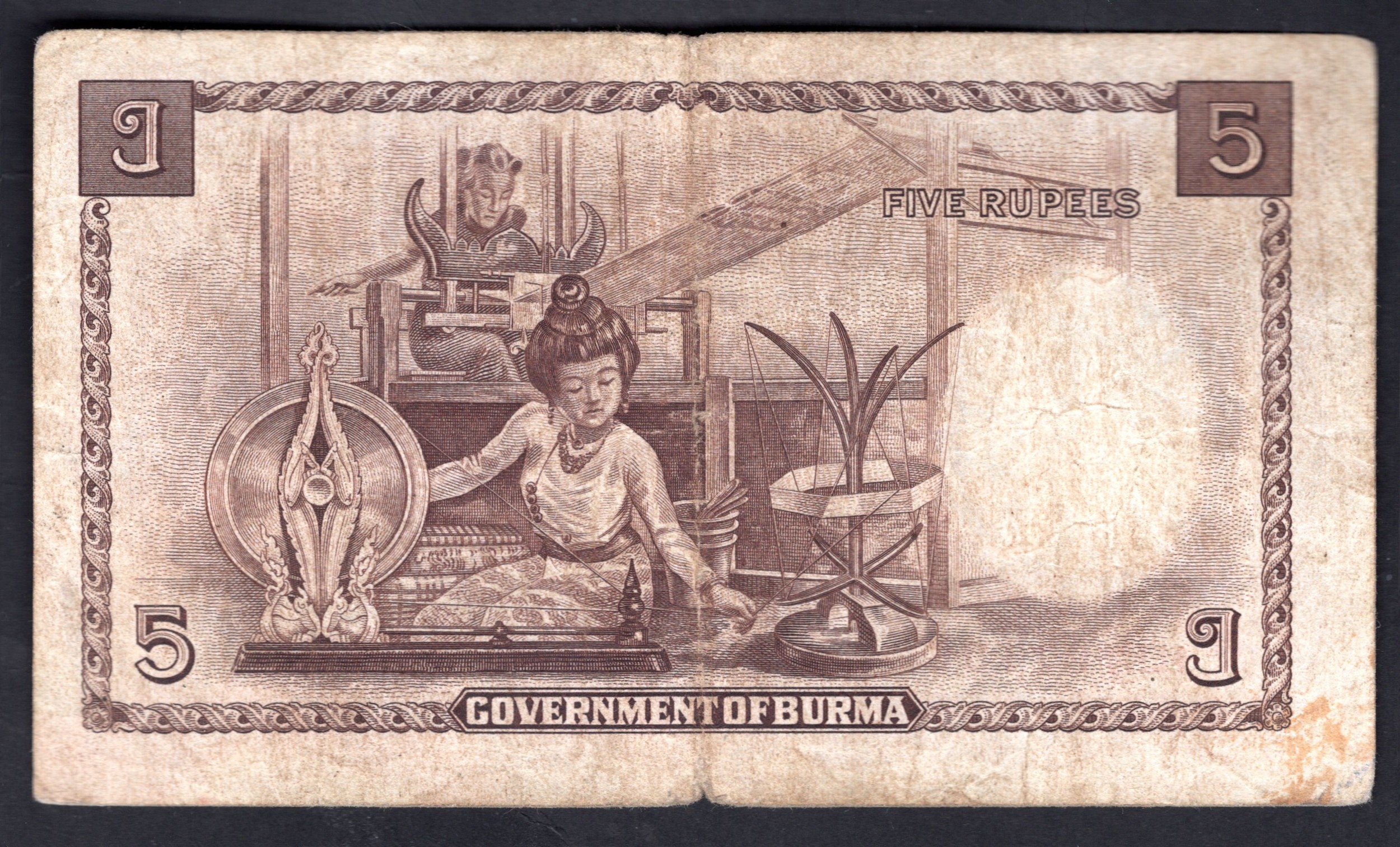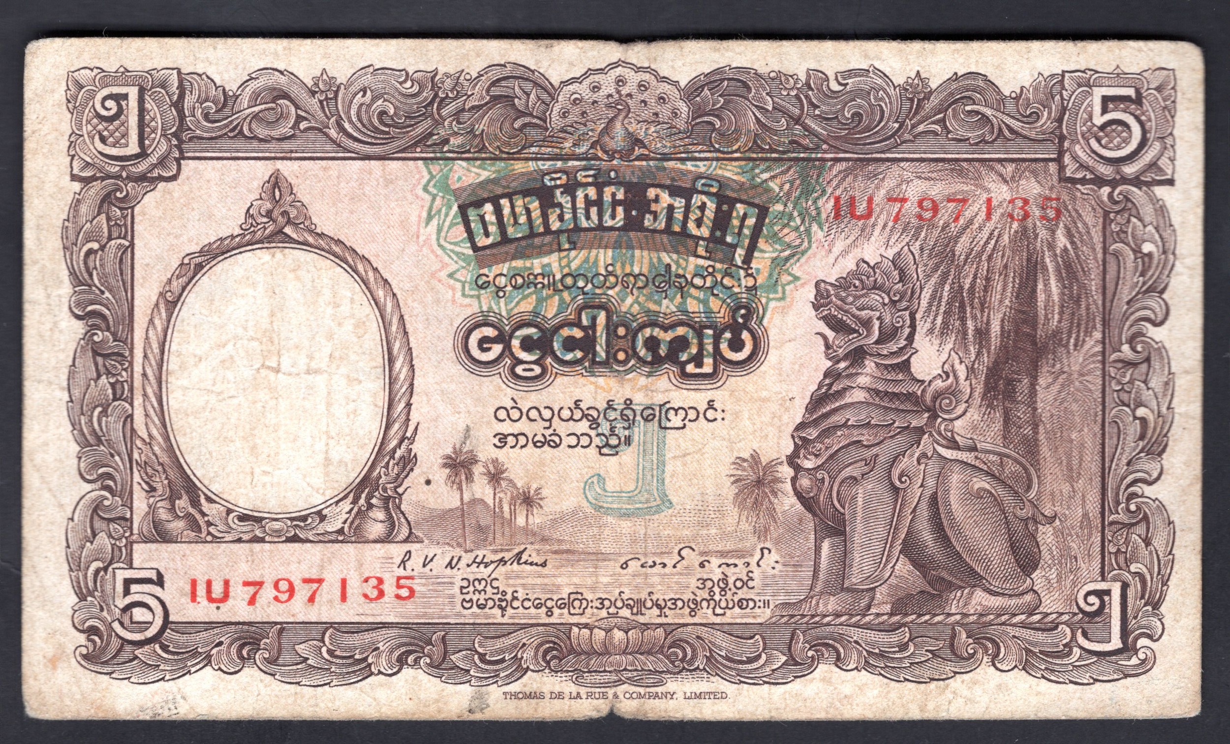 Burma, Government of Burma, 5 rupees, (1948), #IU 797135. Worn on centre fold, NVF.(P 35)