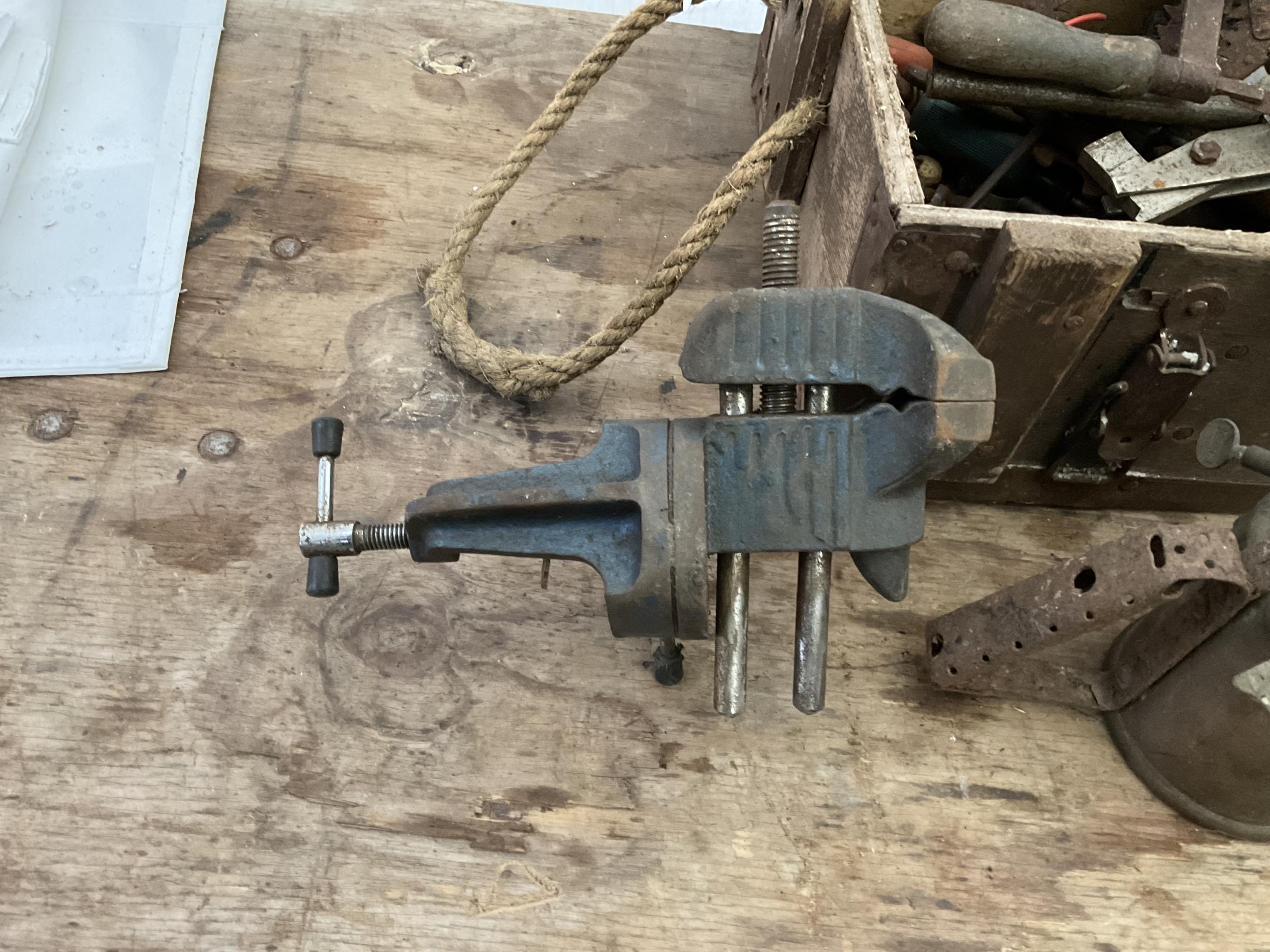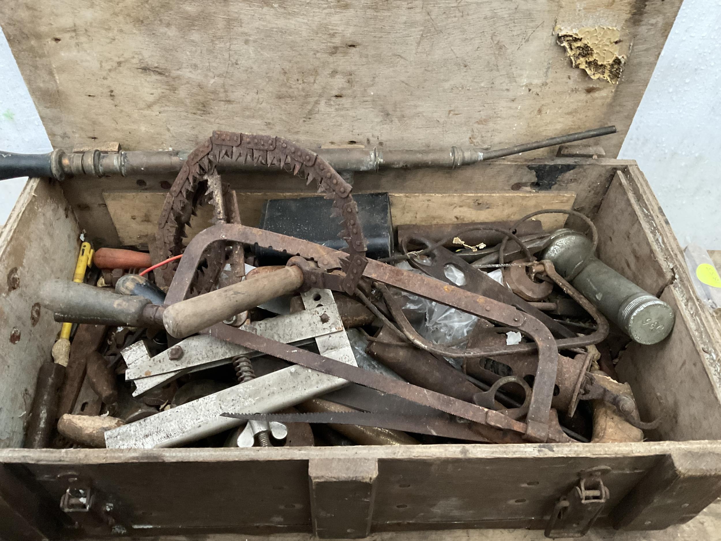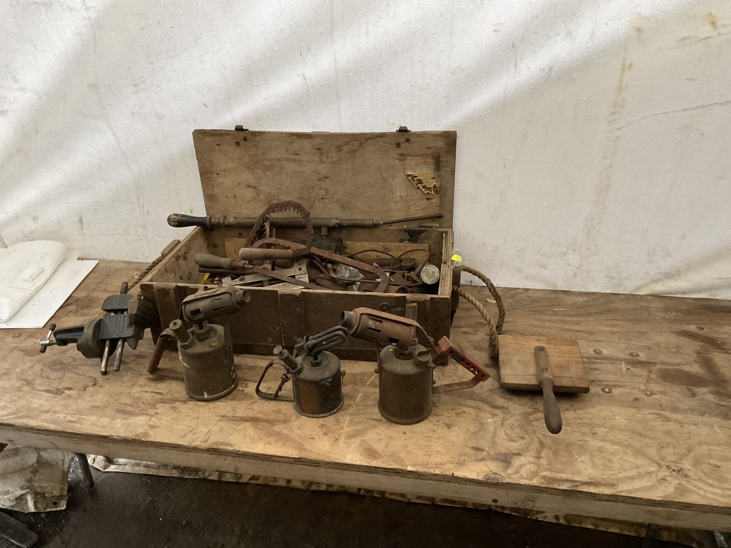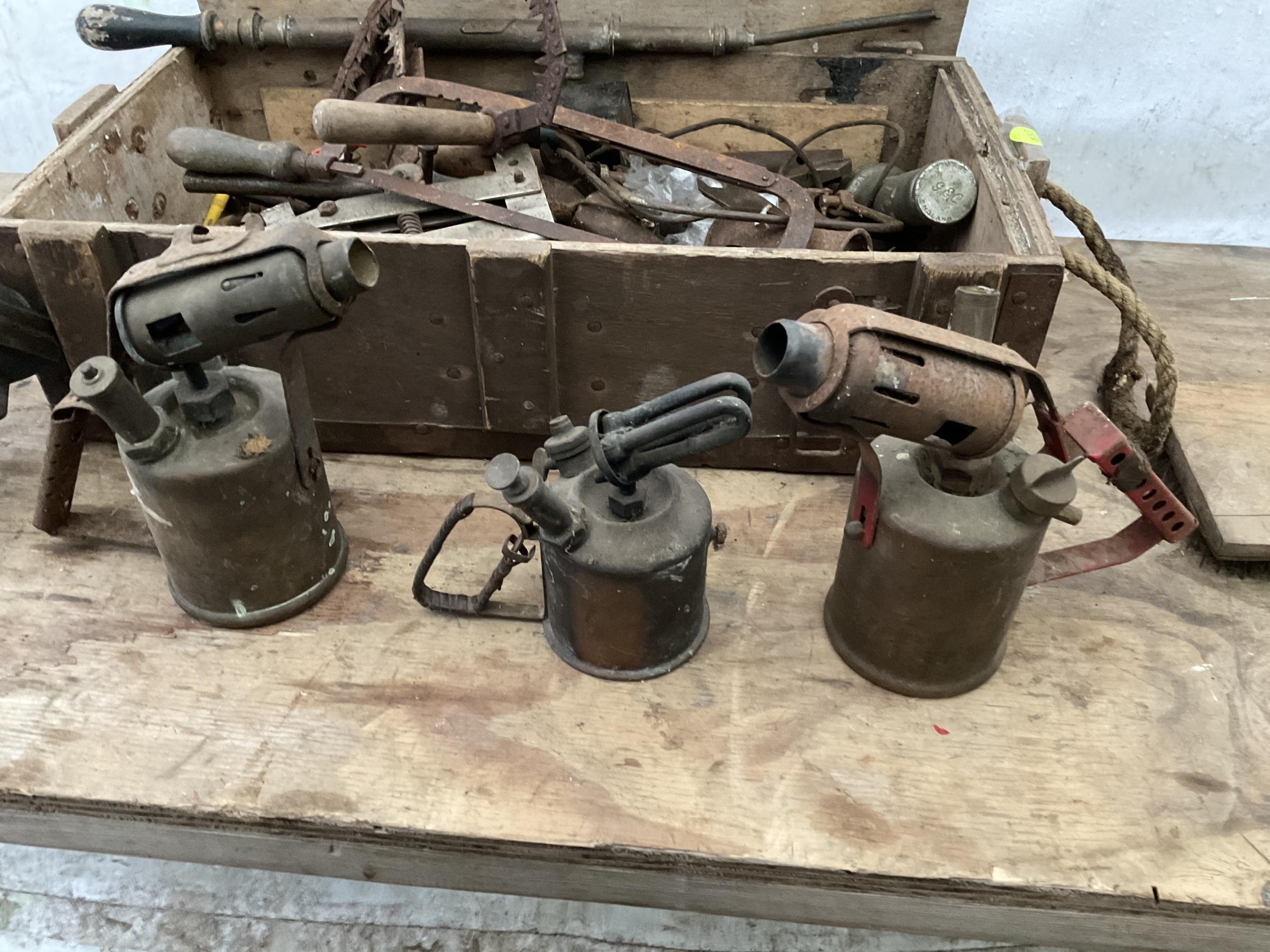 WOODEN BOX OF ODDS TO INCLUDE BRASS BLOW LAMPS ETC