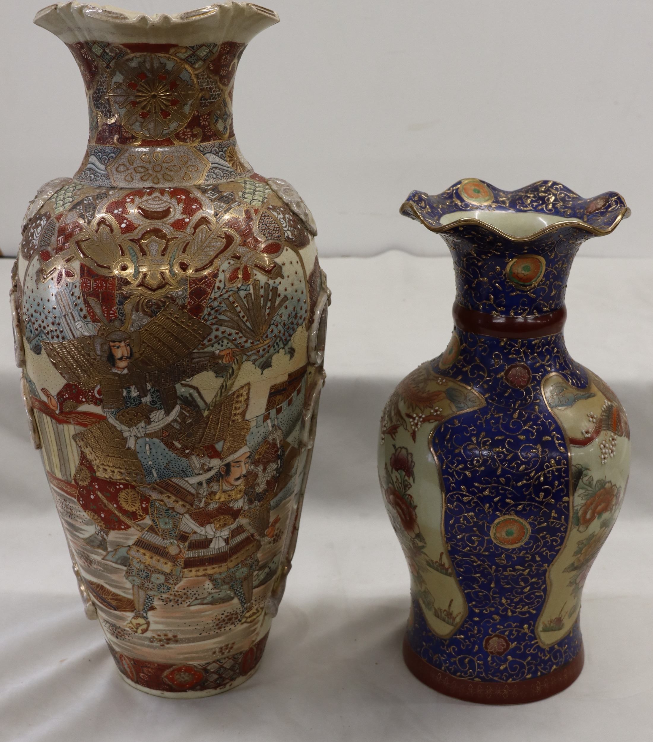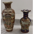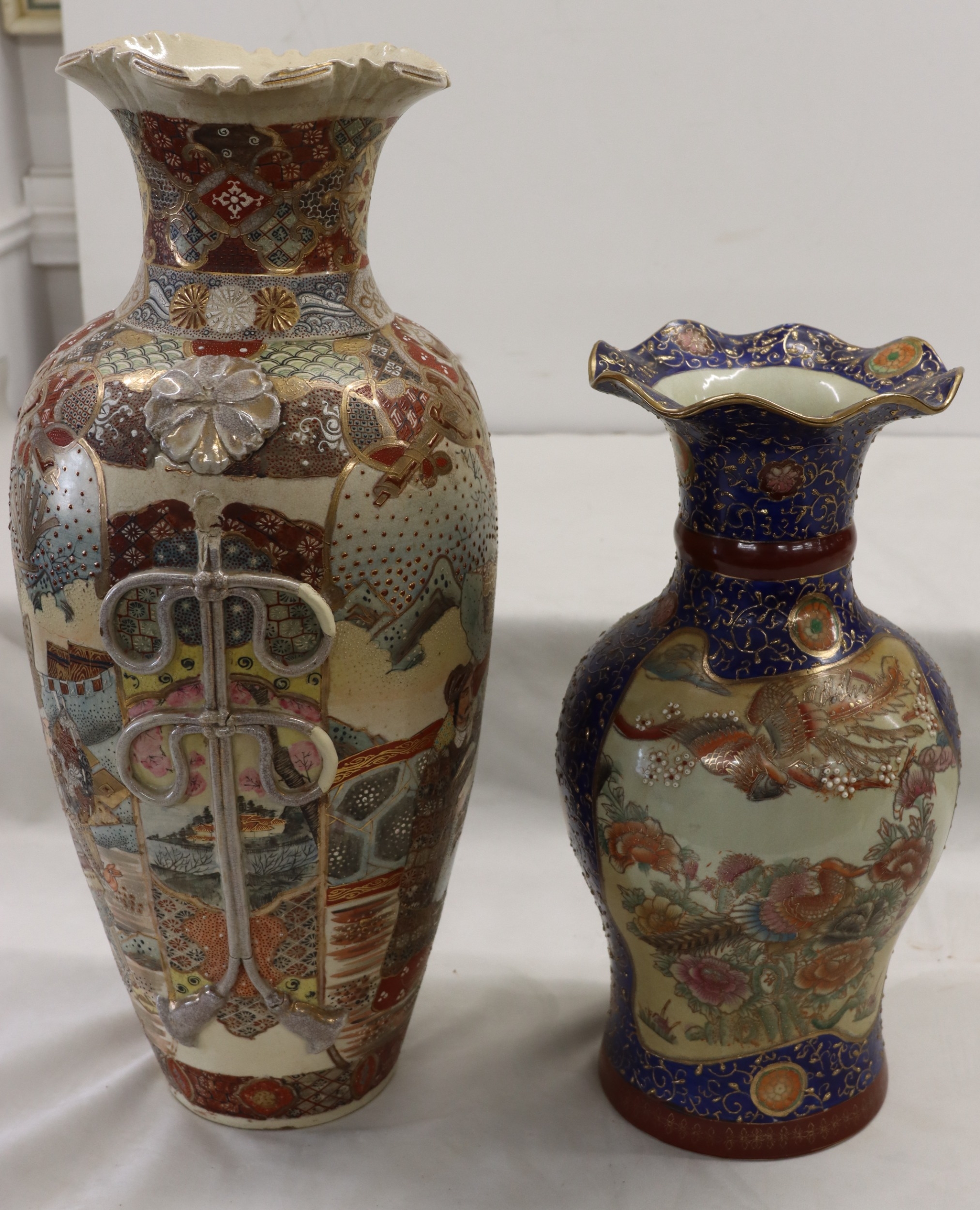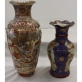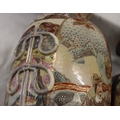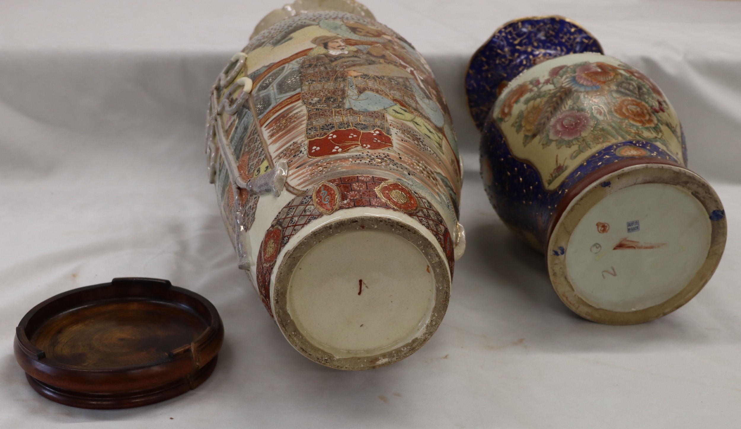 An Oriental Satsuma bulbous vase (crack to rim and raised rope detail damaged) with wood stand (split) 61cm high and another reproduction vase, 46cm high.