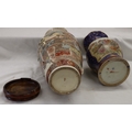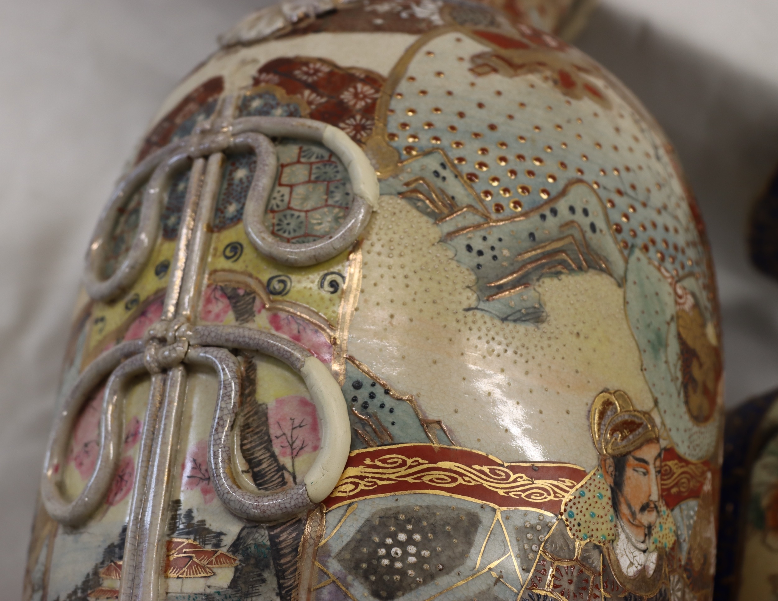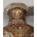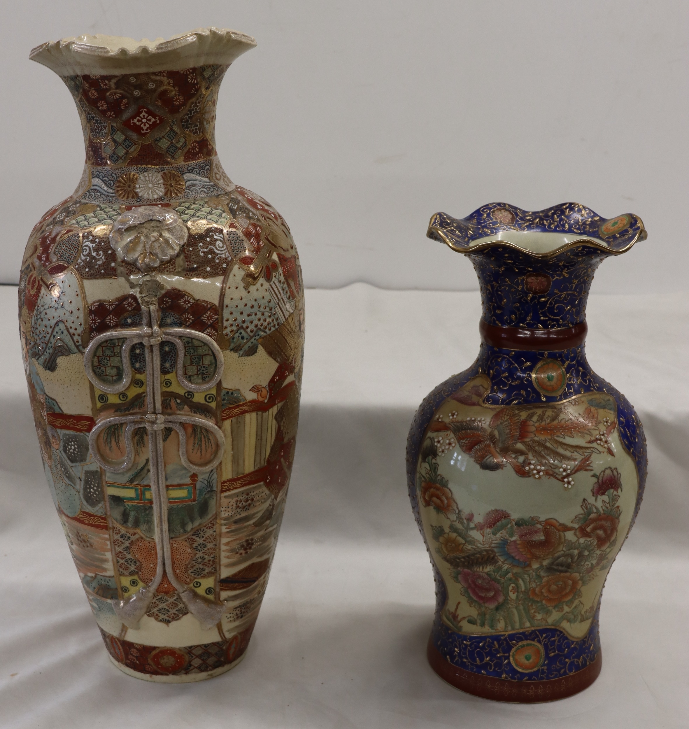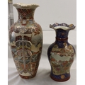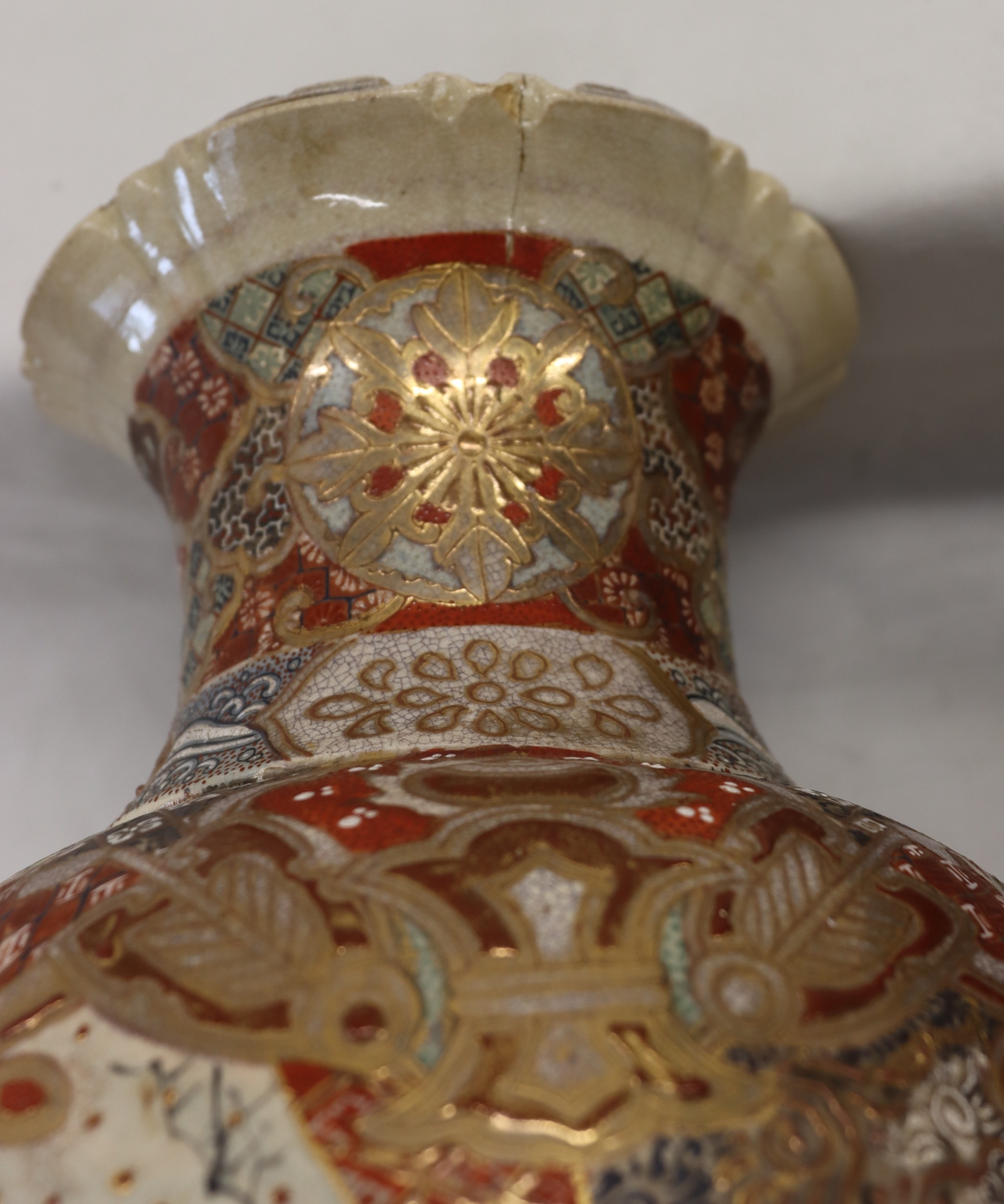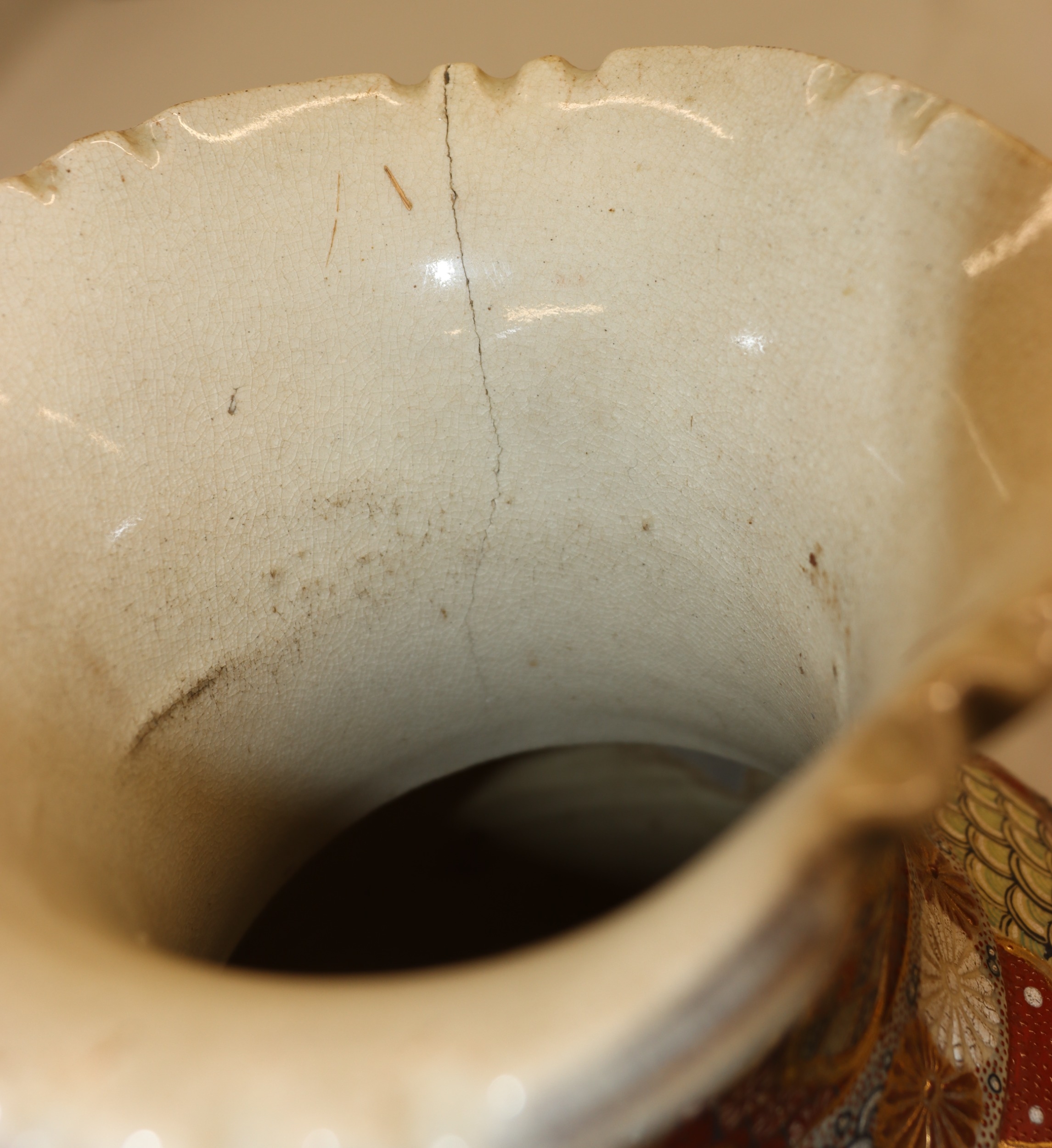 An Oriental Satsuma bulbous vase (crack to rim and raised rope detail damaged) with wood stand (split) 61cm high and another reproduction vase, 46cm high.
