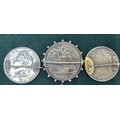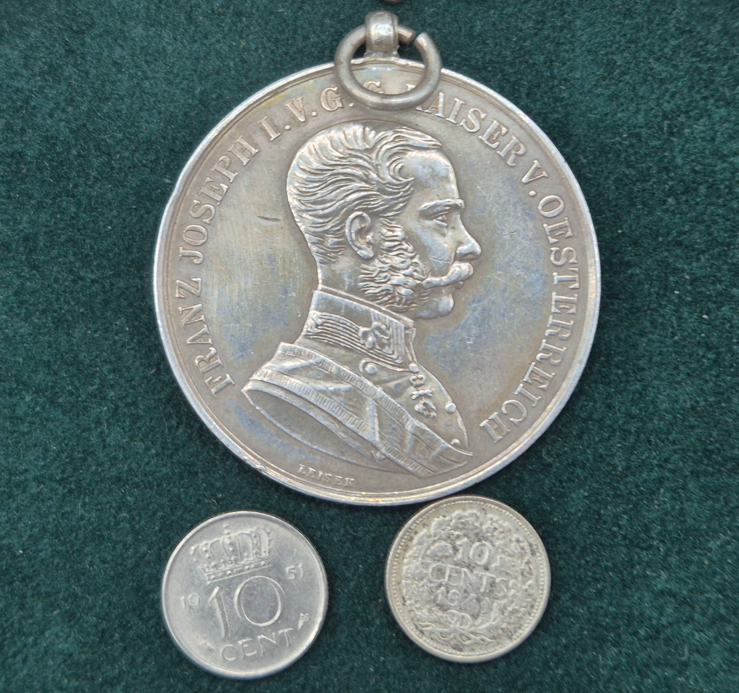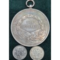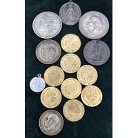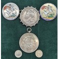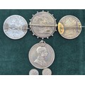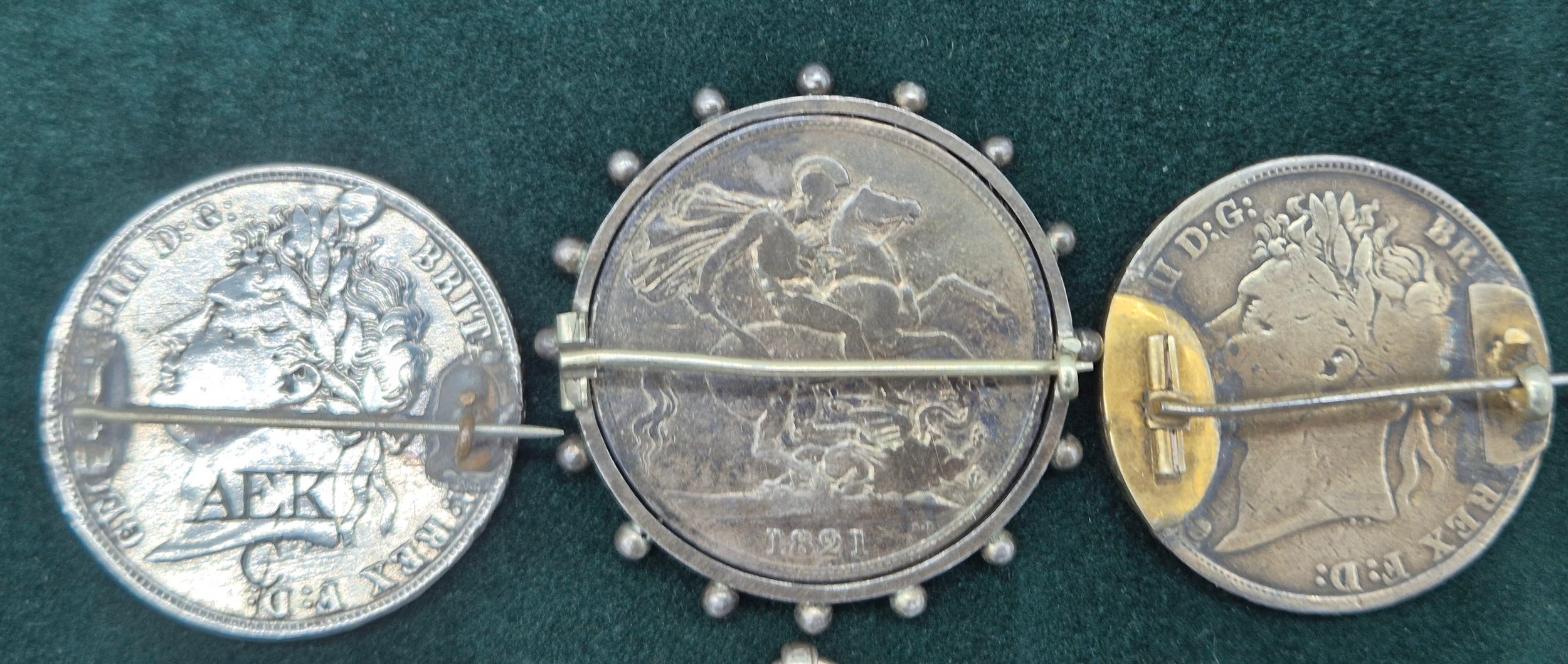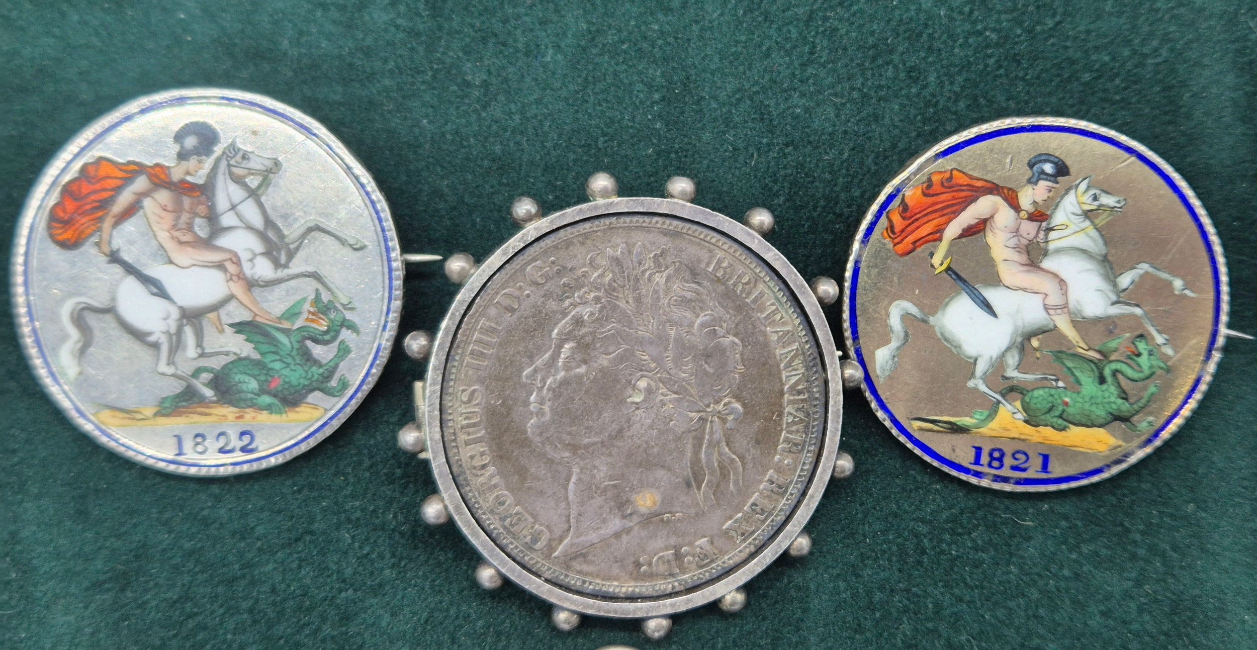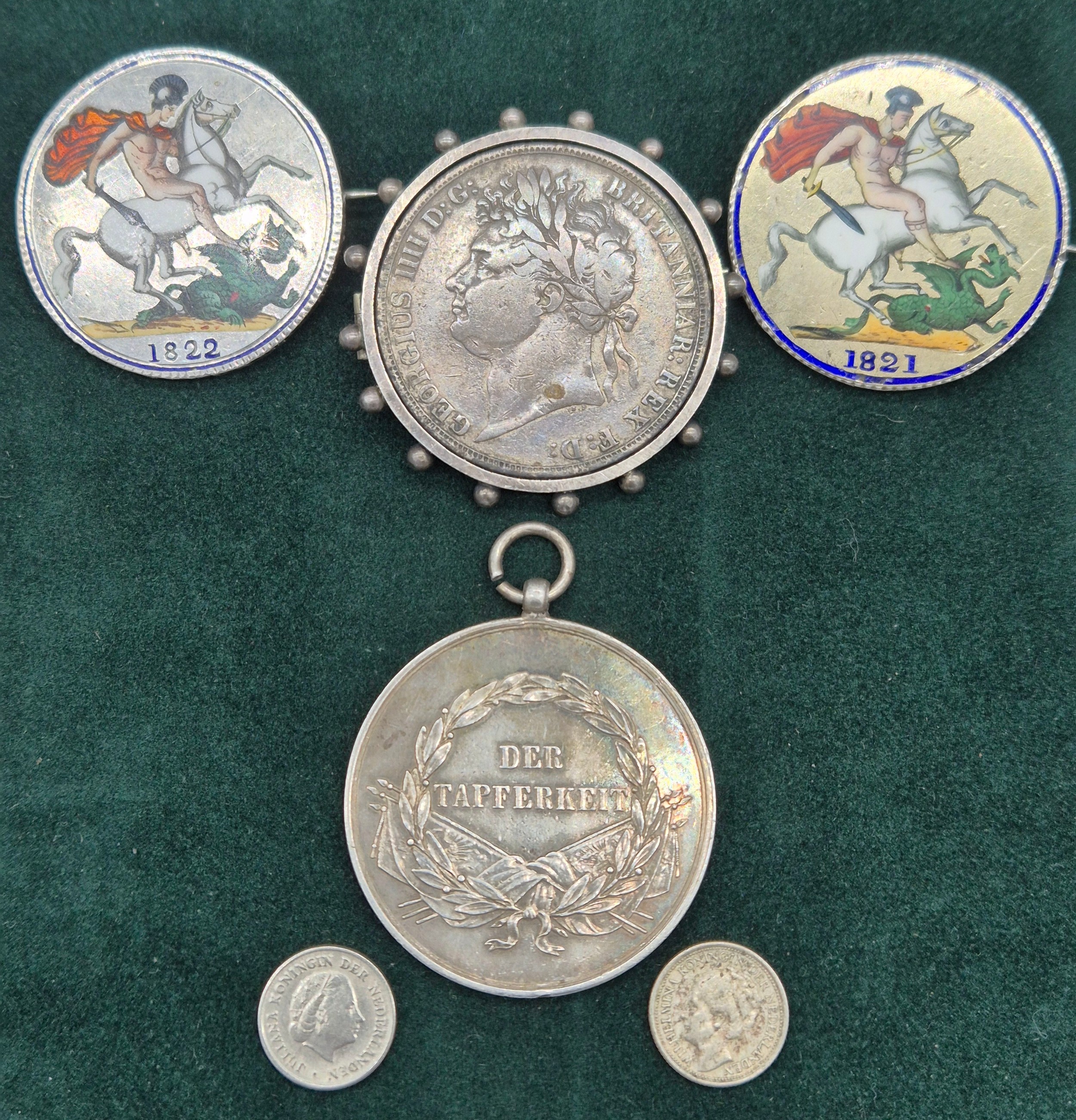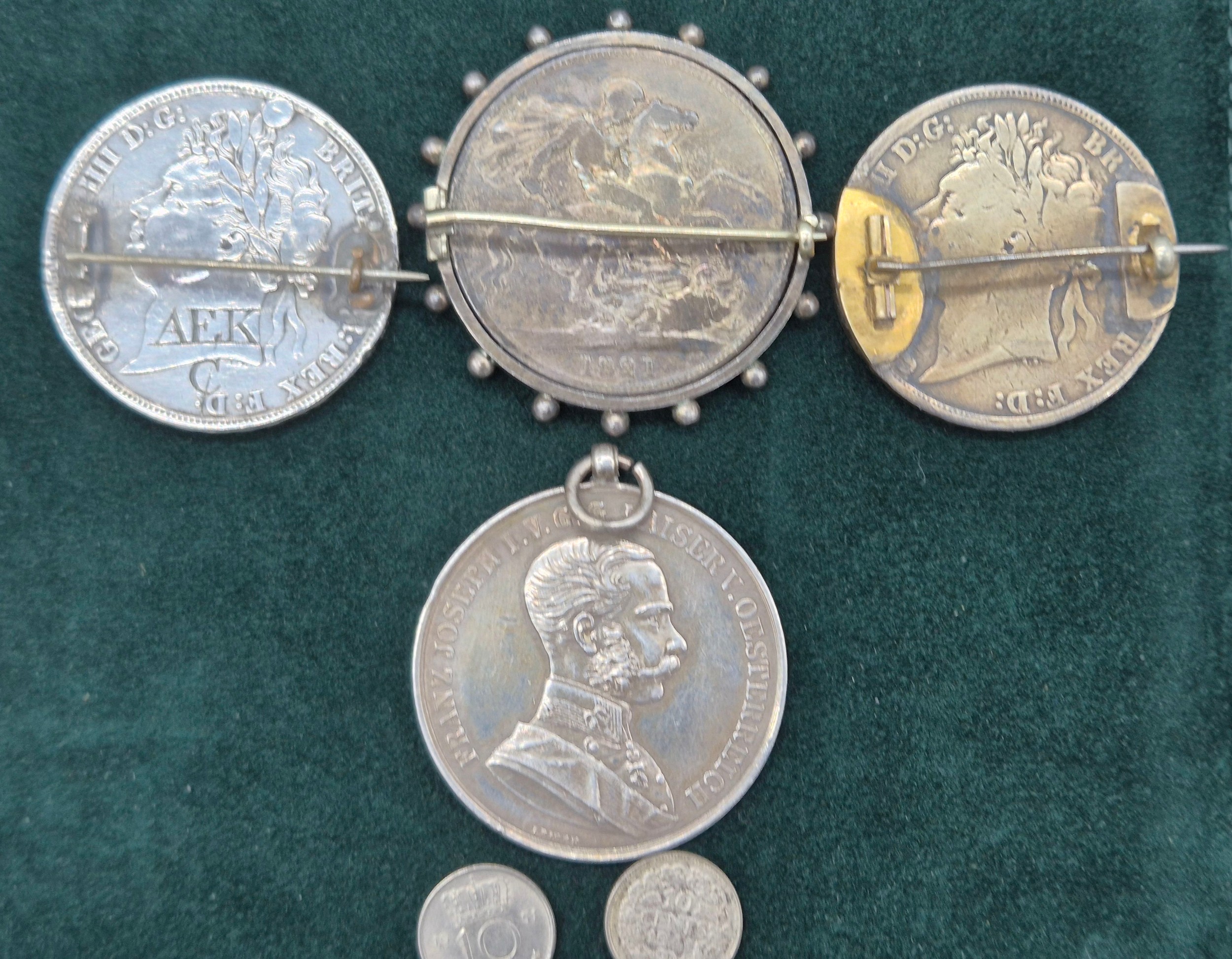 A Collection Antique coins; 1821 & 1822 silver and enamel worked George IIII Coins made into brooches. George IIII Silver coin fitted within a brooch fitting- dated 1821, Austrian Franz Joseph I Silver Bravery Medal and two other coins.
