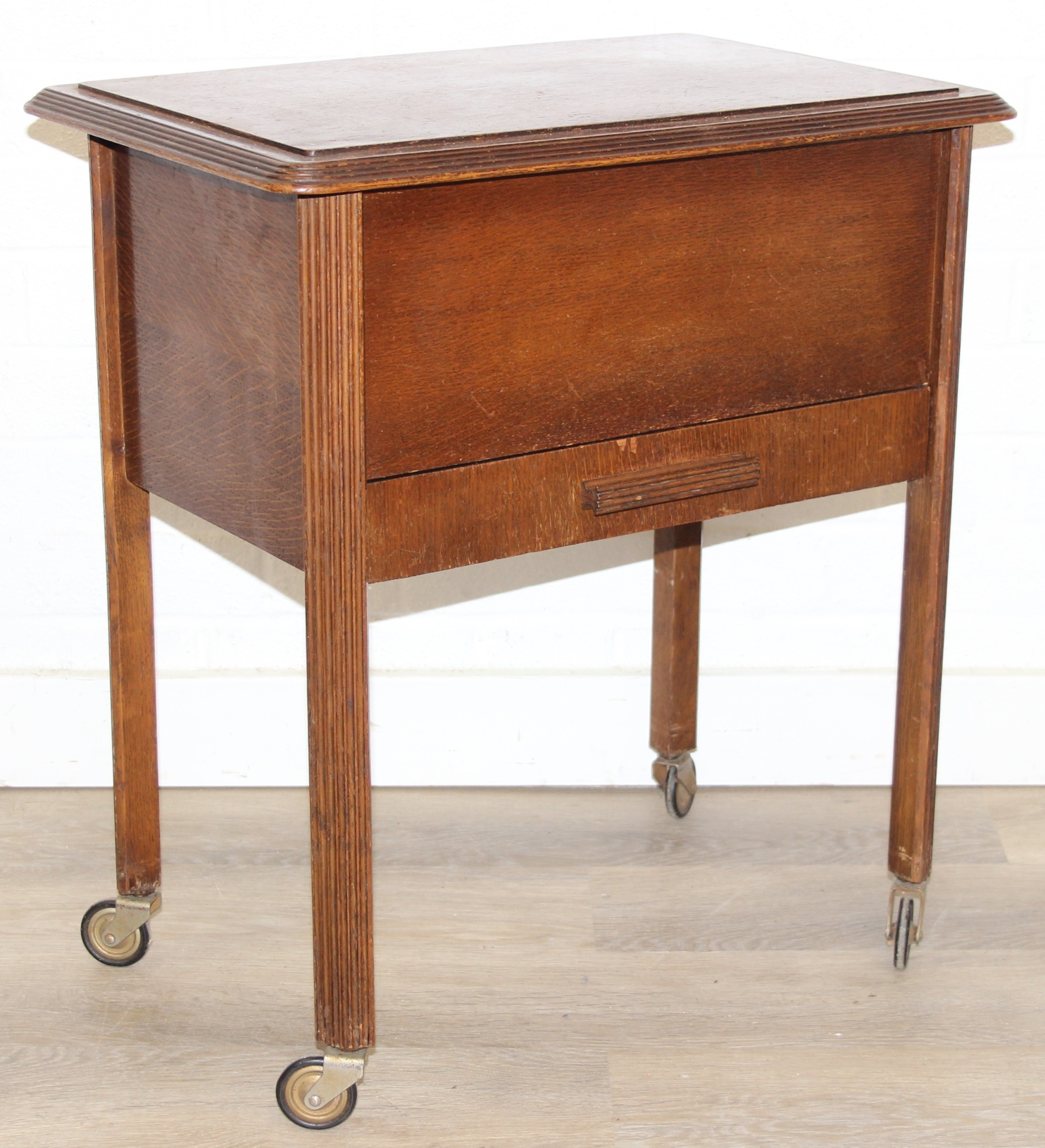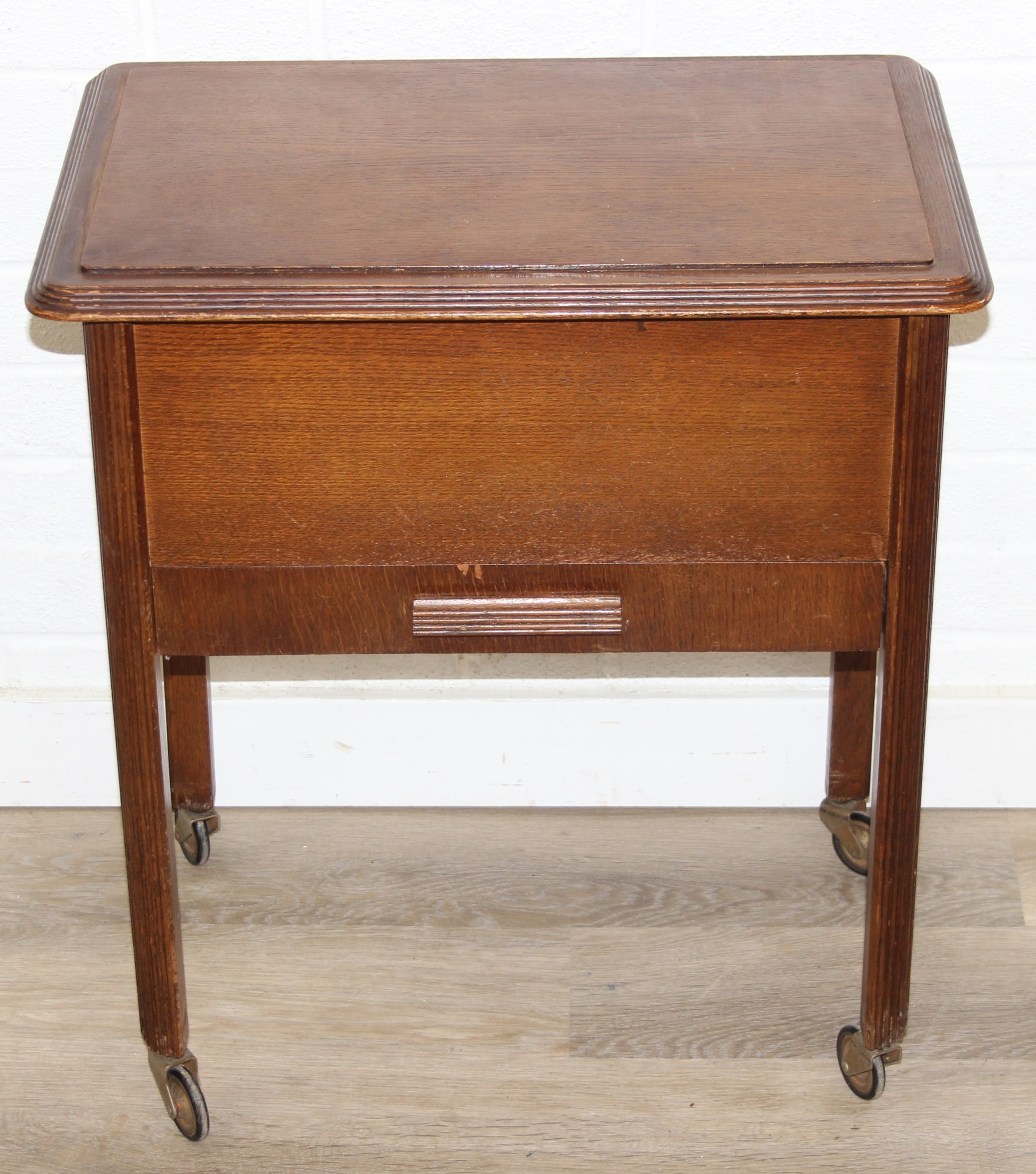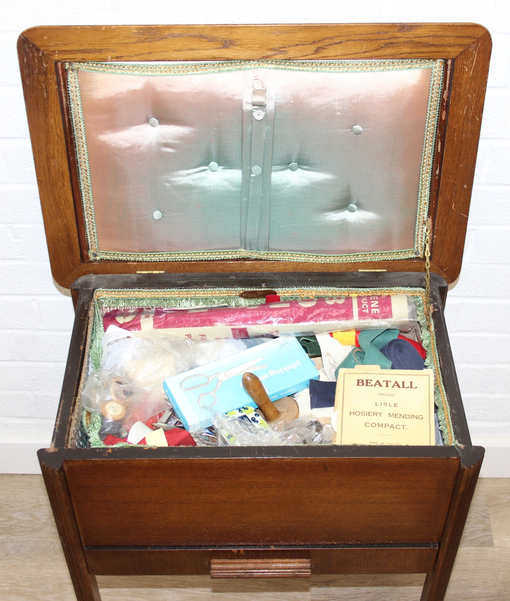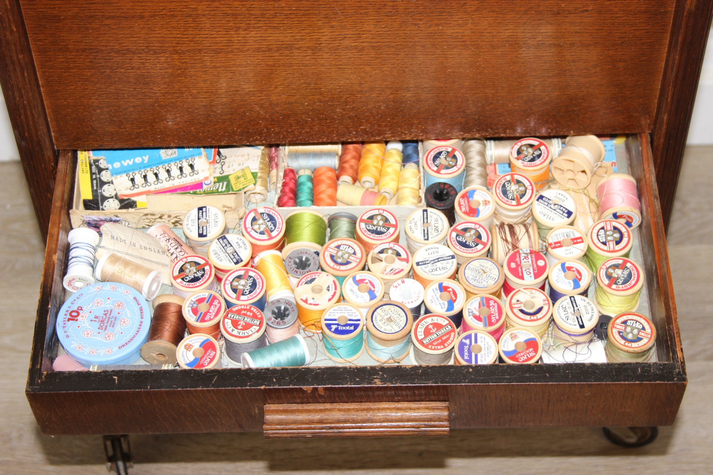 A vintage oak sewing box on wheels with vintage contents inc cotton reels, 56cm x 37cm x 62cm