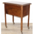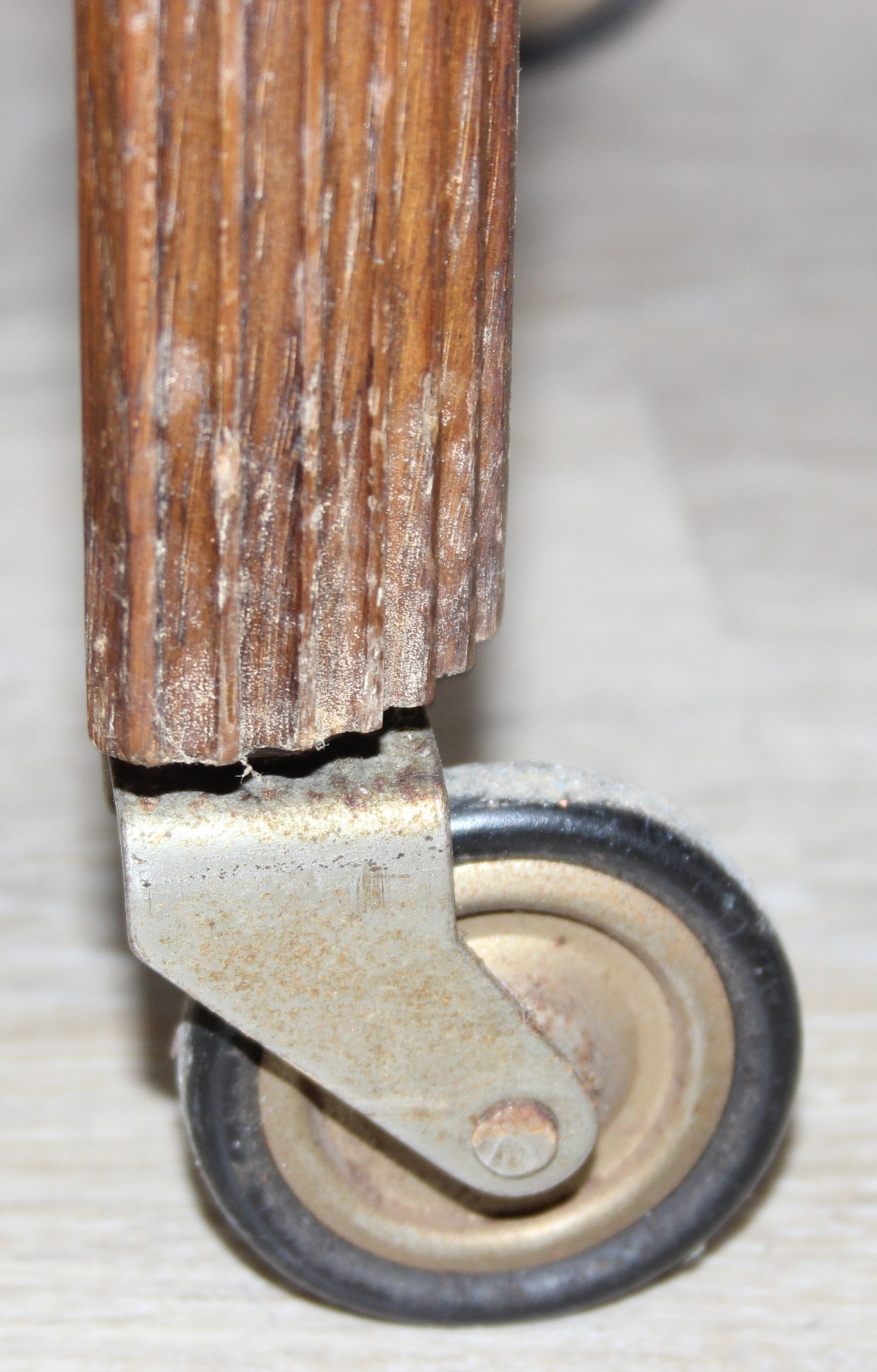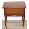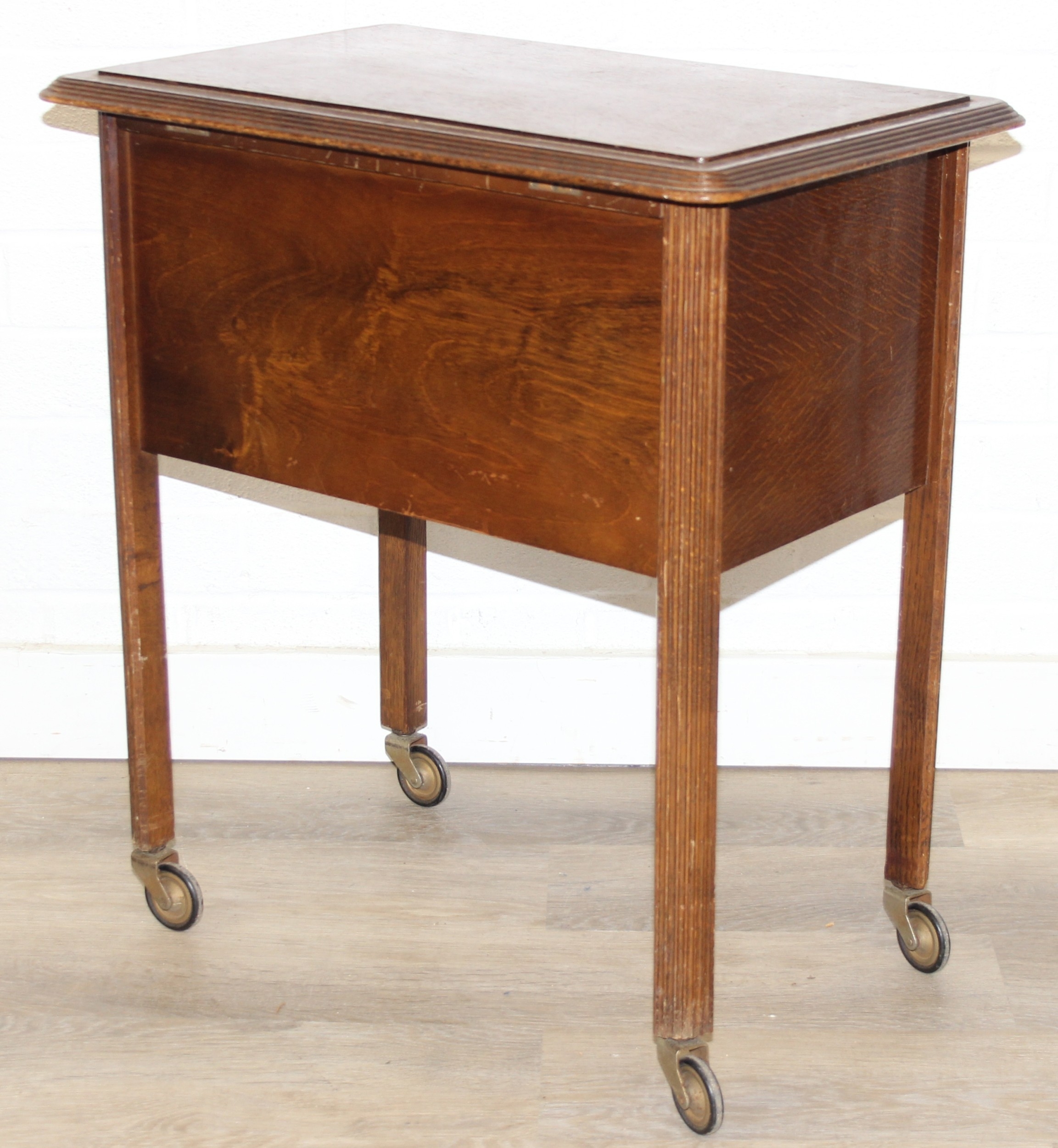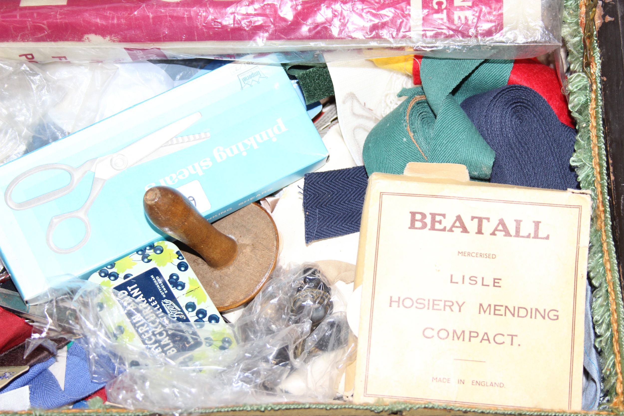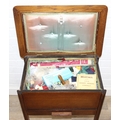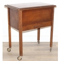 A vintage oak sewing box on wheels with vintage contents inc cotton reels, 56cm x 37cm x 62cm
