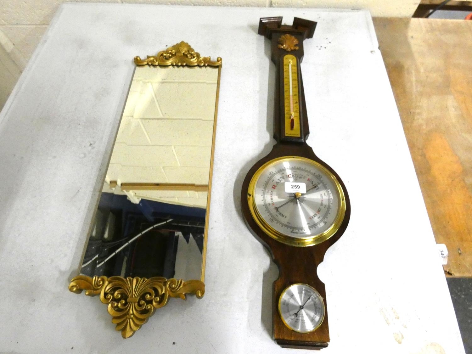 Modern wall mirror and mahogany barometer.