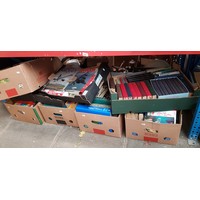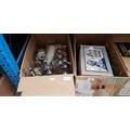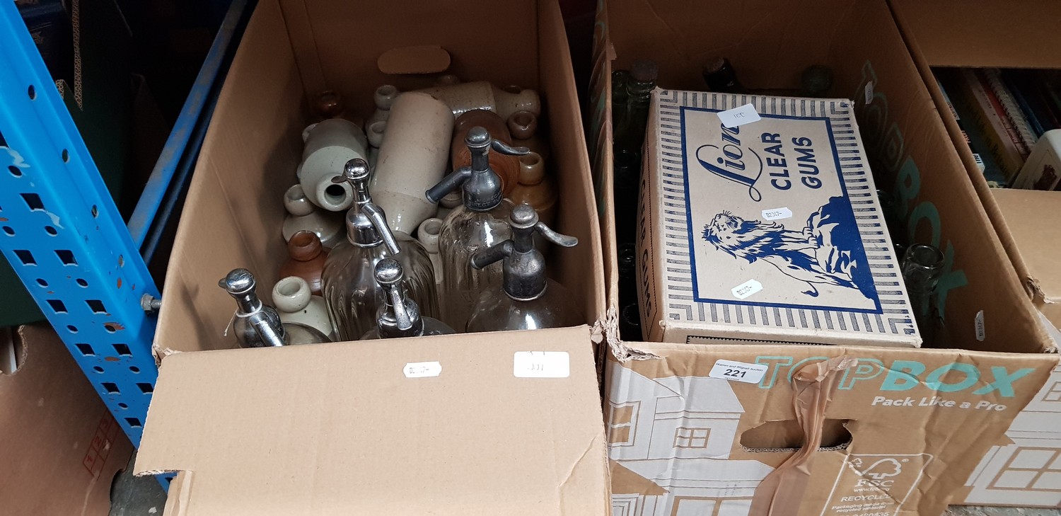 Three boxes of glass bottles, soda syphons, small stoneware jars, Preston inscribed bottles, eye wash glasses etc