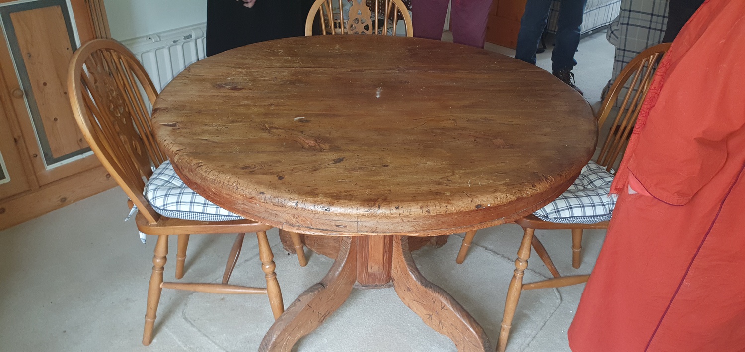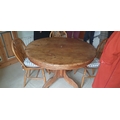 A pine dining table, with circular top on central column and four wheelback chairs -