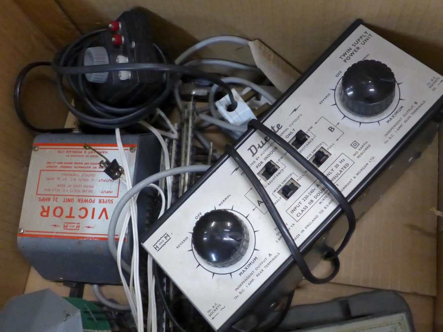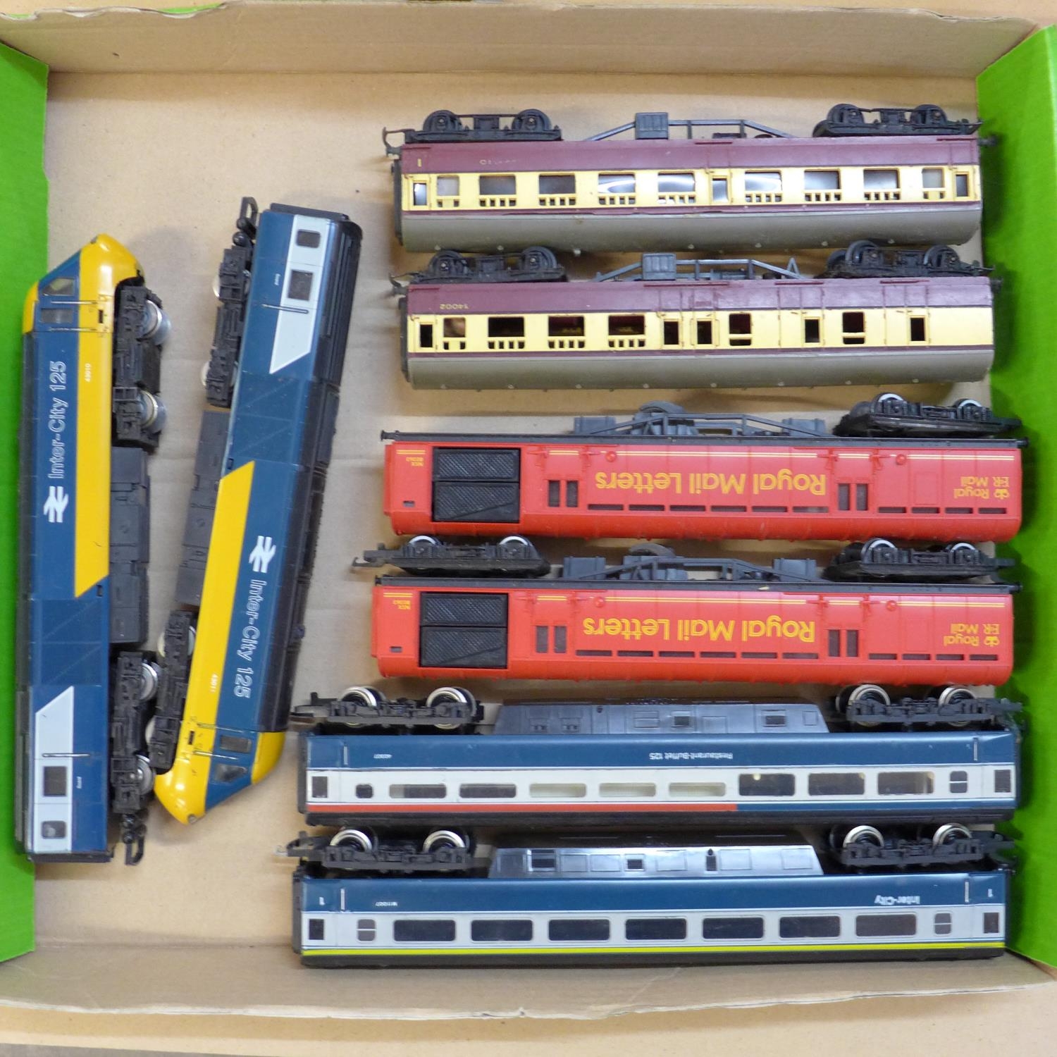 An Inter-City 125, model rail train set with three 00 gauge, a Duette twin power supply unit, six coaches and buildings and accessories