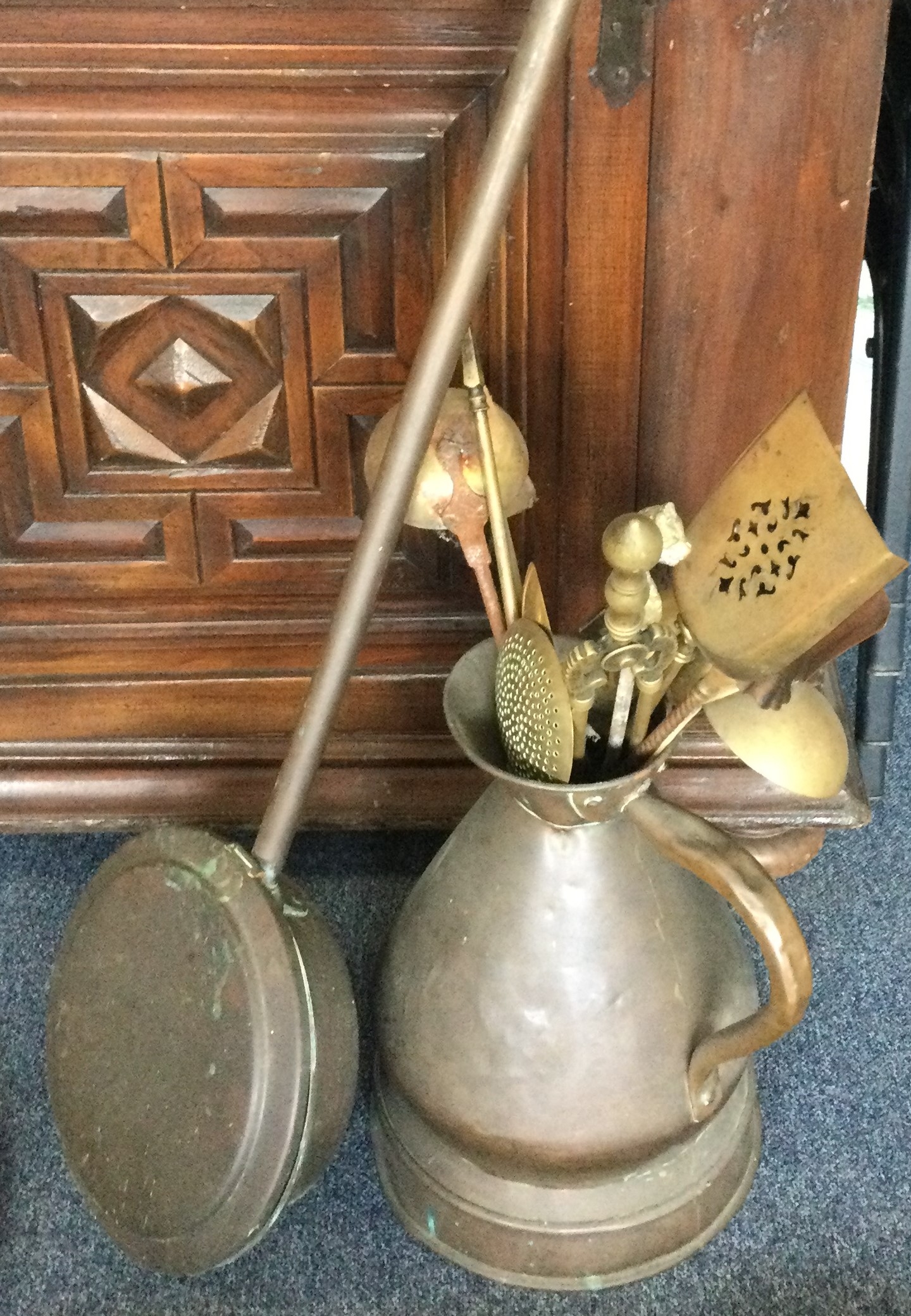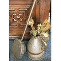A large copper warming pan together with a coal skuttle etc. Est. £20 - £30.