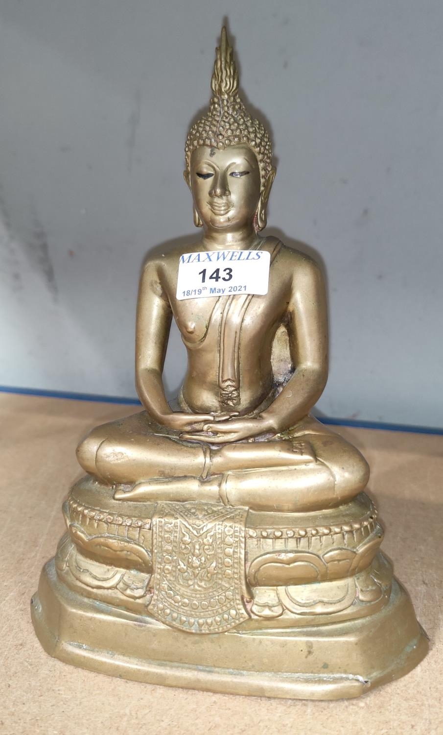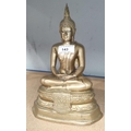 A brass Tibetan Buddha sitting in the Lotus position, with hands clasped, having original prayers (a.f.)