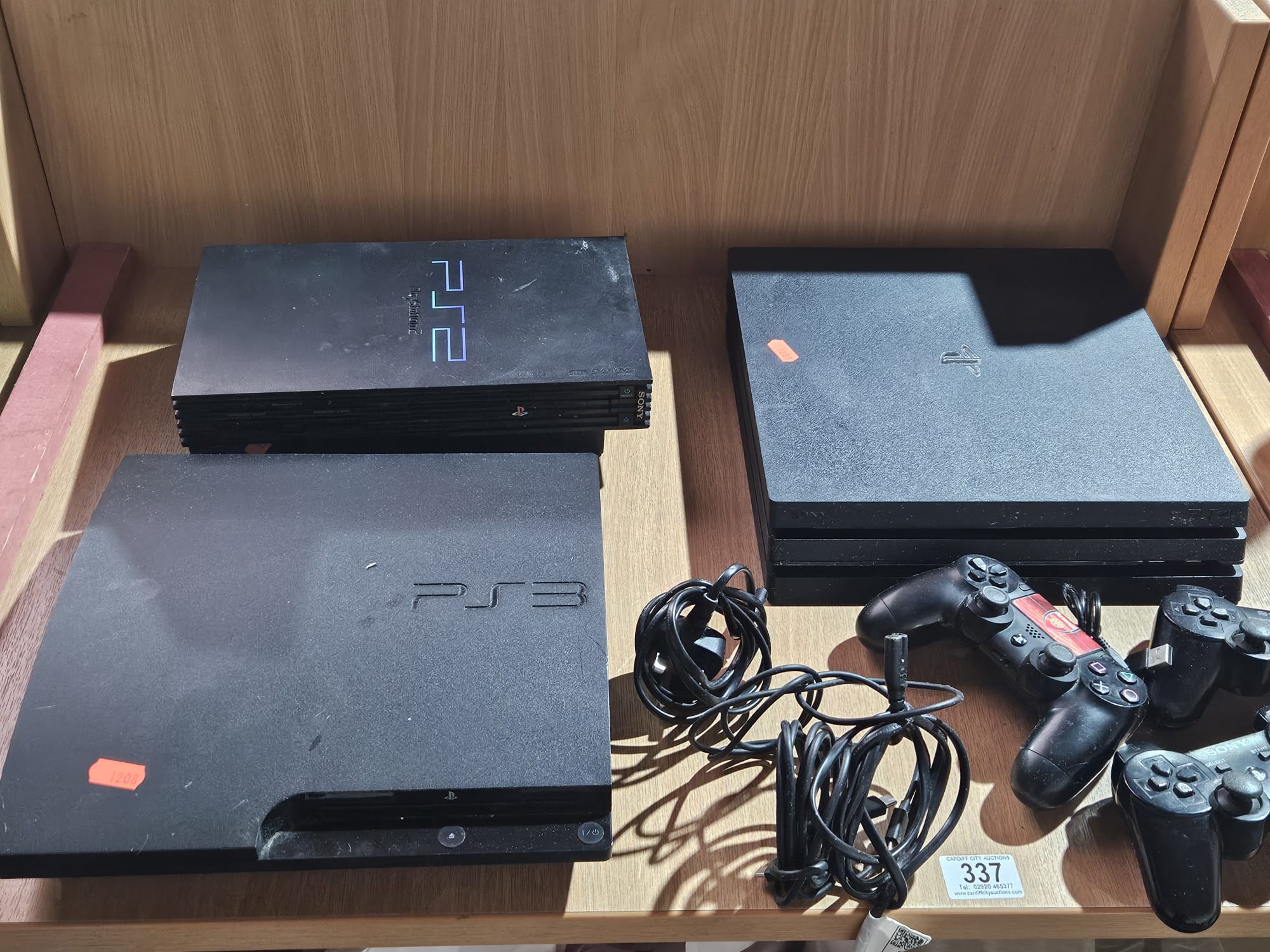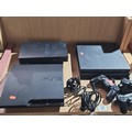 Three playstation consoles with controllers, etc