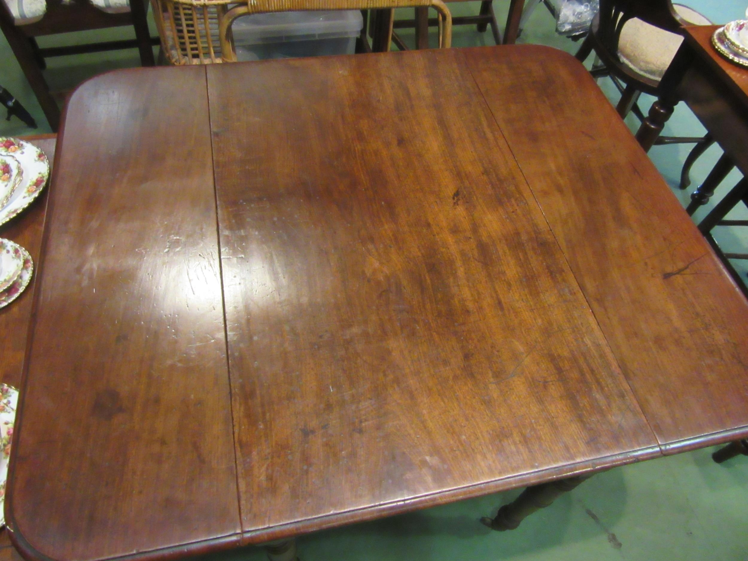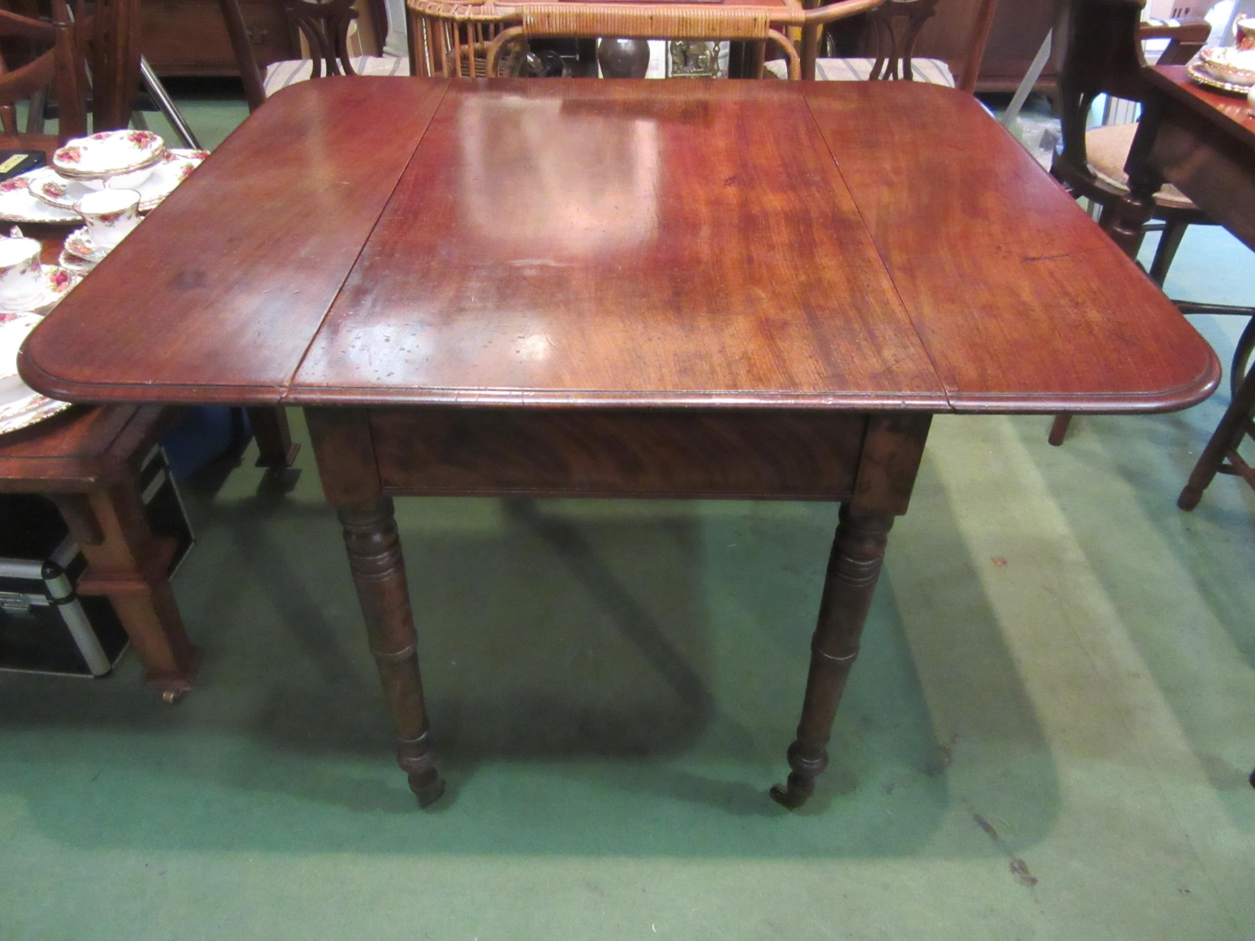 A 19th Century mahogany Pembroke table on turned legs to brass castors, 70cm tall x 111cm long x 96cm wide including flaps