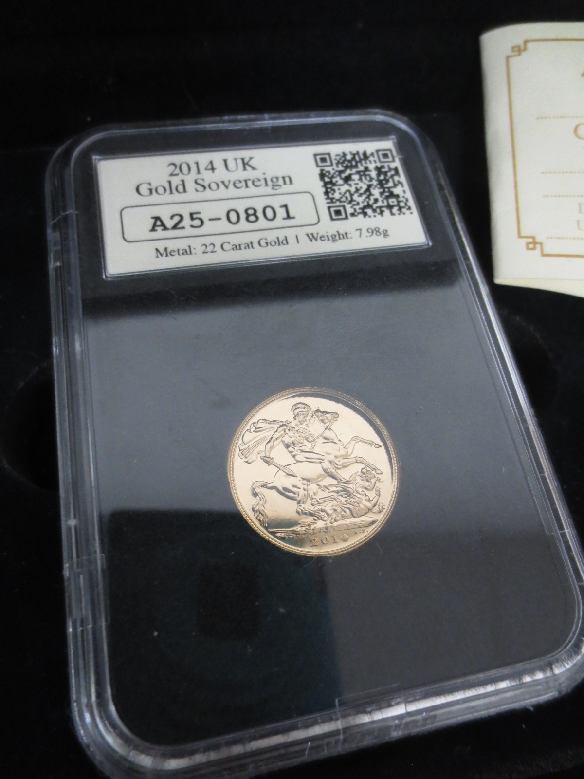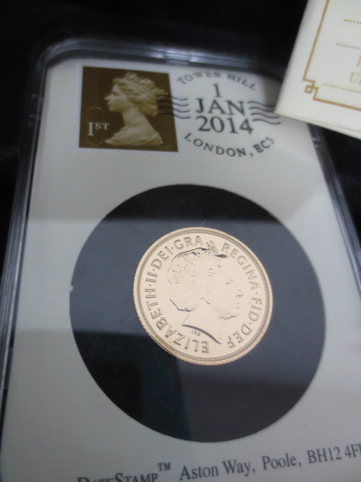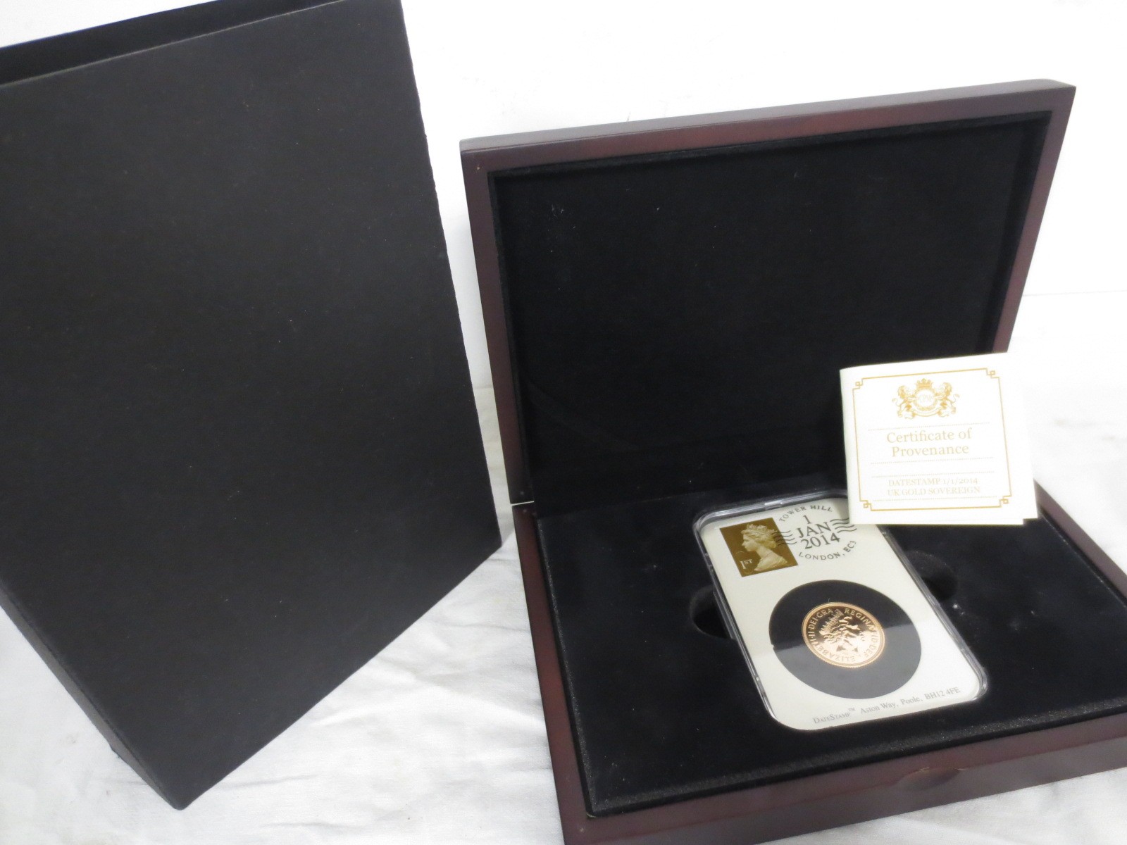 A dated & stamped 1st January 2014 Queen Elizabeth II gold sovereign, encapsulated and in wooden presentation case with outer cardboard sleeve, mint condition - Buyer's commission 10% only on this lot.