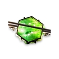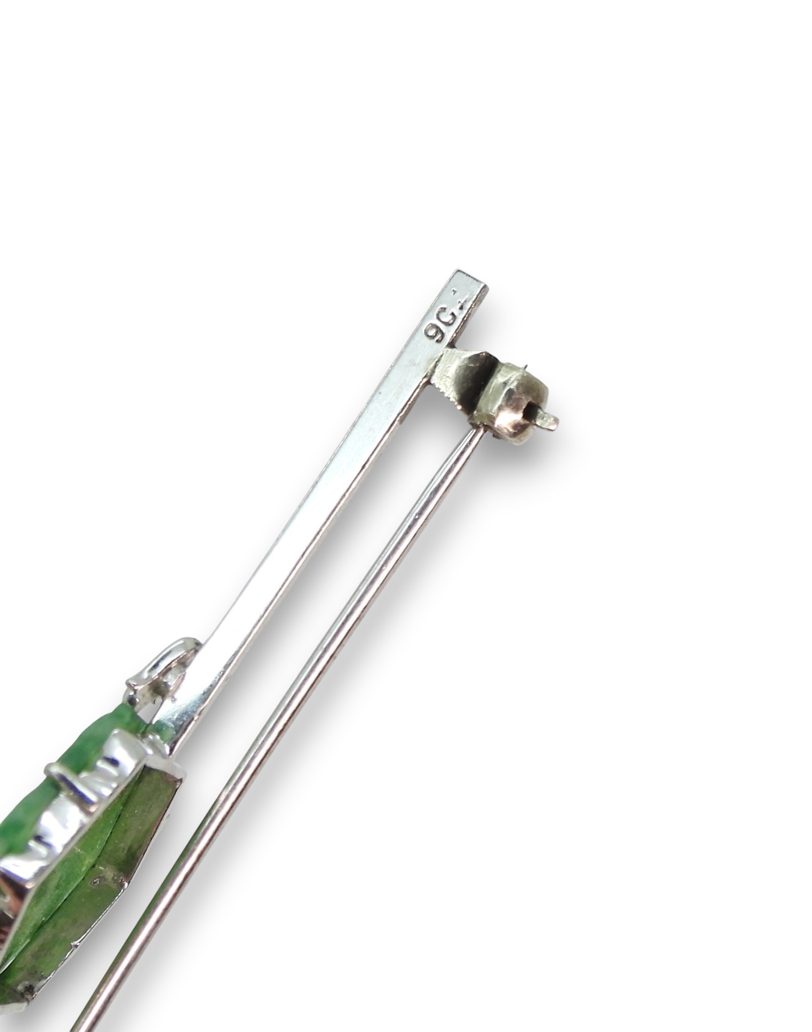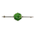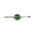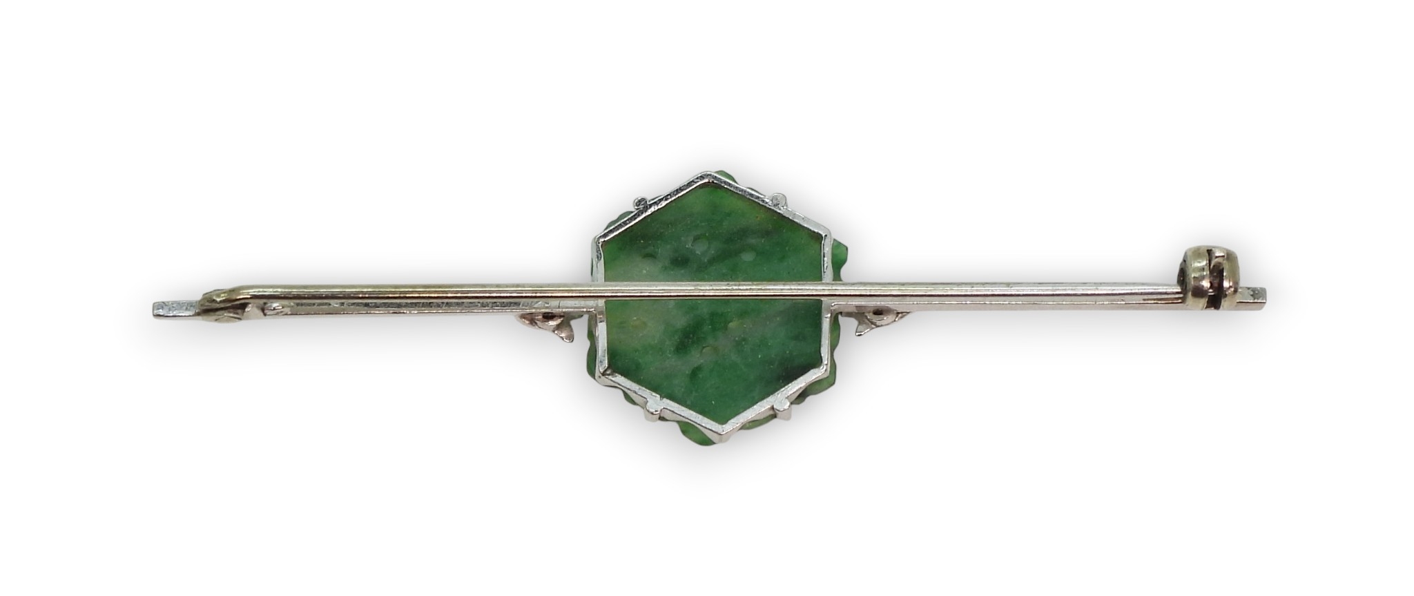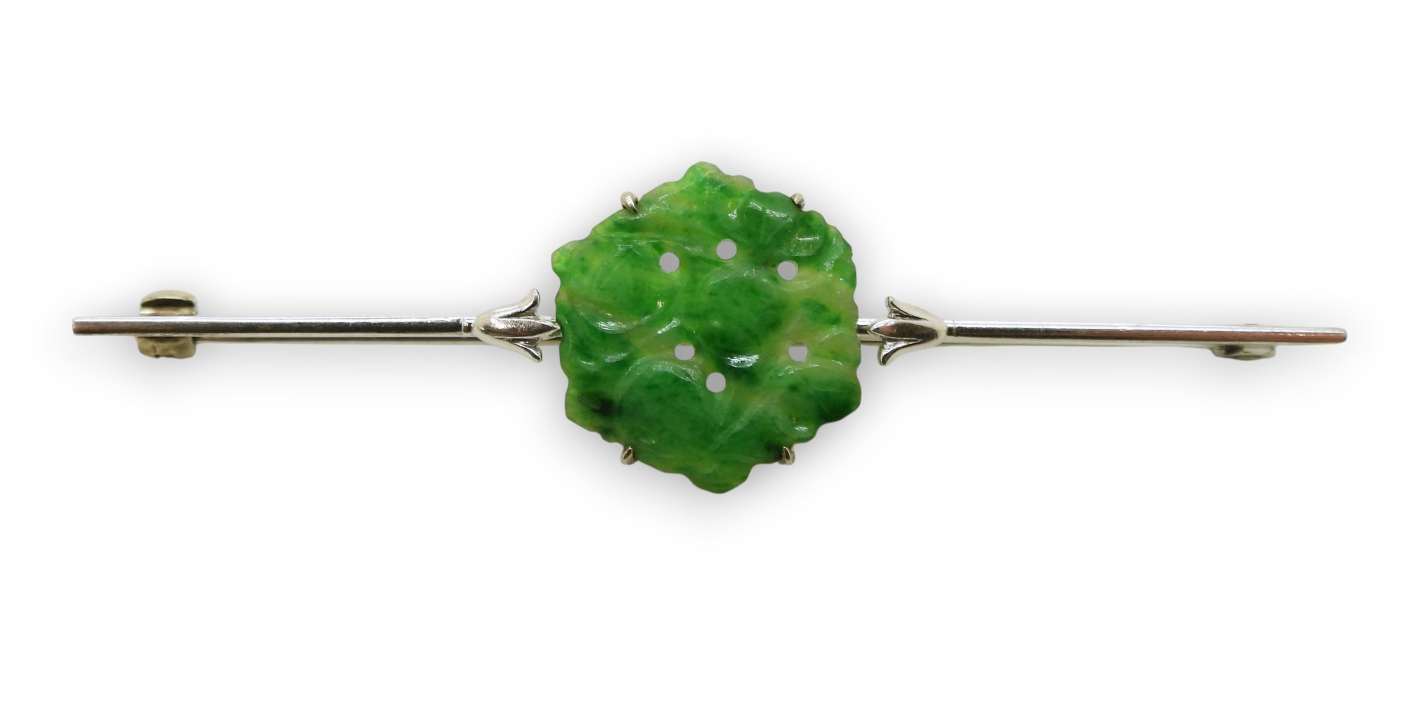 A 9ct white gold bar brooch set with a Chinese green hardstone panel carved with fruit & foliage. Diameter of the panel 14.3mm, length of brooch 6.3cm, weight 3.1gms