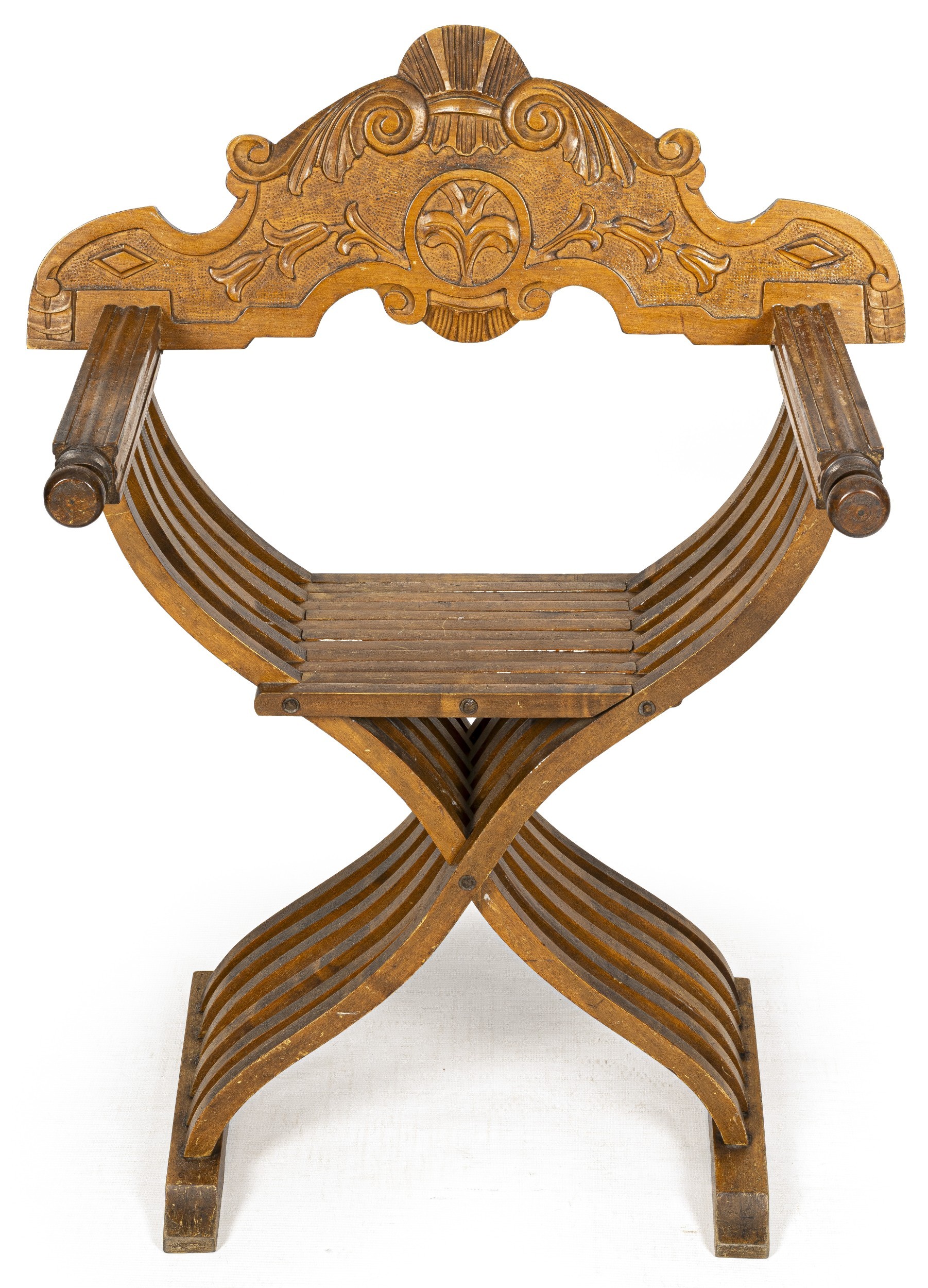 The hand carved back rest with scroll and foliate motifs centered by a stylized fleur-de-lis design with interlaced slats forming an X-frame, base and seat on sled feet