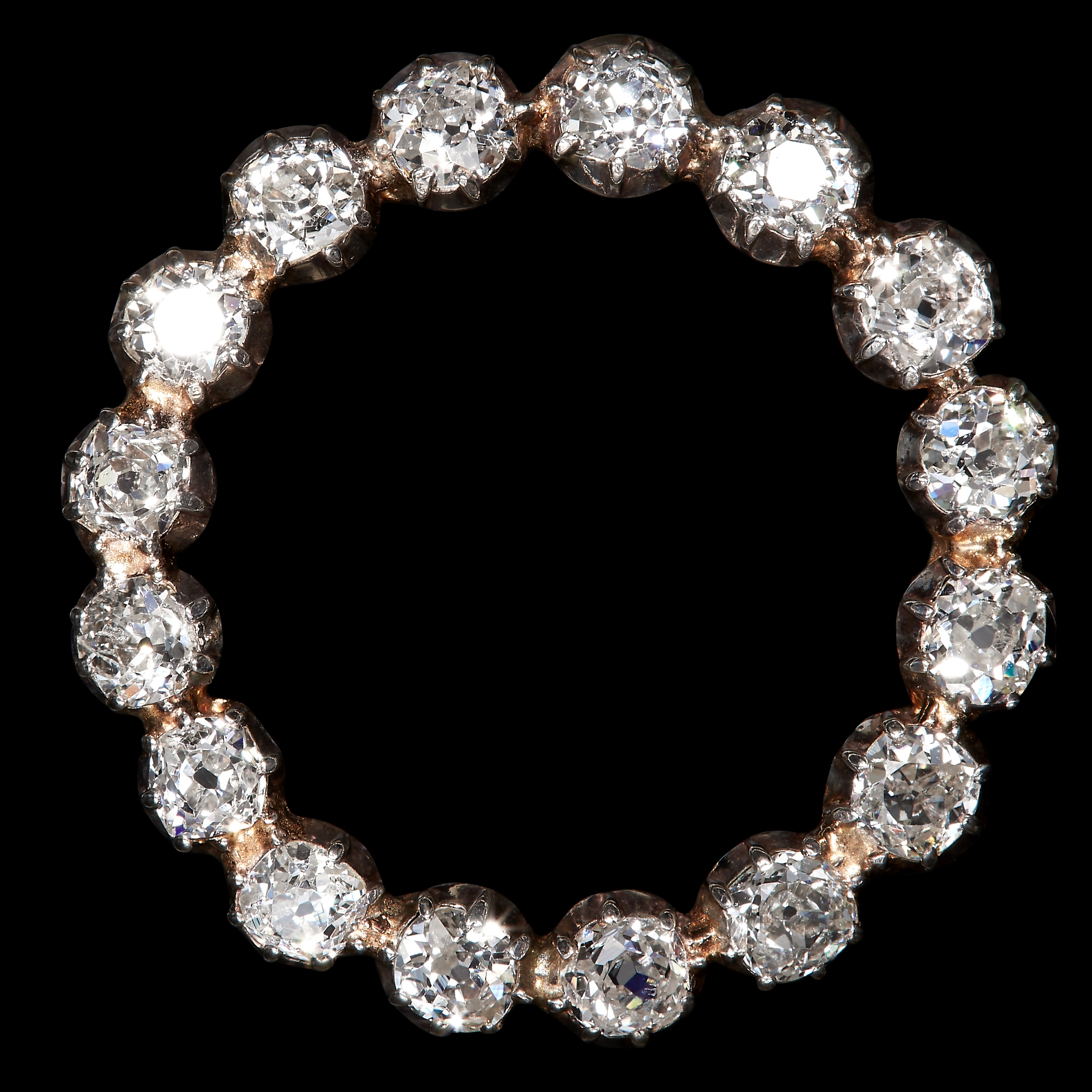 FINE DIAMOND BROOCH, of circular design. Set with bright and lively old cut diamonds totalling approx. 3.50 ct. Diam. 3 cm. 5 grams.