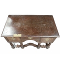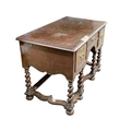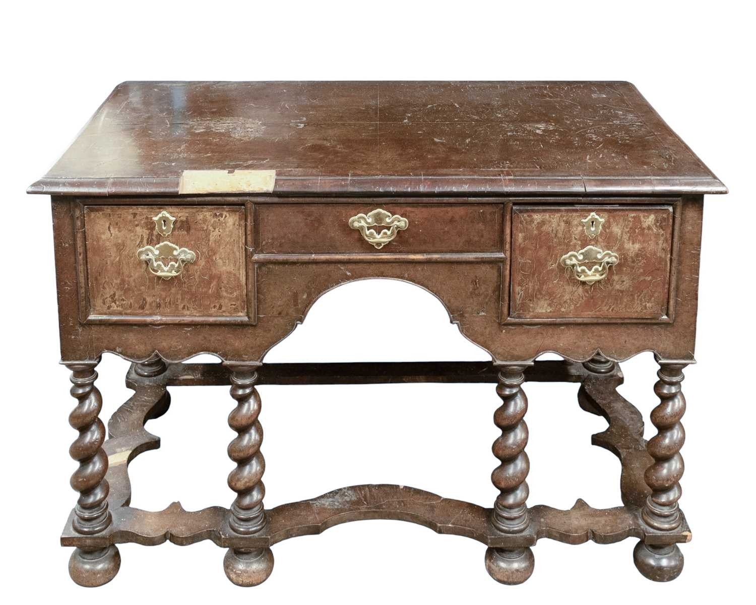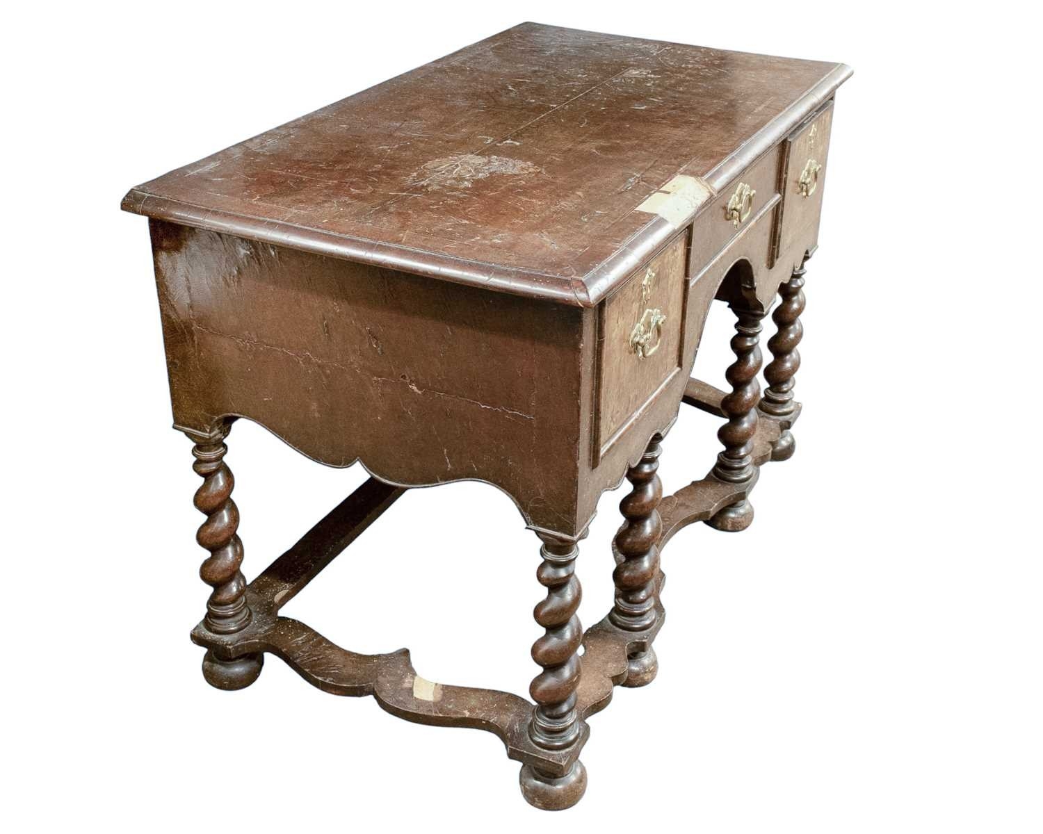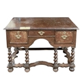 A William and Mary style walnut side table. 18th/19th century, with a quarter veneered top above three drawers, raised on six barley twist supports united by wavy stretchers, height 77cm, width 113cm, depth 62cm.