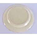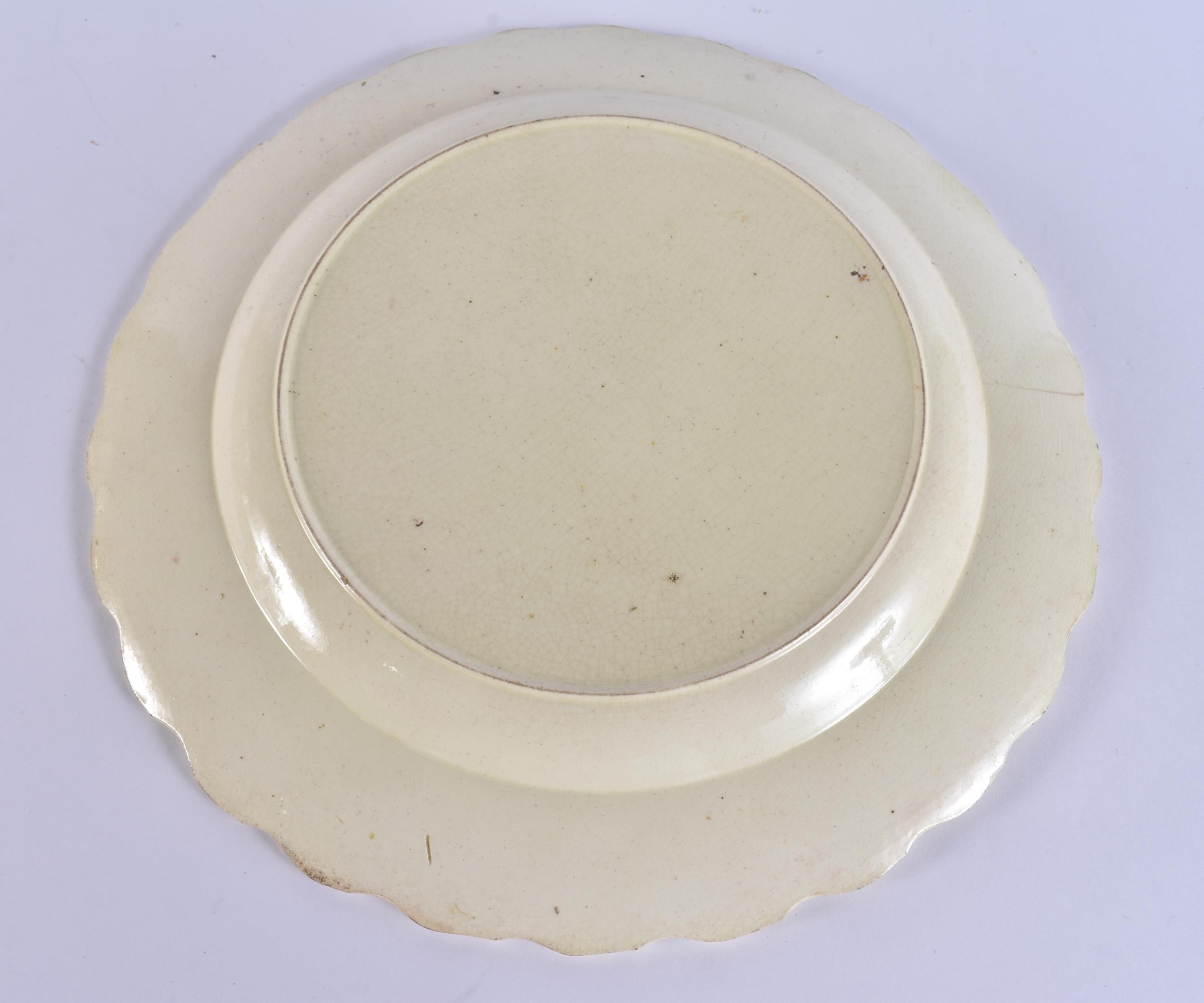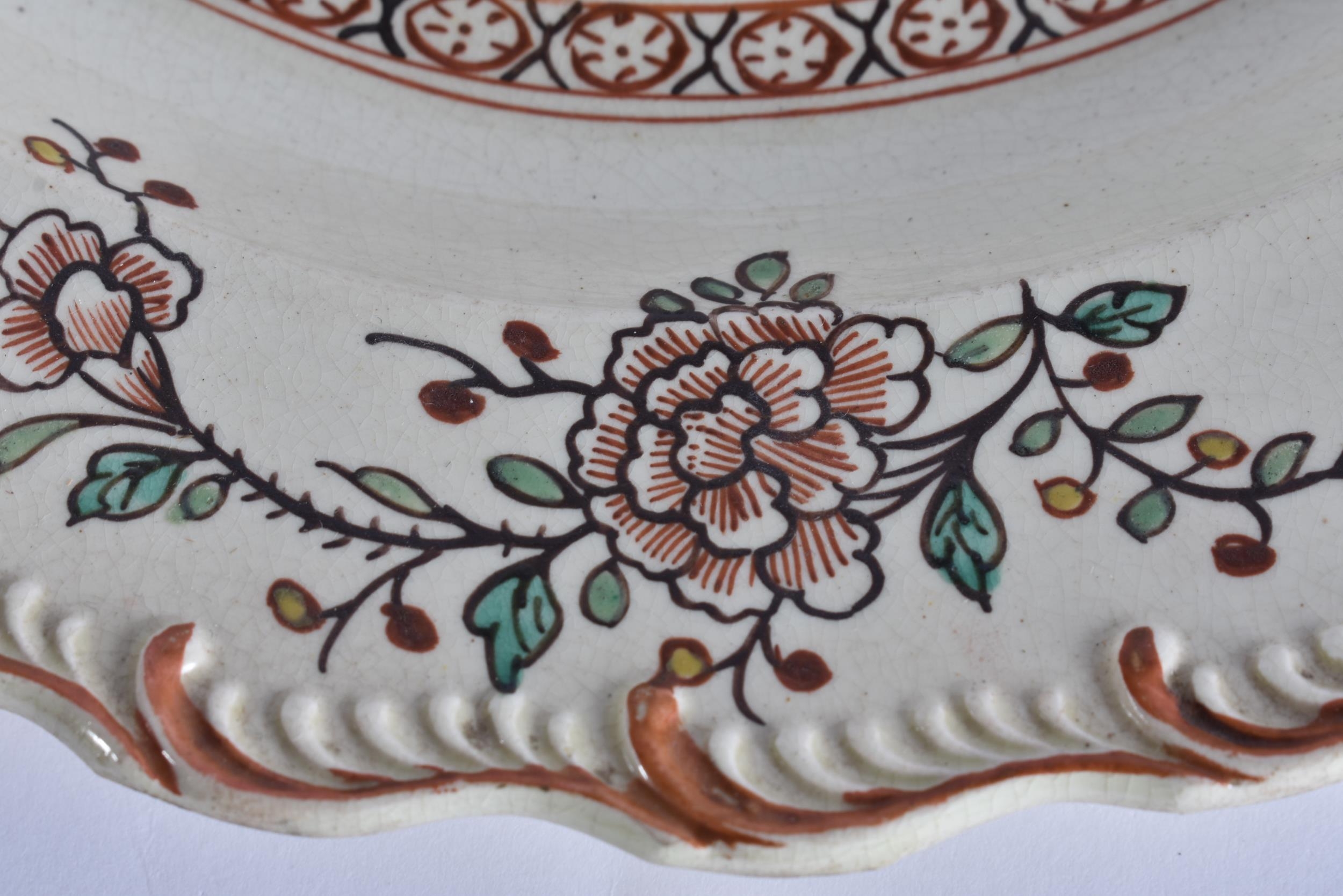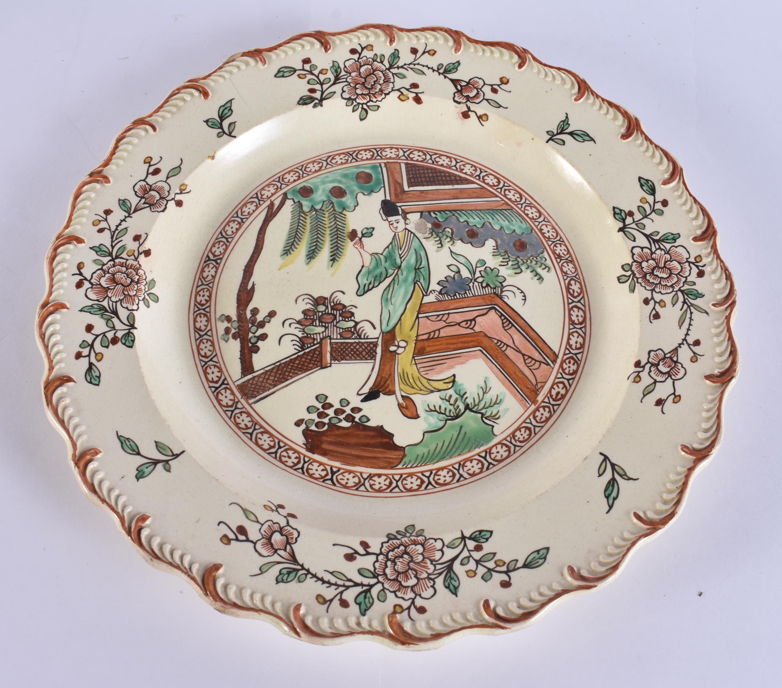 A LATE 18TH/19TH CENTURY ENGLISH CREAMWARE SCALLOPED PLATE painted with an Oriental figure holding a flower. 24 cm wide.