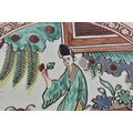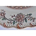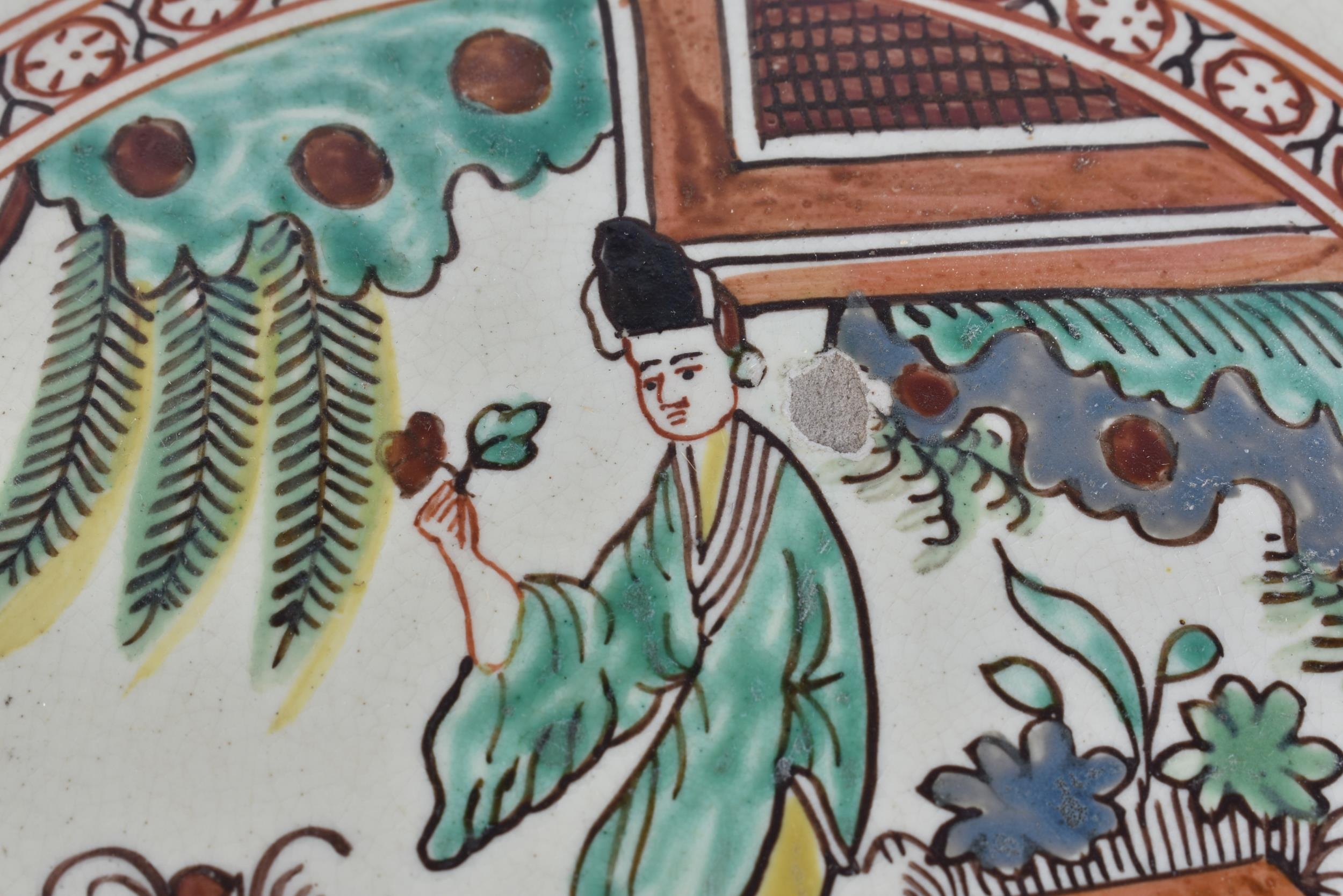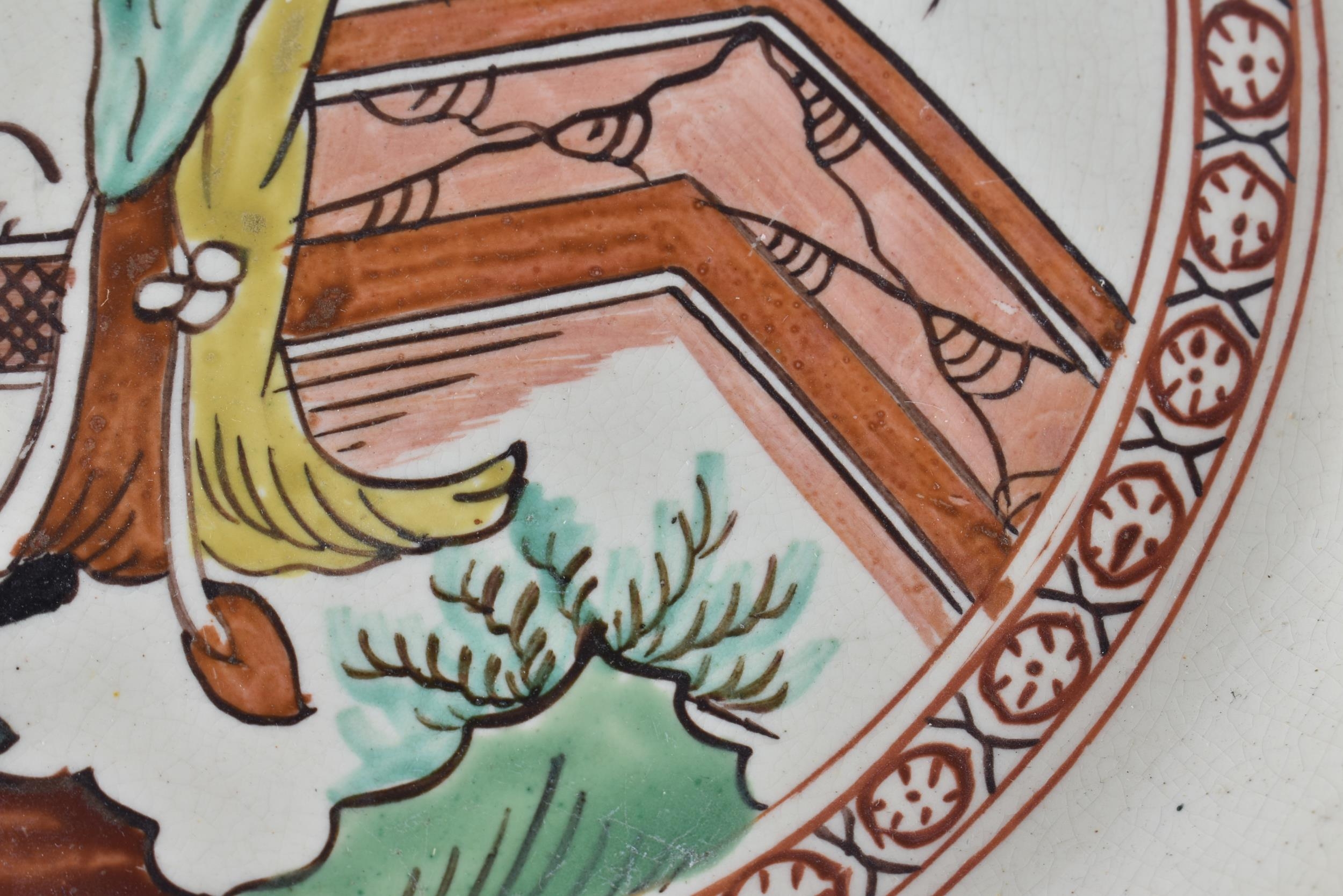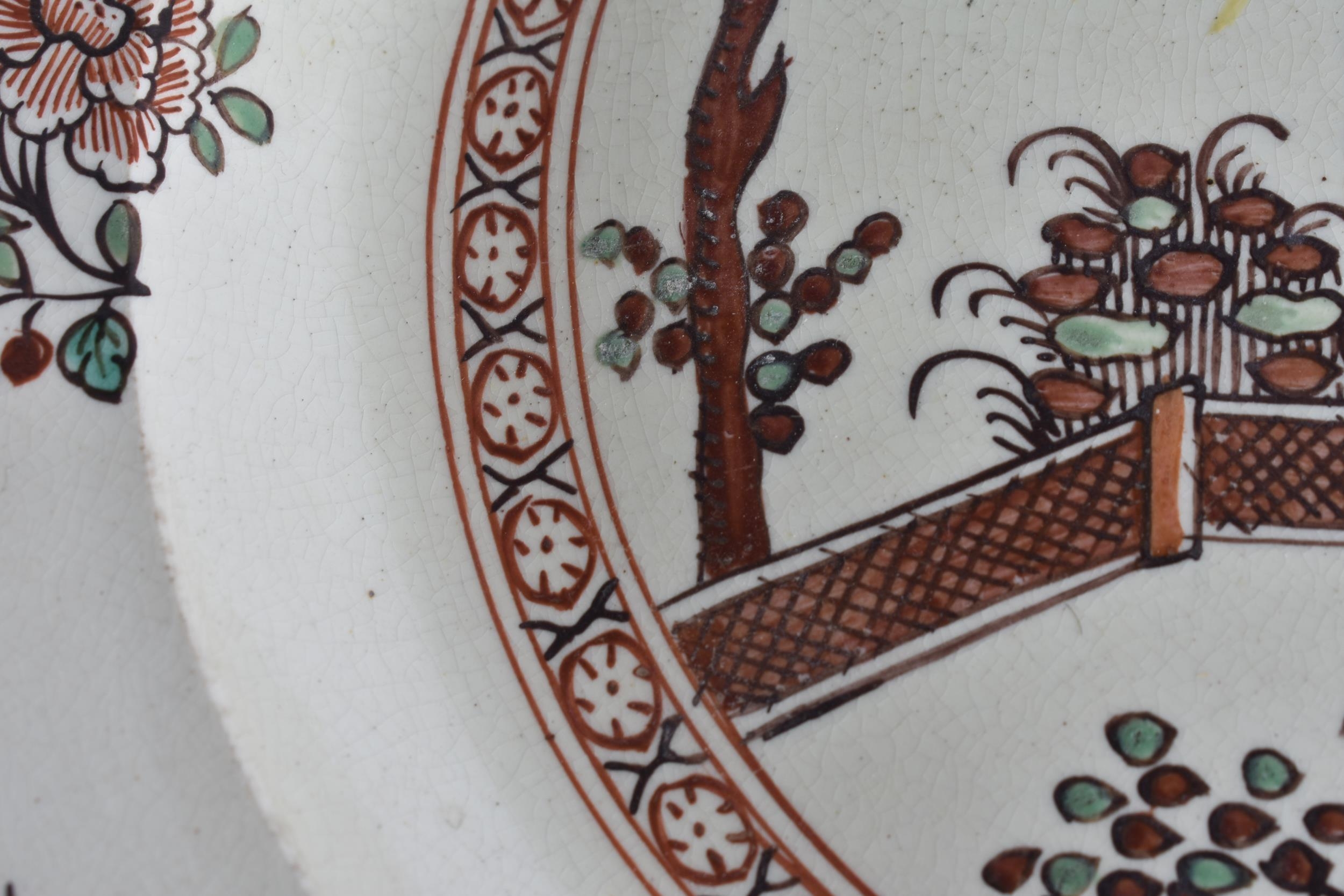 A LATE 18TH/19TH CENTURY ENGLISH CREAMWARE SCALLOPED PLATE painted with an Oriental figure holding a flower. 24 cm wide.