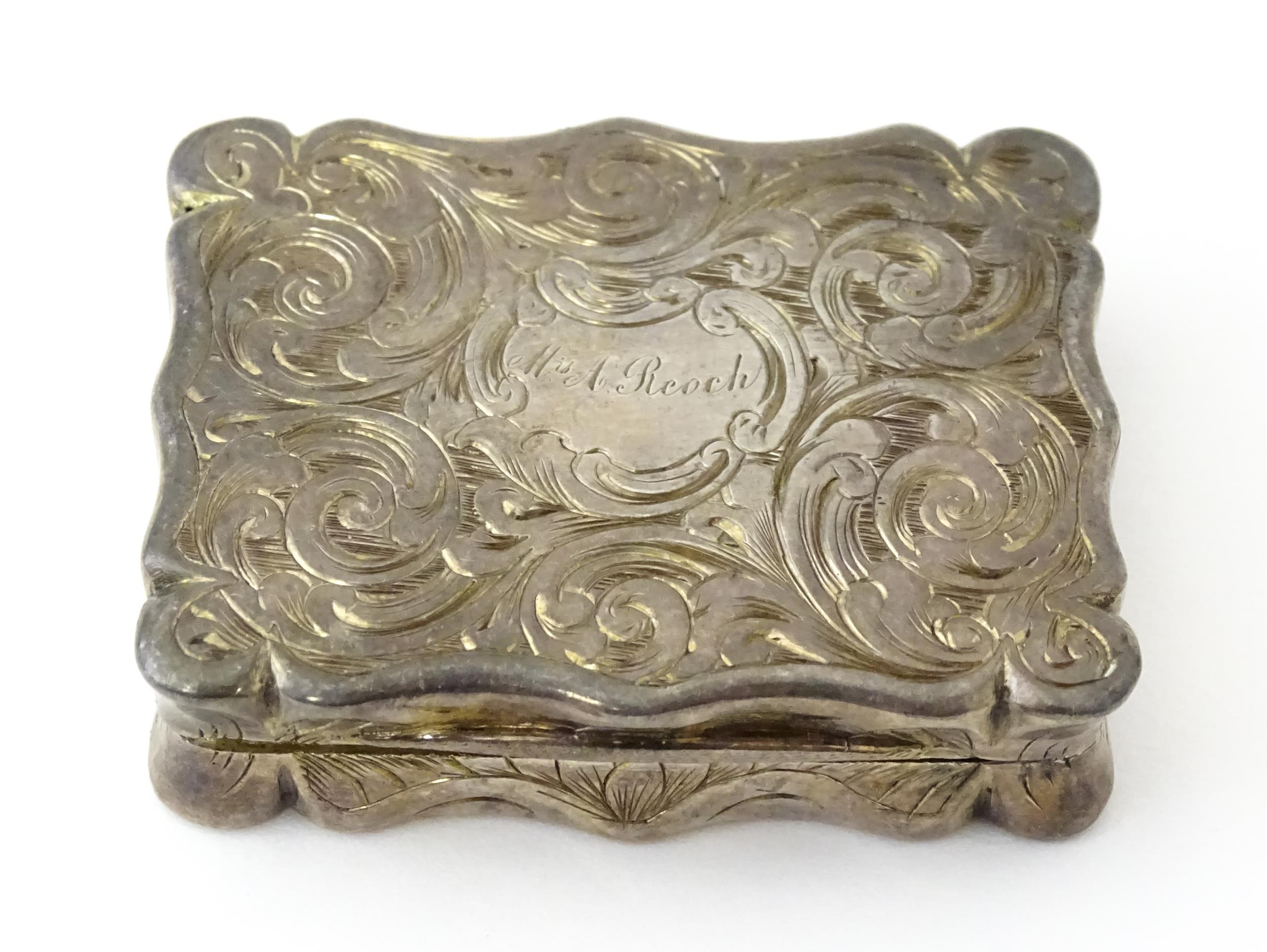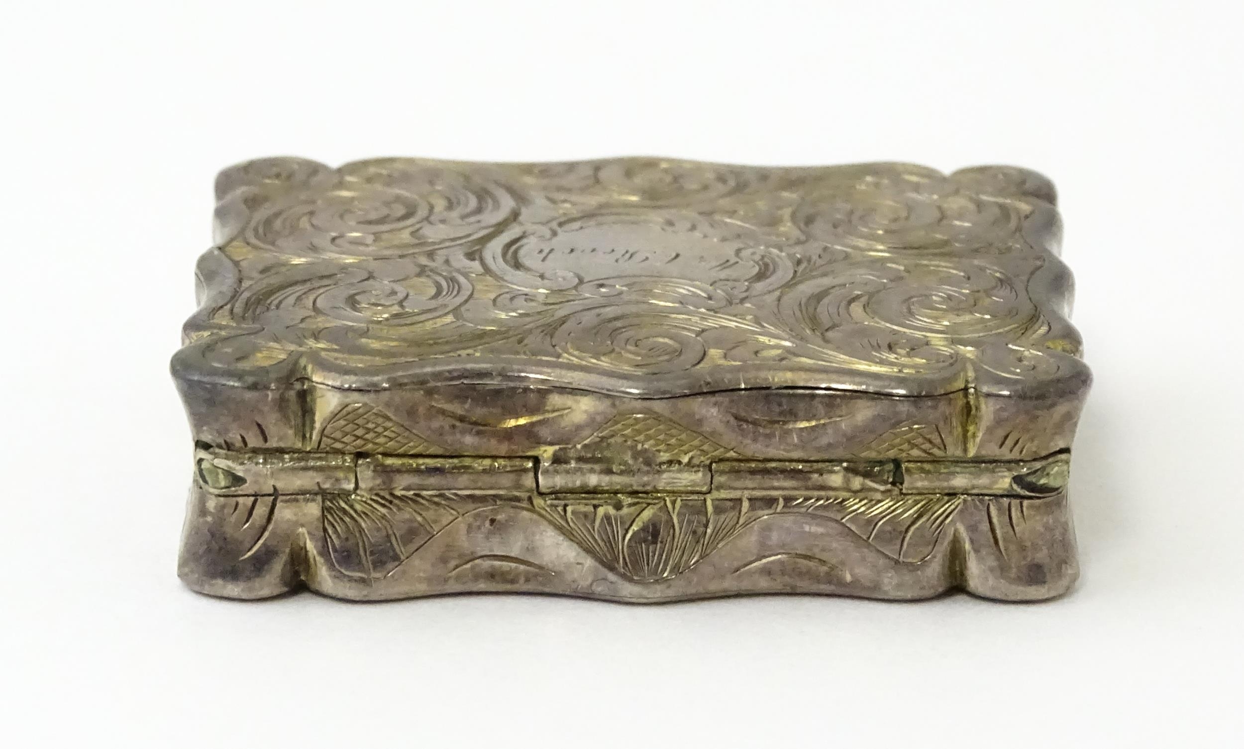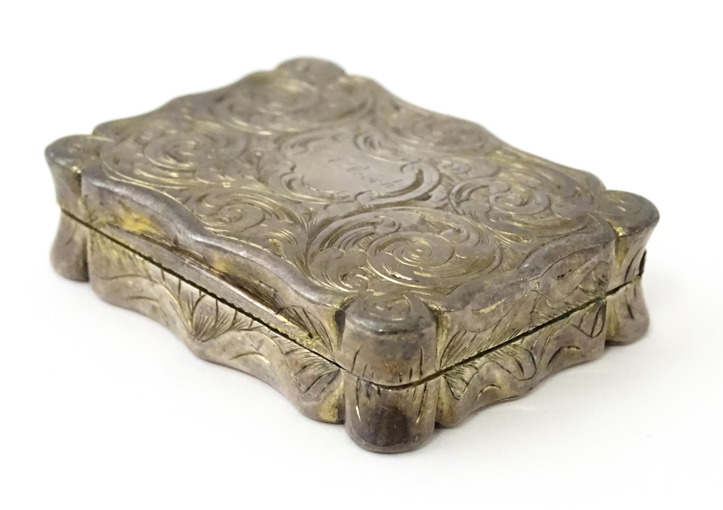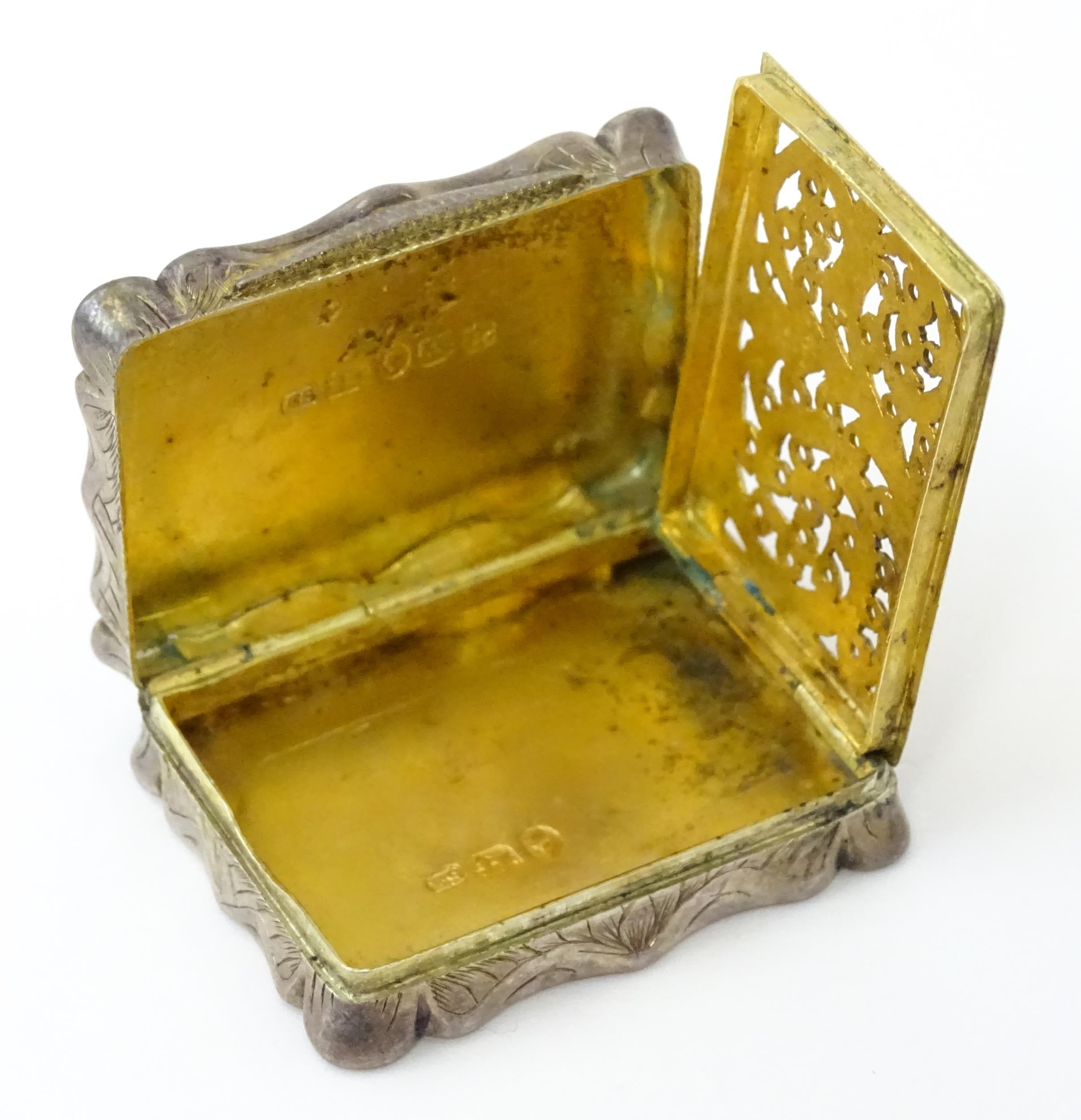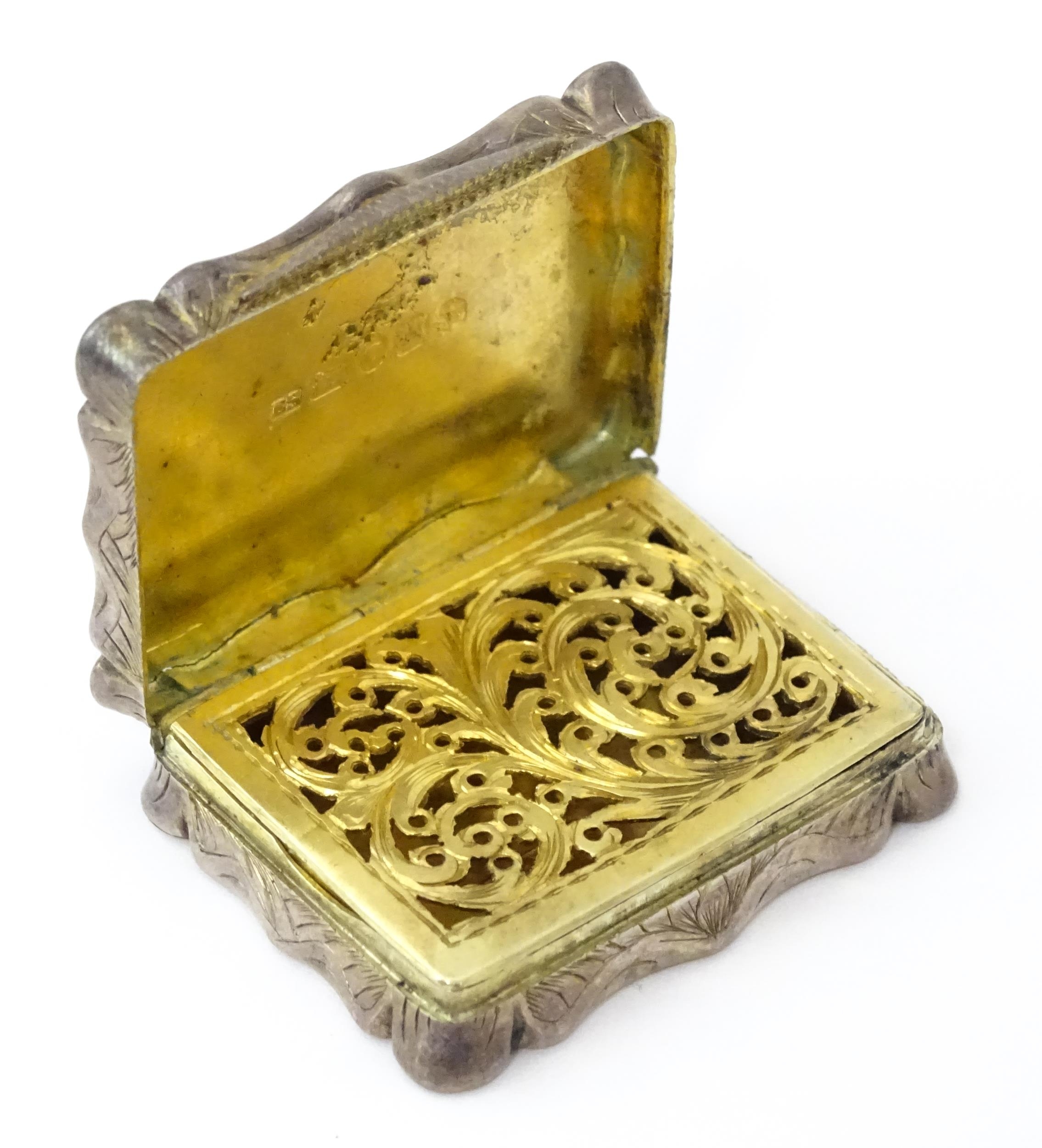 A large Victorian silver vinaigrette with engraved acanthus scroll decoration, gilded interior and pierced grille within, hallmarked Birmingham 1845, maker Edward Smith. Approx. 1 3/4" wide