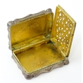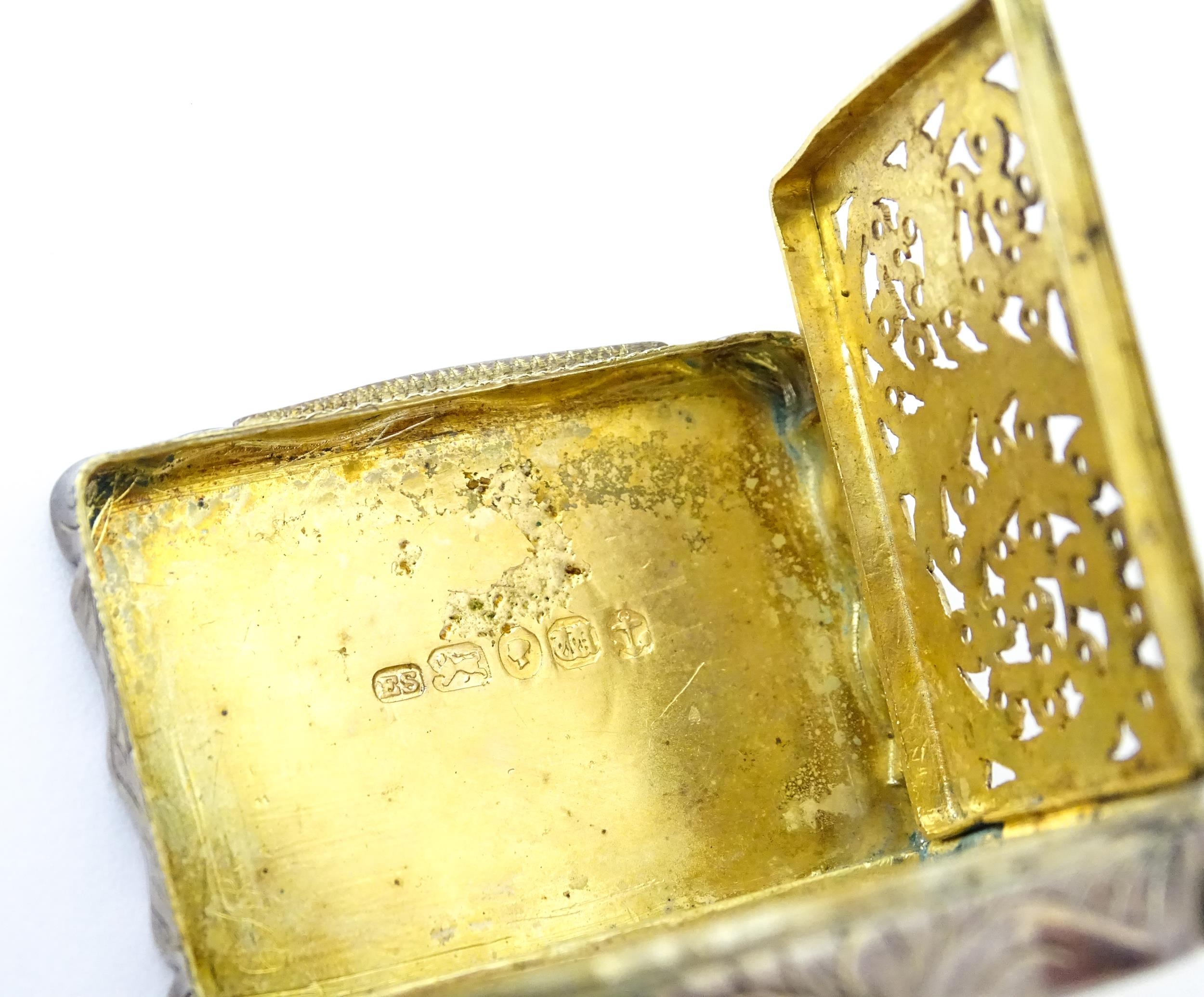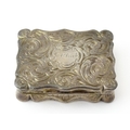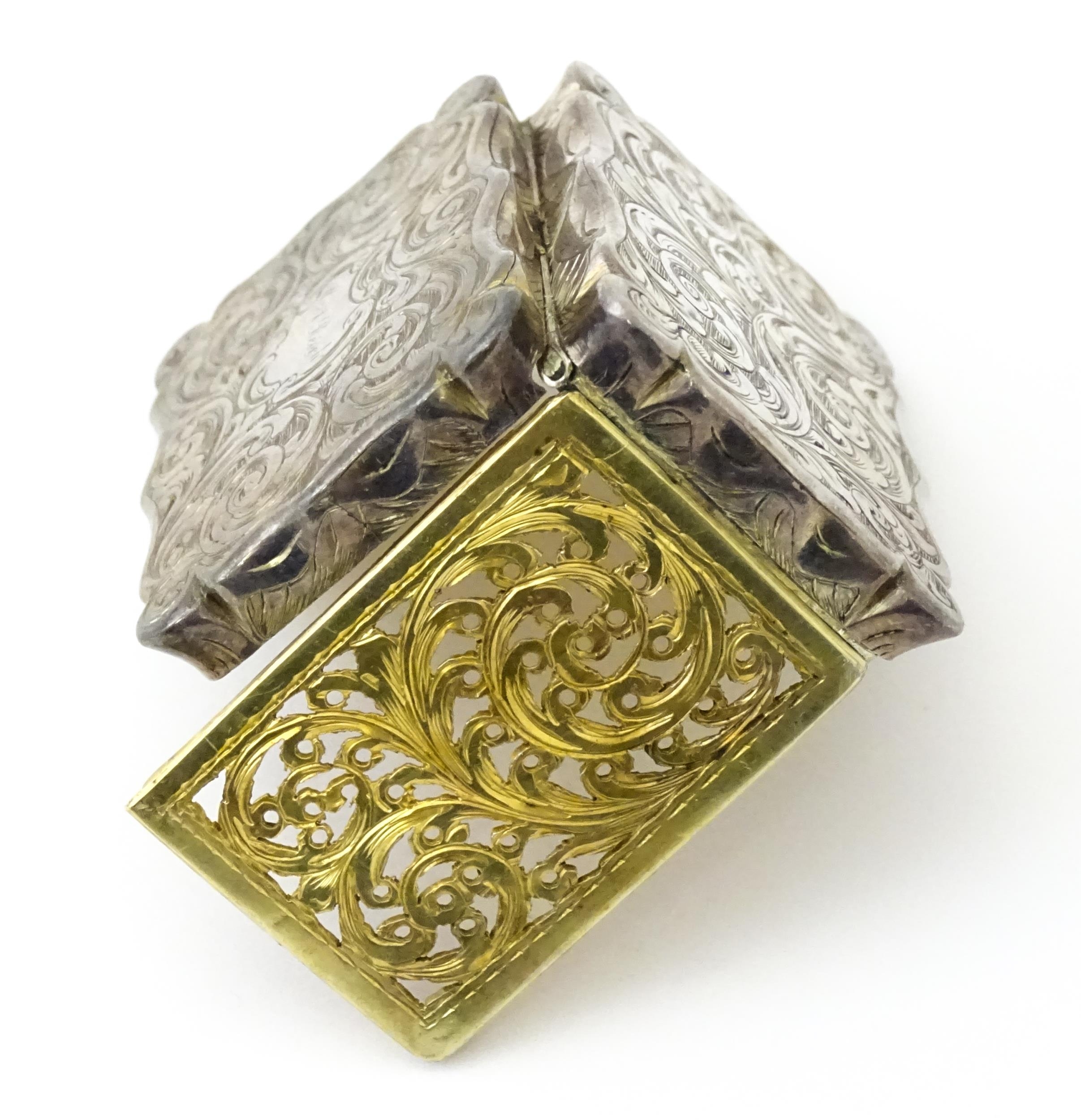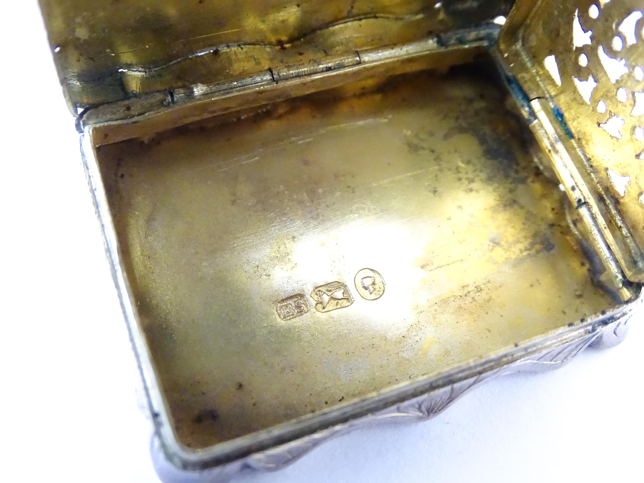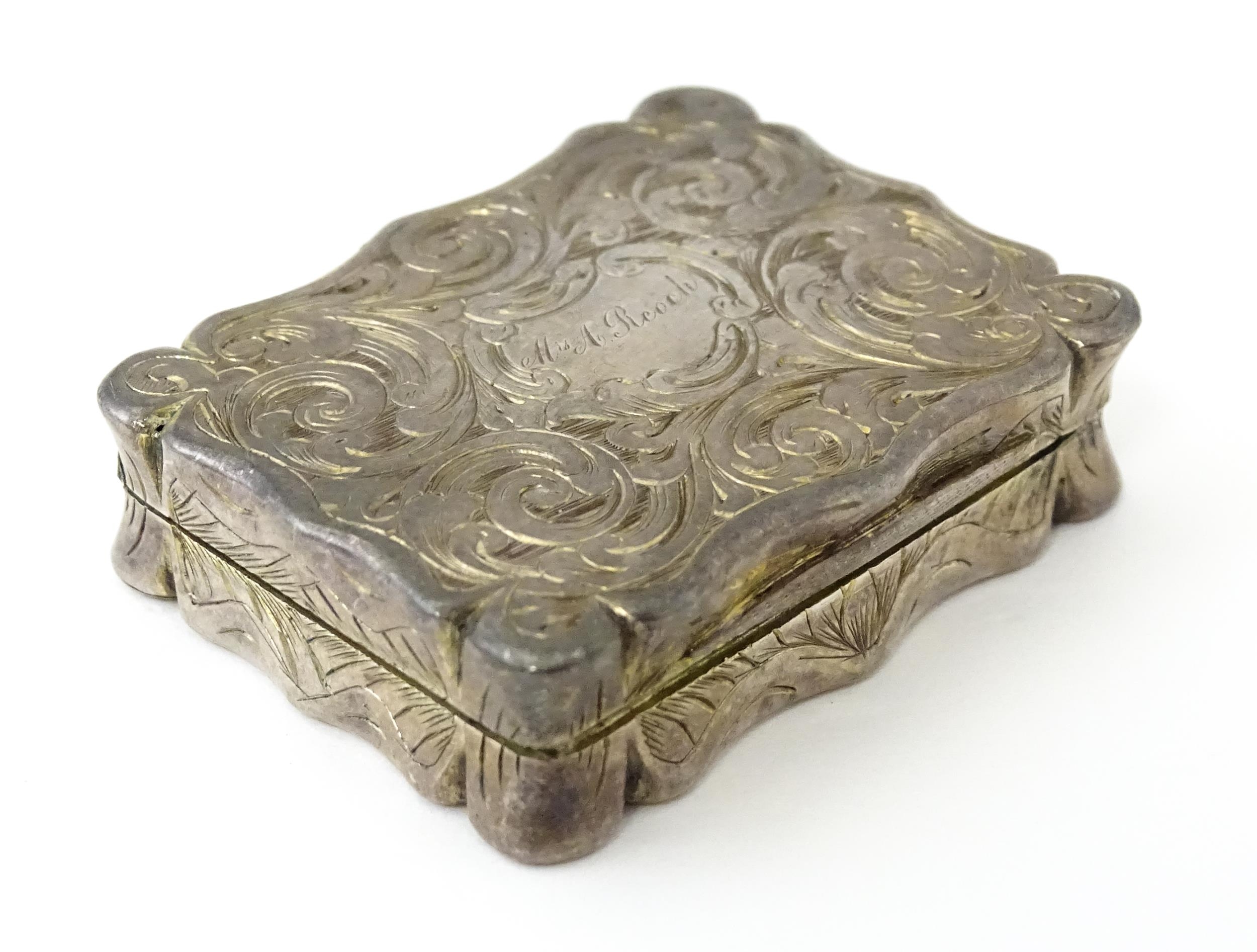 A large Victorian silver vinaigrette with engraved acanthus scroll decoration, gilded interior and pierced grille within, hallmarked Birmingham 1845, maker Edward Smith. Approx. 1 3/4" wide