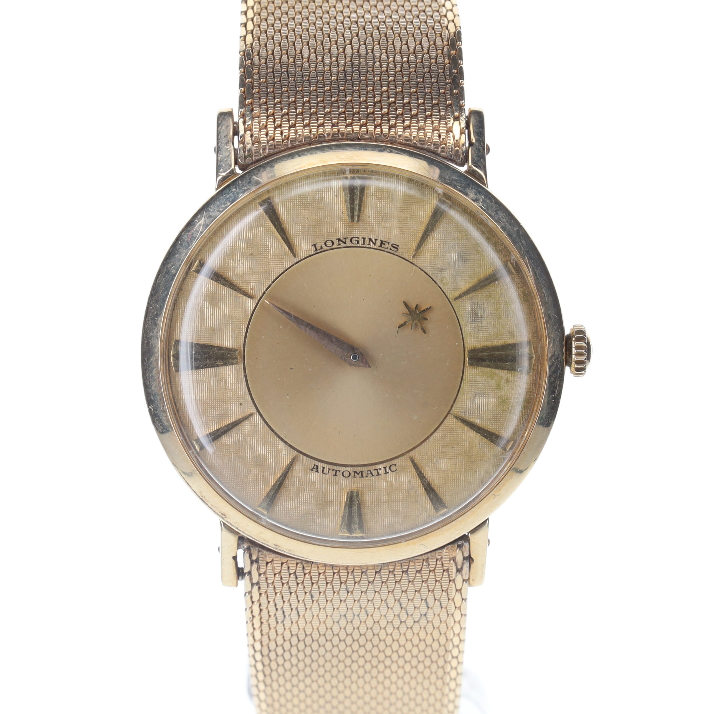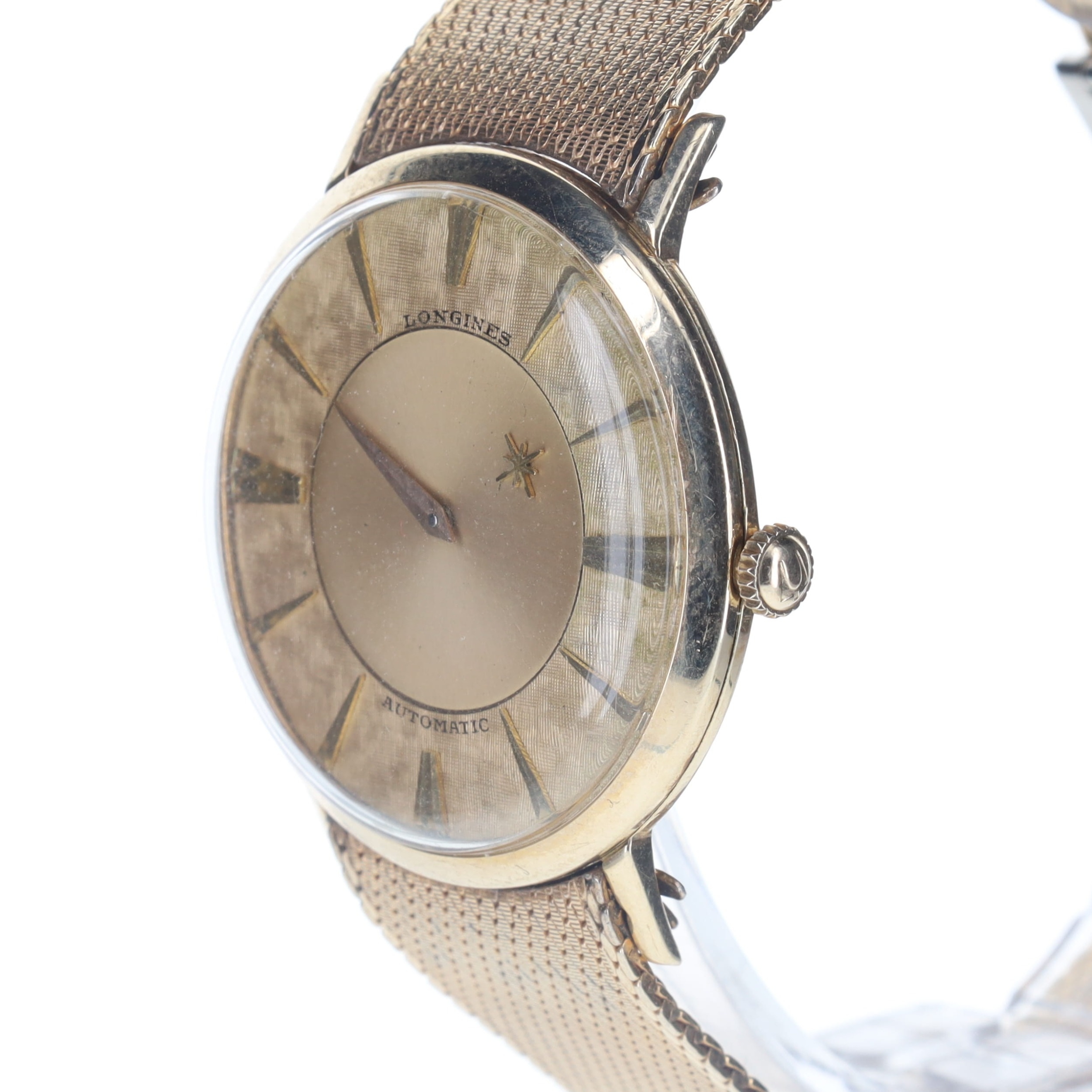 Longines - Vintage Mystery Dial 10k Gold Filled Automatic Watch. Longines Cal. 19A automatic movement. 10k gold filled case, gold plated bracelet. Acrylic crystal. The crown on this watch has been replaced. Champagne mystery dial with gold hands and hour markers. Watch is in full working order, no box or papers included.