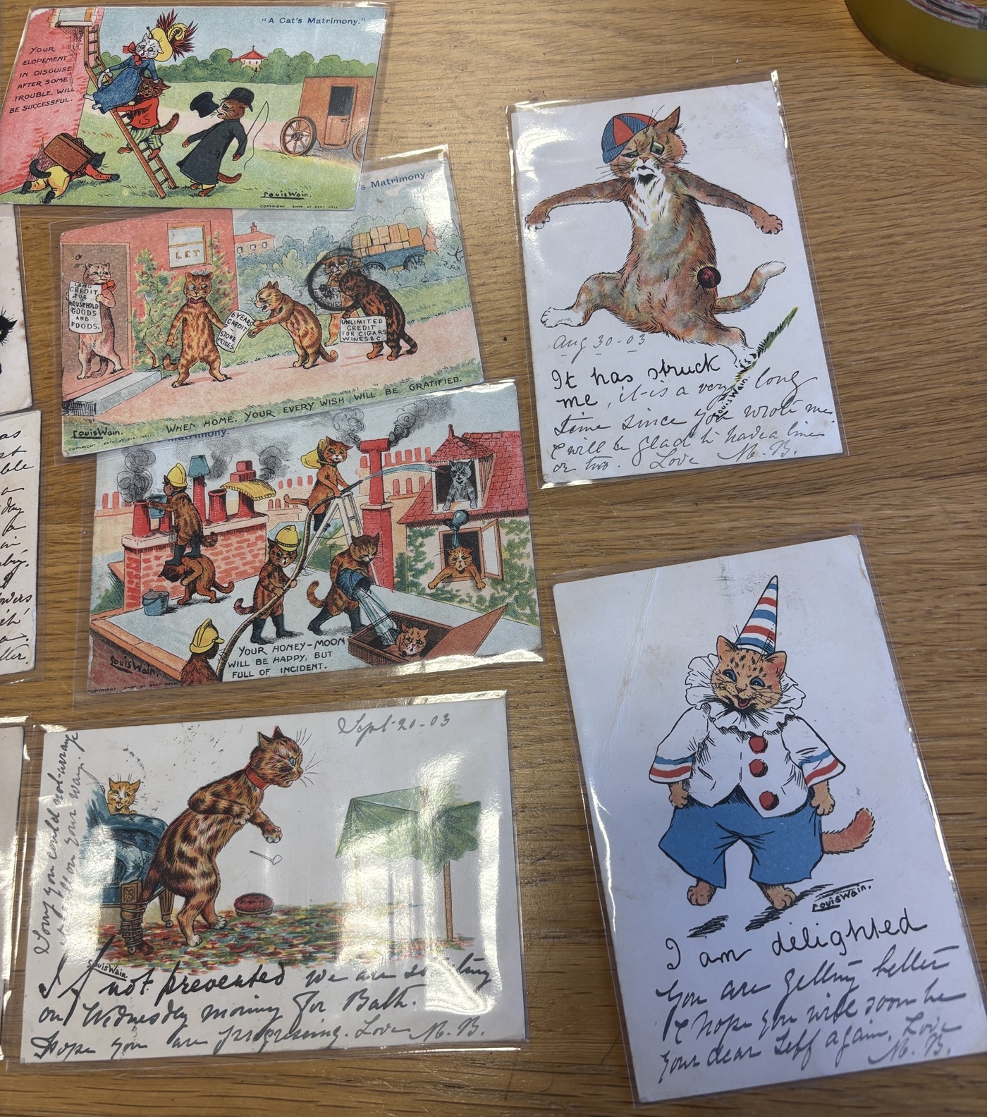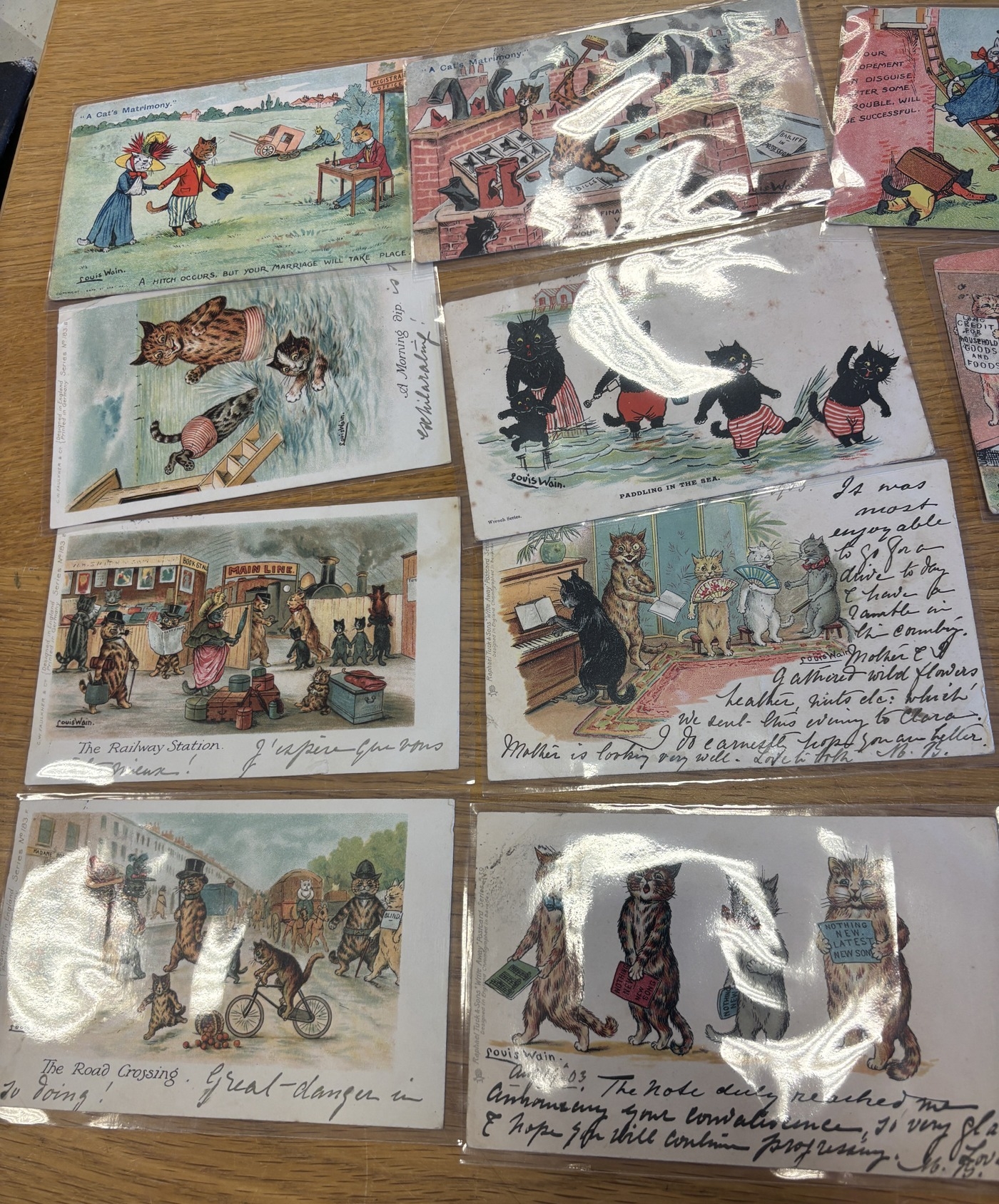 Artists. Louis Wain. Loose coln. incl. Tuck 'Write Away' (2), Faulkner No. 183 (3), Wrench, P.M. 'Start Off', Davidson 'A Cats Matrimony' (5) and others (2). Qty 13. (R)