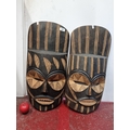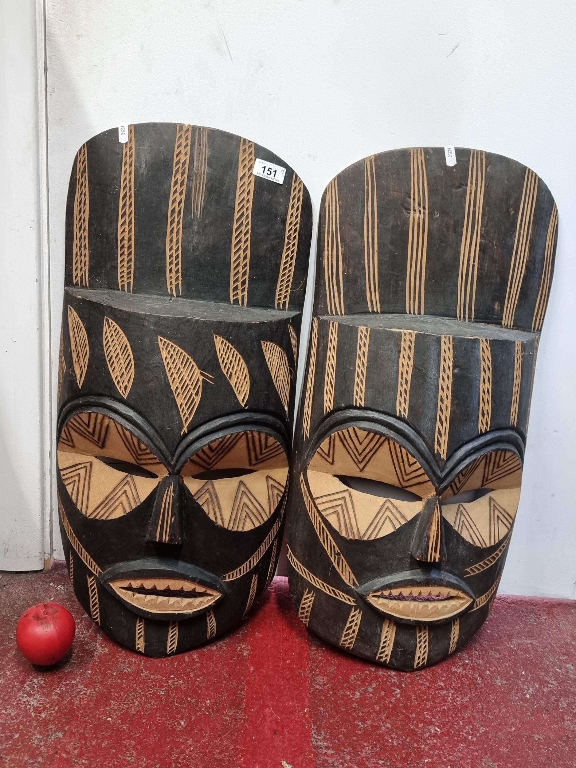 A pair of striking large hand carved African tribal masks. Would look great wall mounted.
