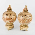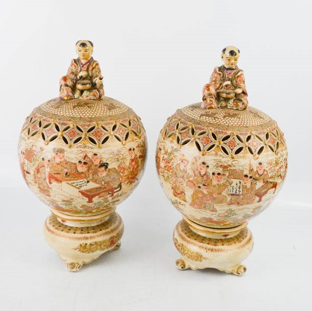A pair of 19th century Satsuma pastel burners in the form of a Japanese boys playing drums, 27cm high.