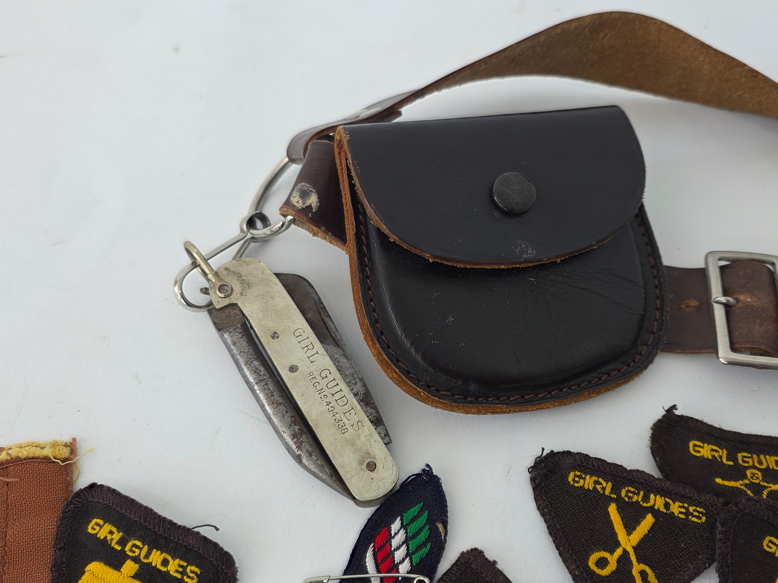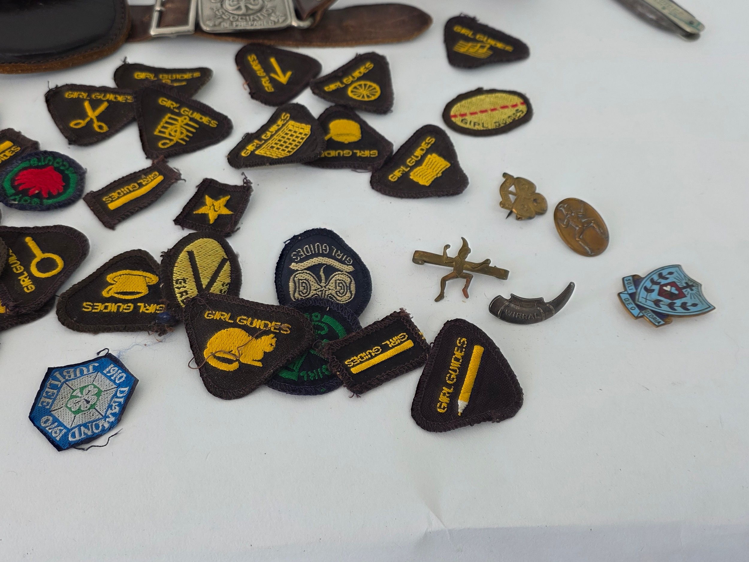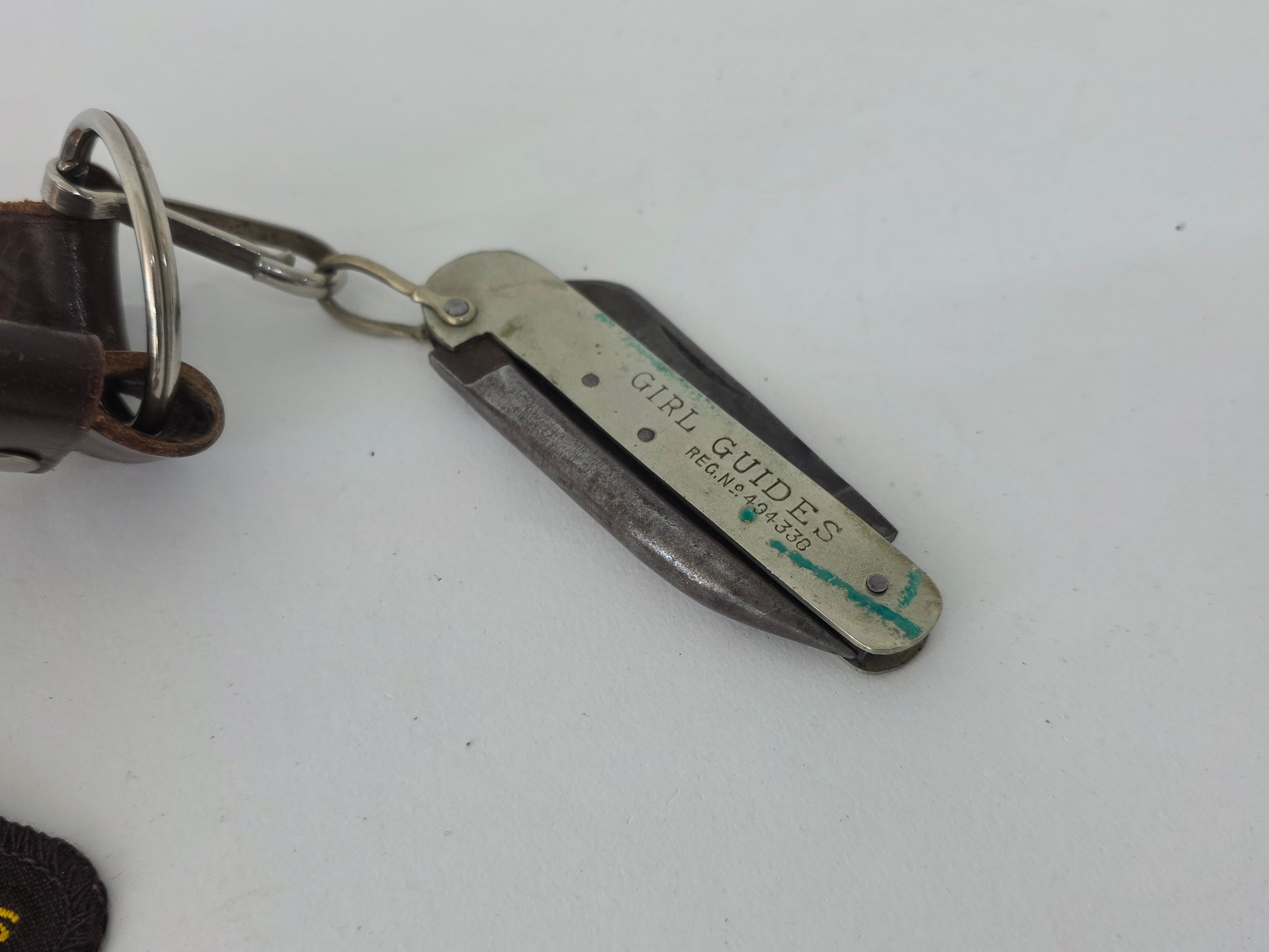 Girl Guides Association. A mixed lot of 1950's Girl Guide items to include a Bukta made belt and buckle, 2 knives, a purse and a collection of sew on and metal badges