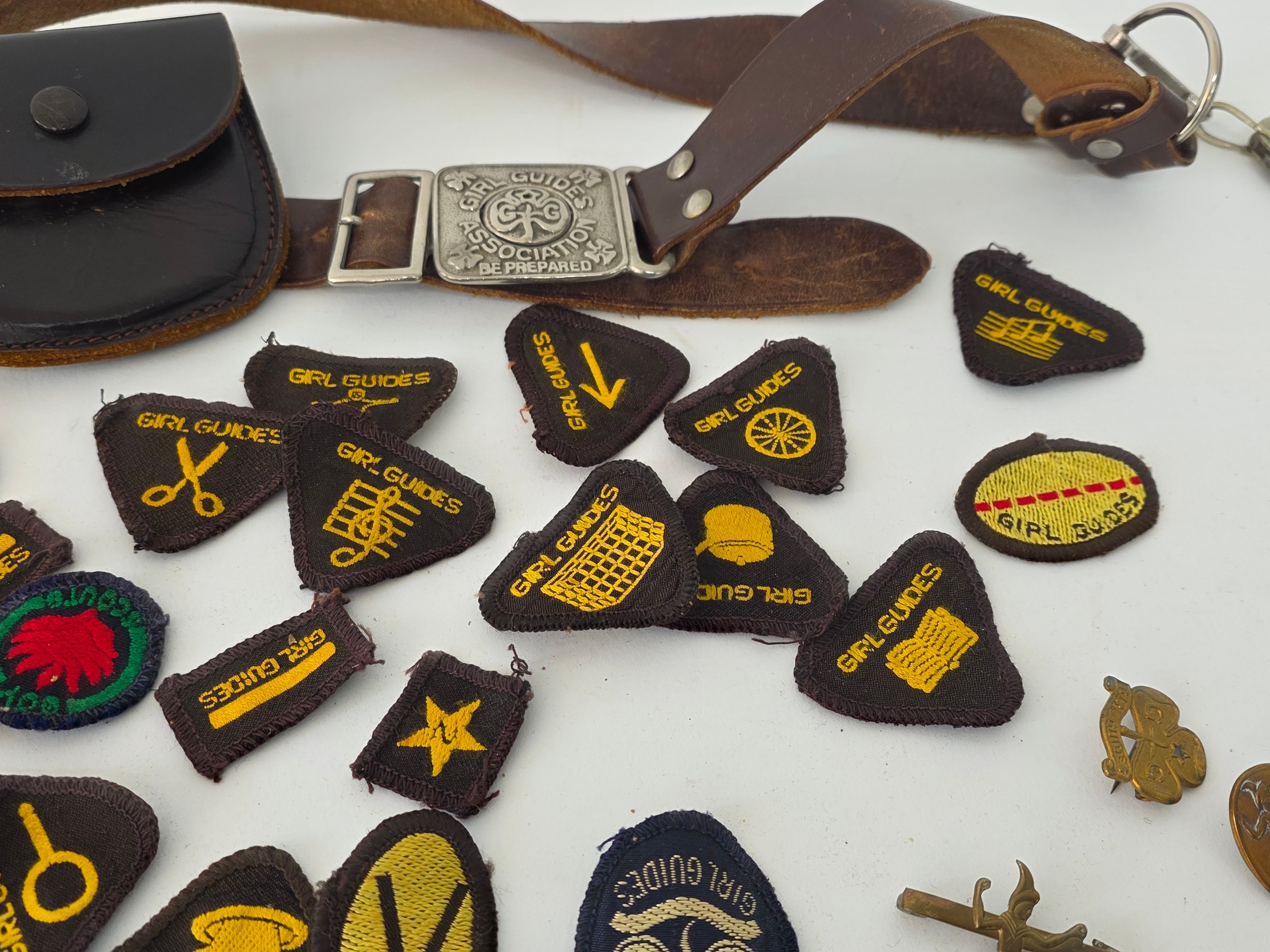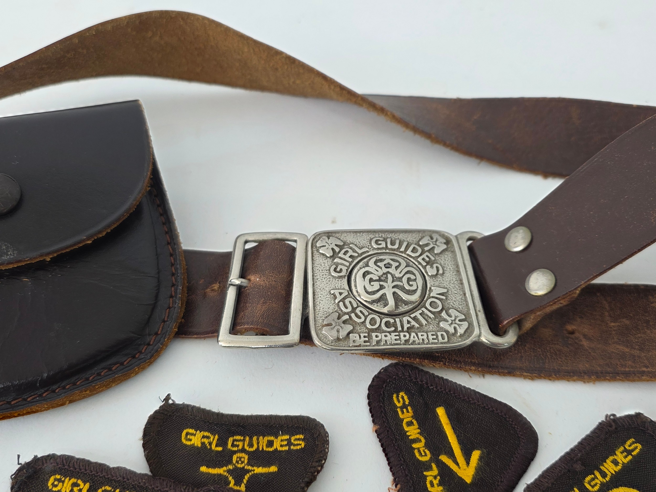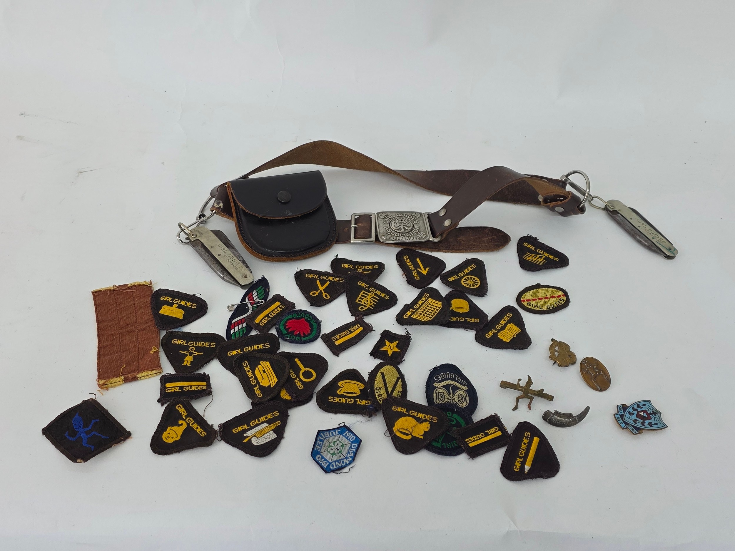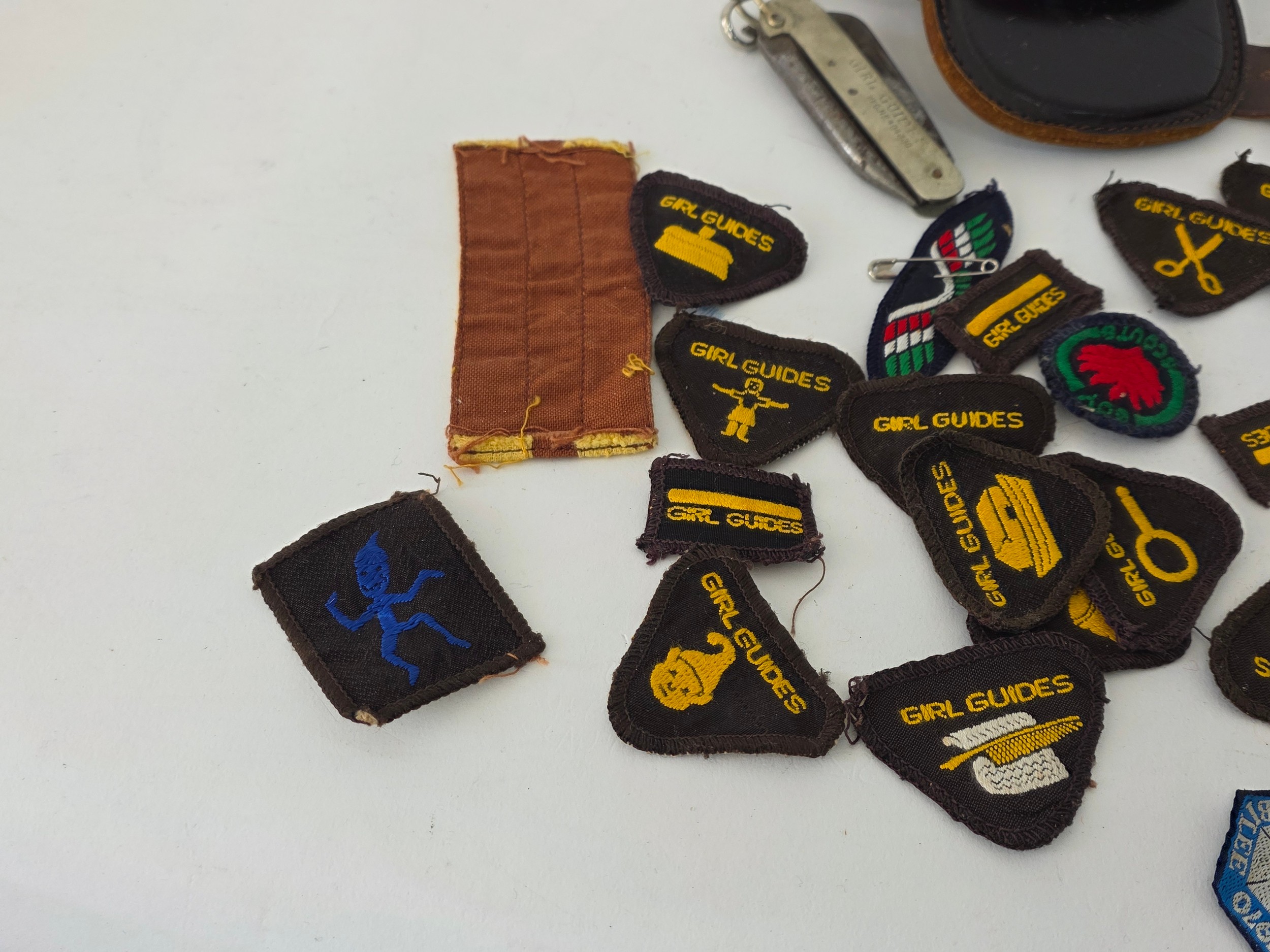 Girl Guides Association. A mixed lot of 1950's Girl Guide items to include a Bukta made belt and buckle, 2 knives, a purse and a collection of sew on and metal badges