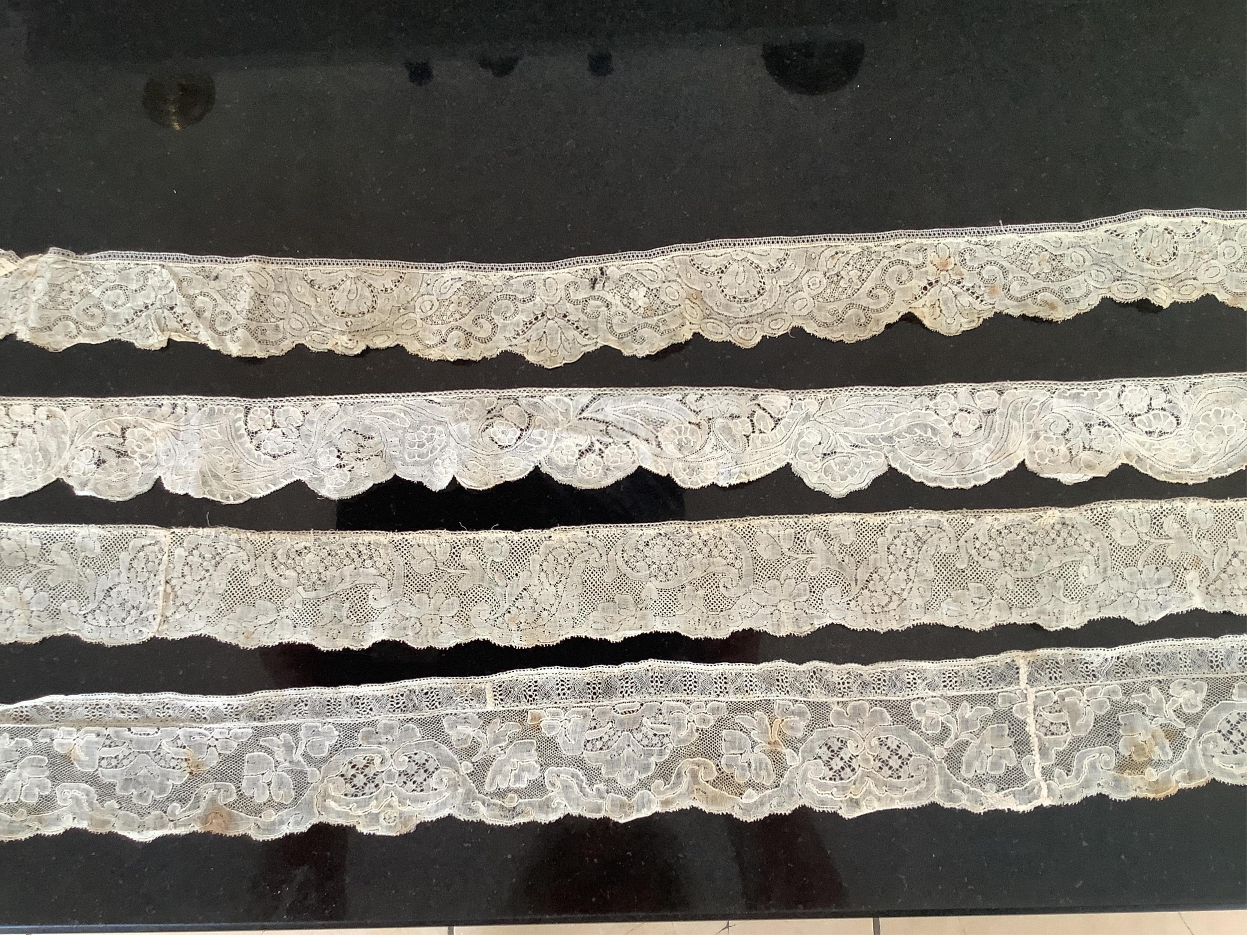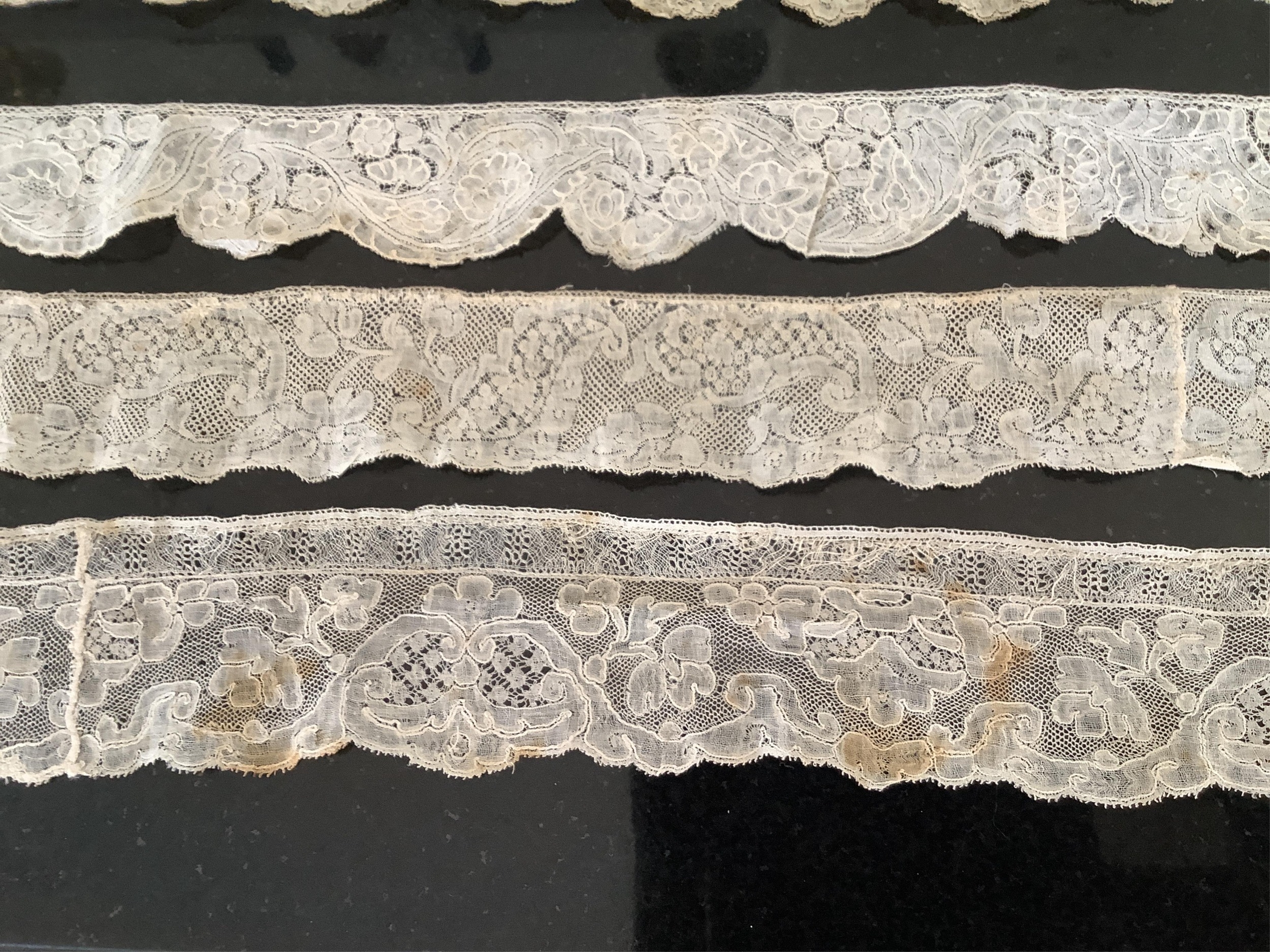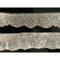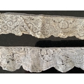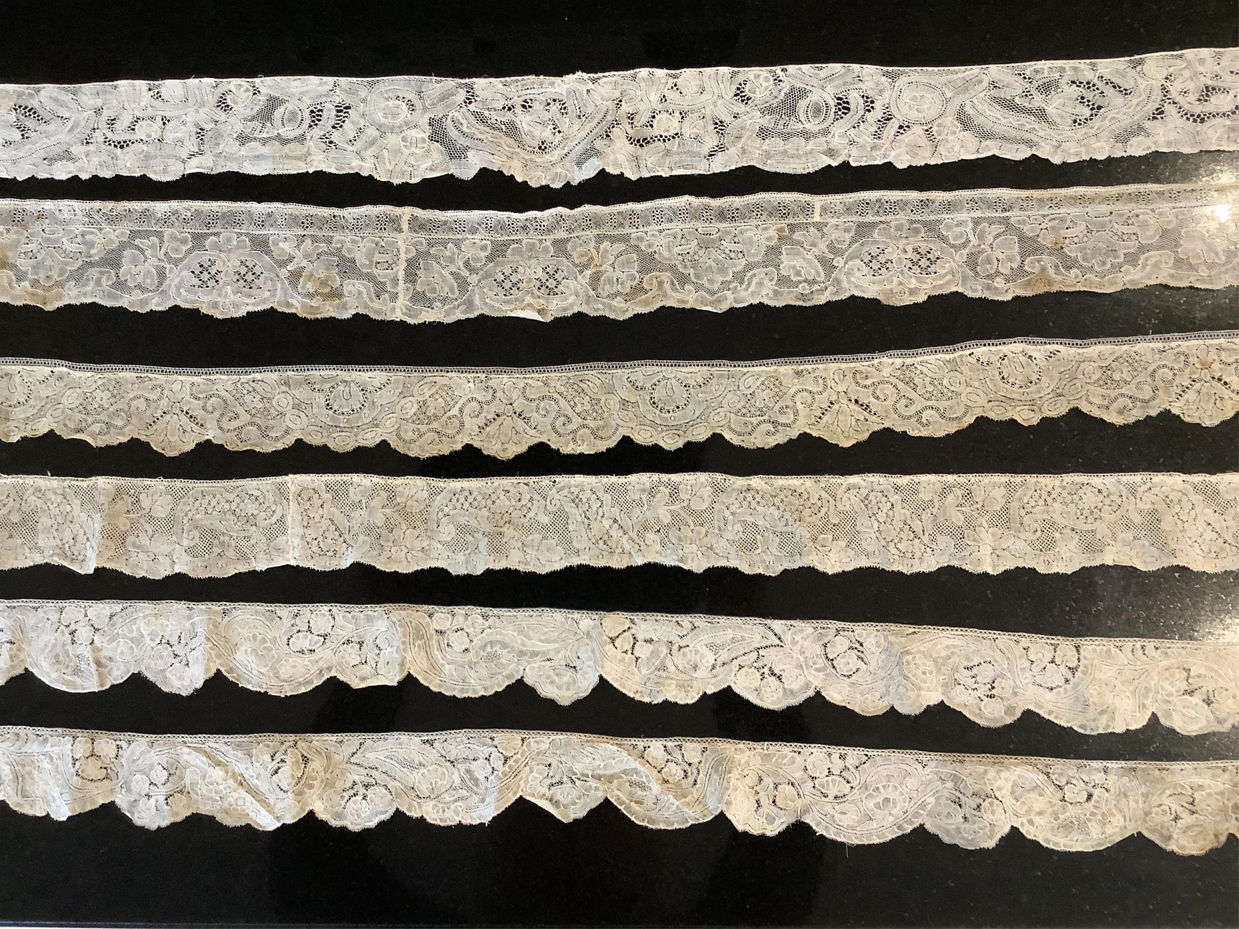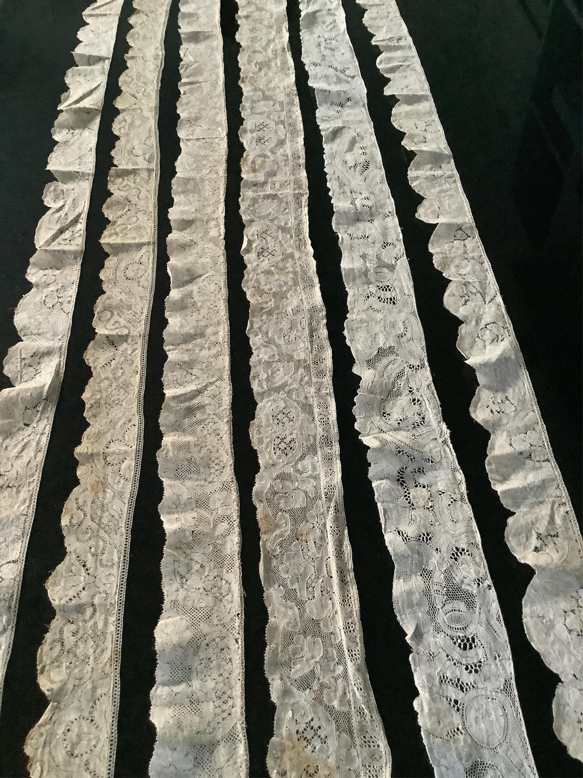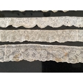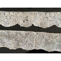 For lace collectors; a collection of six mixed 18th century Flemish lengths of fine ornate bobbin lace trims; Valenciennes, Mechlin and Binche, together with five similar, short, much narrower bobbin lace trims, longest length 166cm x 5.5cm wide