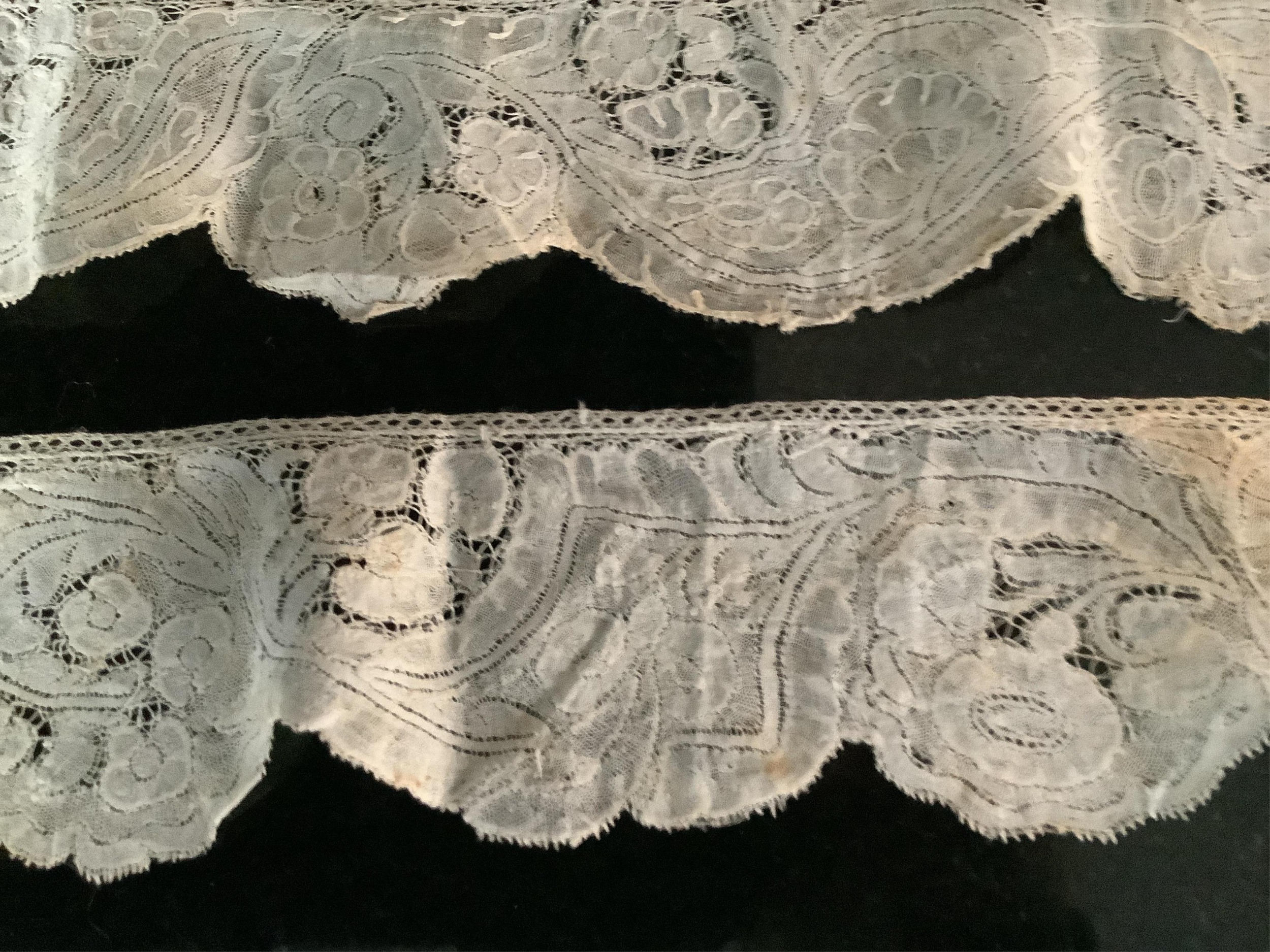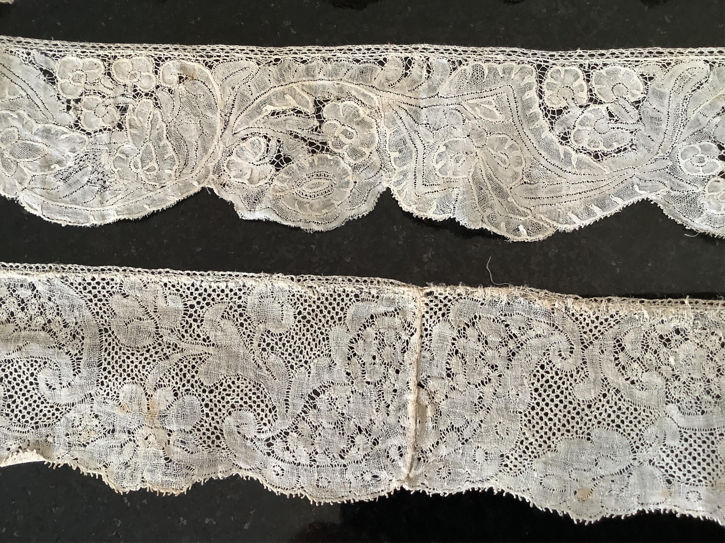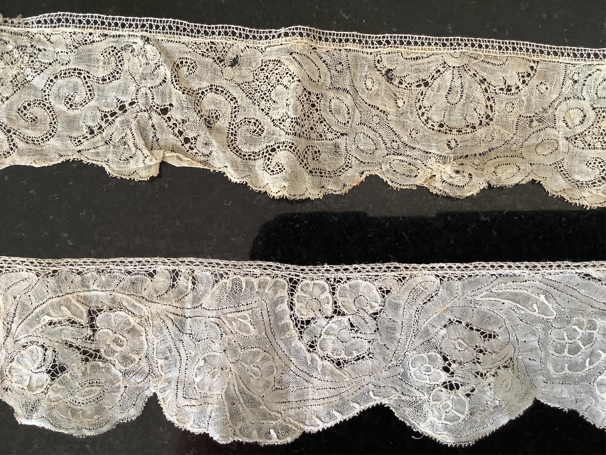 For lace collectors; a collection of six mixed 18th century Flemish lengths of fine ornate bobbin lace trims; Valenciennes, Mechlin and Binche, together with five similar, short, much narrower bobbin lace trims, longest length 166cm x 5.5cm wide