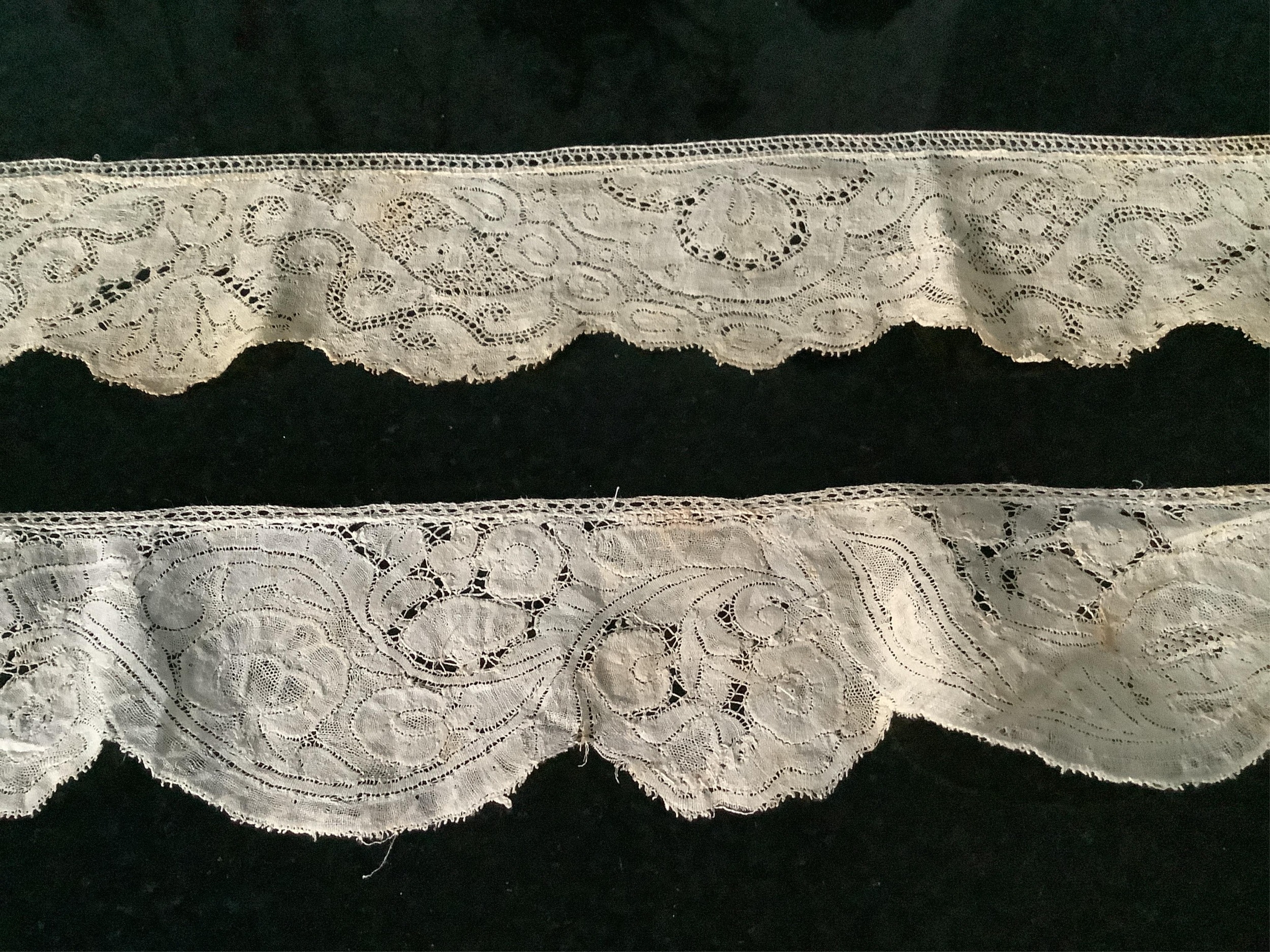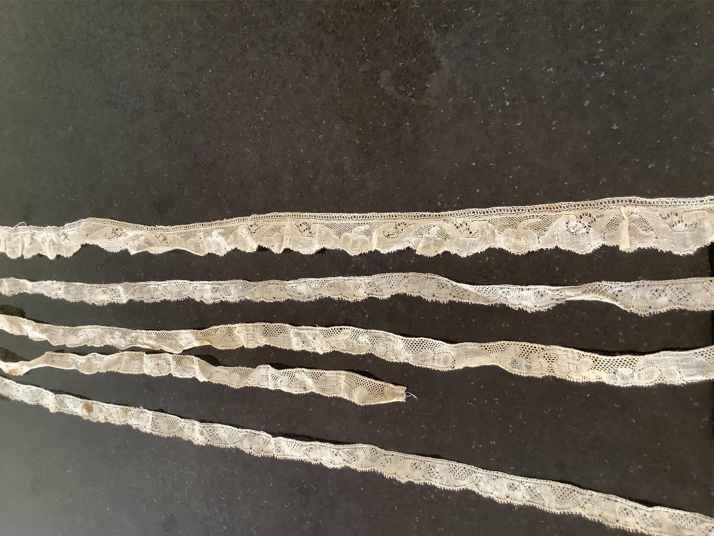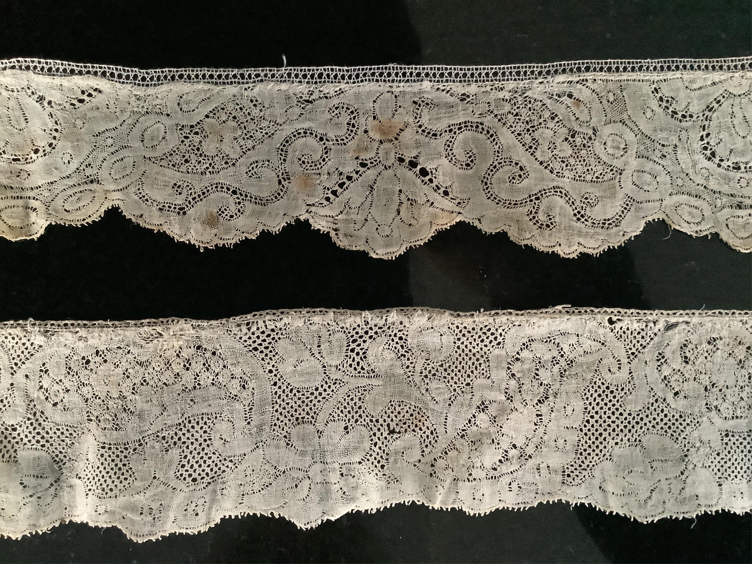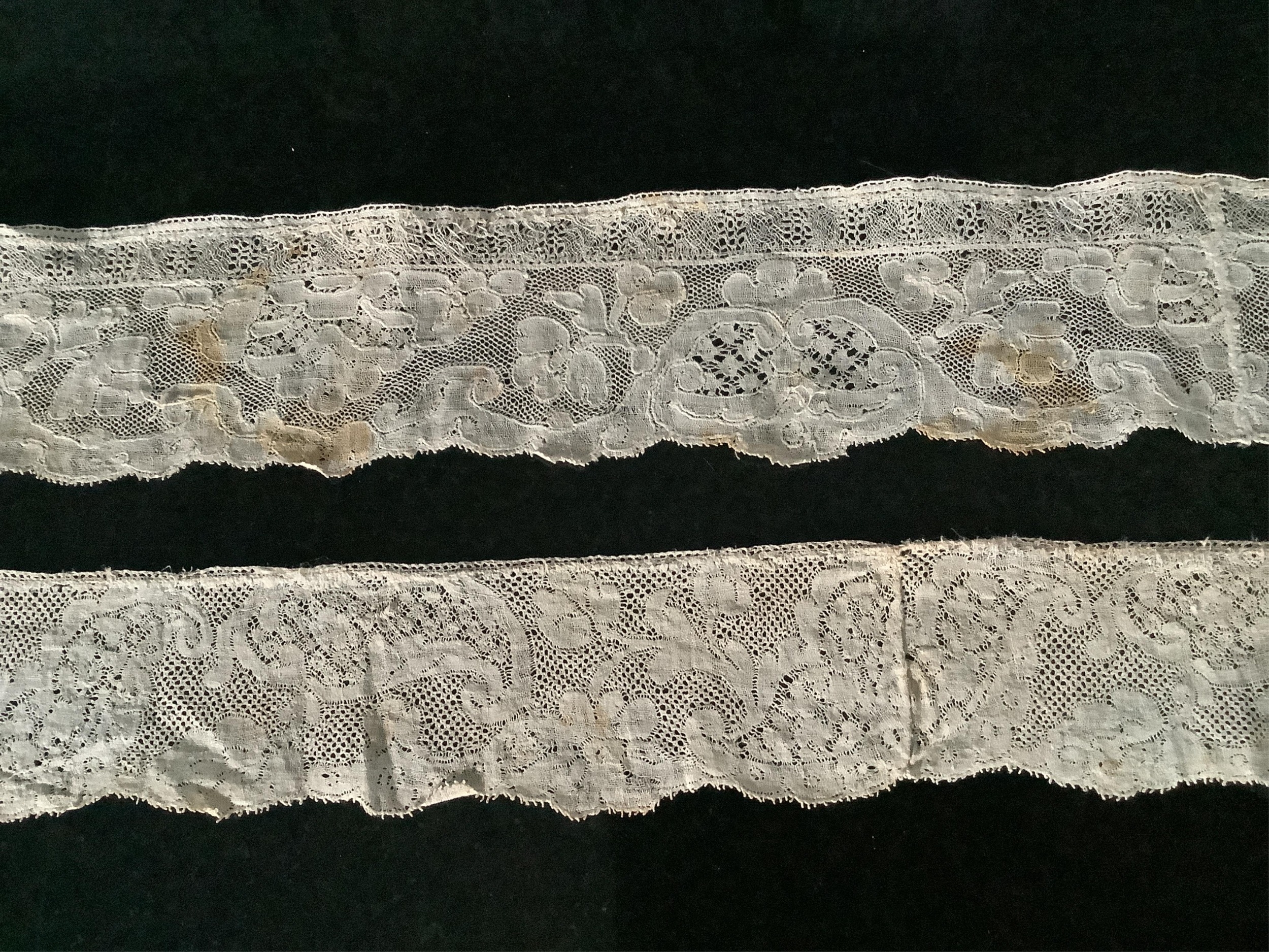 For lace collectors; a collection of six mixed 18th century Flemish lengths of fine ornate bobbin lace trims; Valenciennes, Mechlin and Binche, together with five similar, short, much narrower bobbin lace trims, longest length 166cm x 5.5cm wide